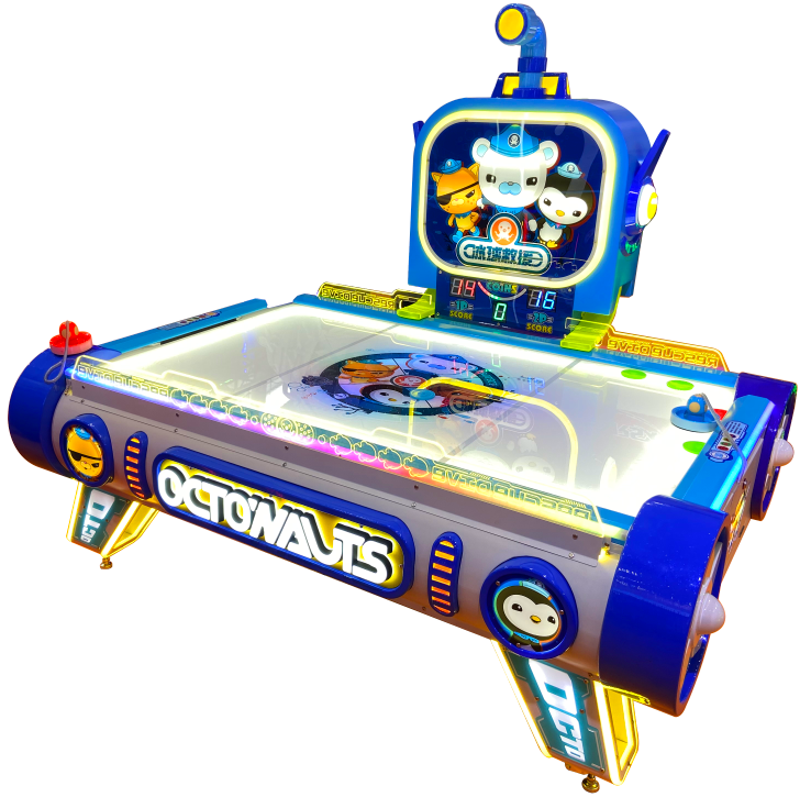 Multi pucks, redemption, detected sensor in border for sound effect. It's a kid-size air hockey game with best visual and experience setting, newest with mordern look. It has integrated LED scoreboard sits atop a cute character backboard. Smooth, rounded lines and a child‑friendly scale combine playful charm with a high‑tech look.