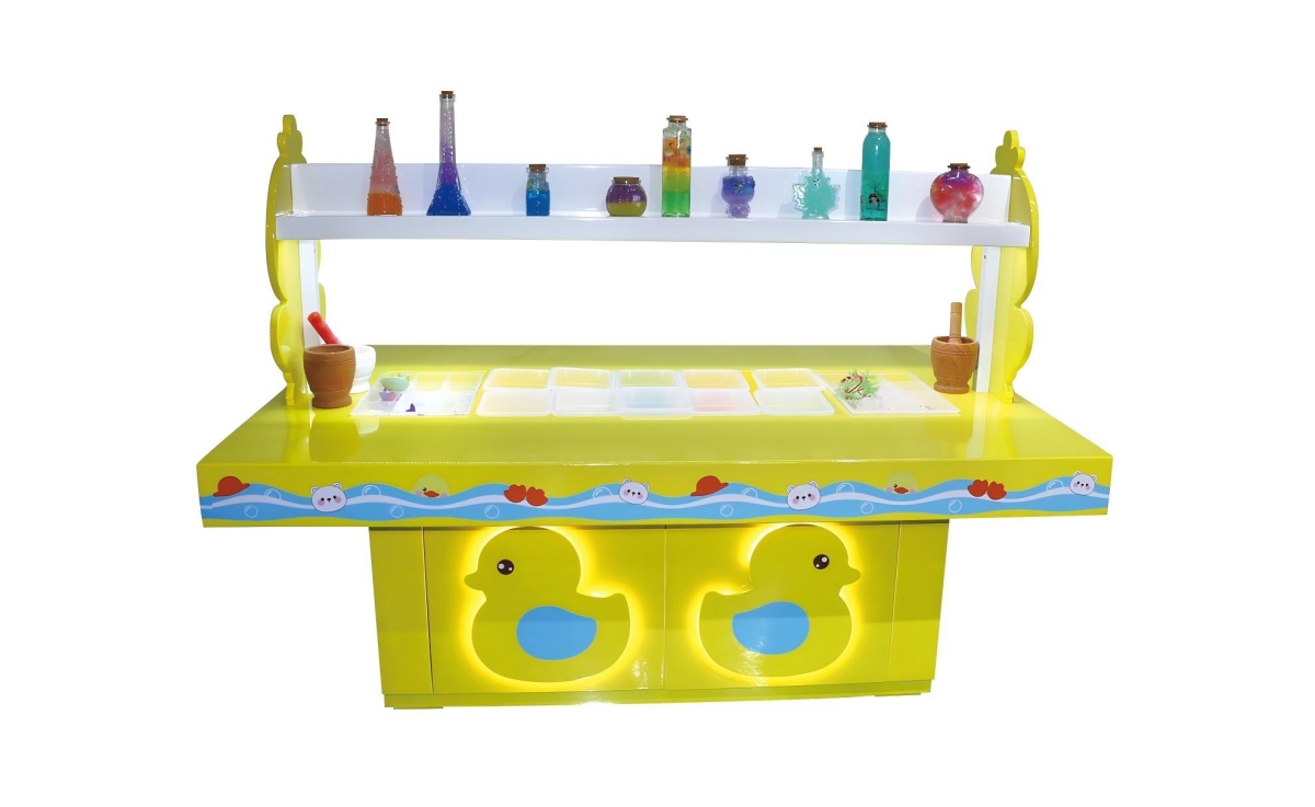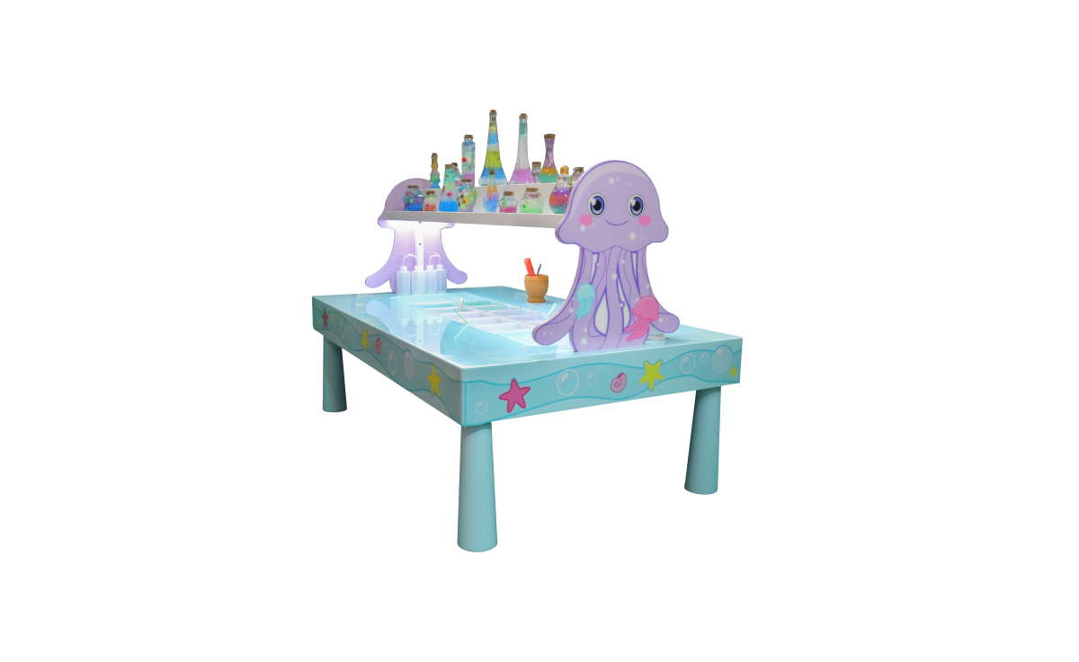 DIY Slime table contains multi-compartment clear bins & hanging buckets organize crystal beads, glitter, and decorations; spacious tabletop with color-mixing wells for popping beads and blending hues; built-in LED lighting and bottle storage—kids create and take home their one-of-a-kind slime masterpieces.