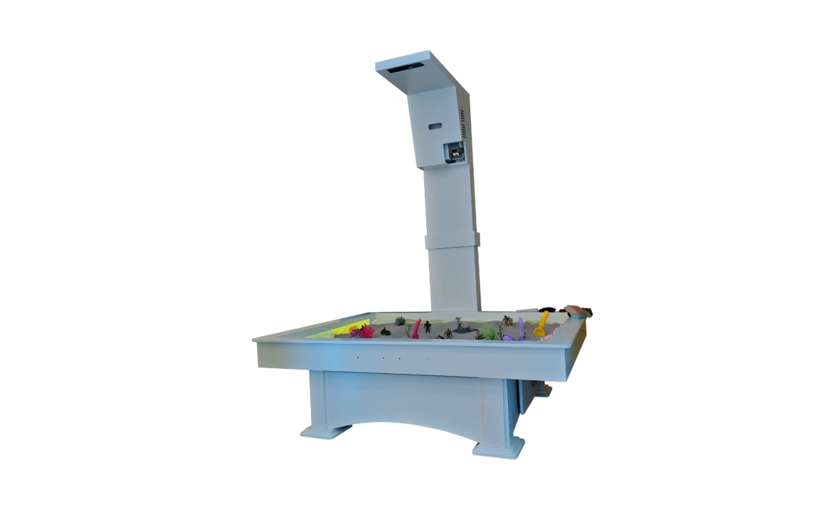 Durable metal table features a high-definition projector and depth-sensing cameras. The projected images change in real time to show the effects of ocean, beach, land, hills and mountains as the height of the sand pile increases. The style is fresh and educational. There are three scene options in total.