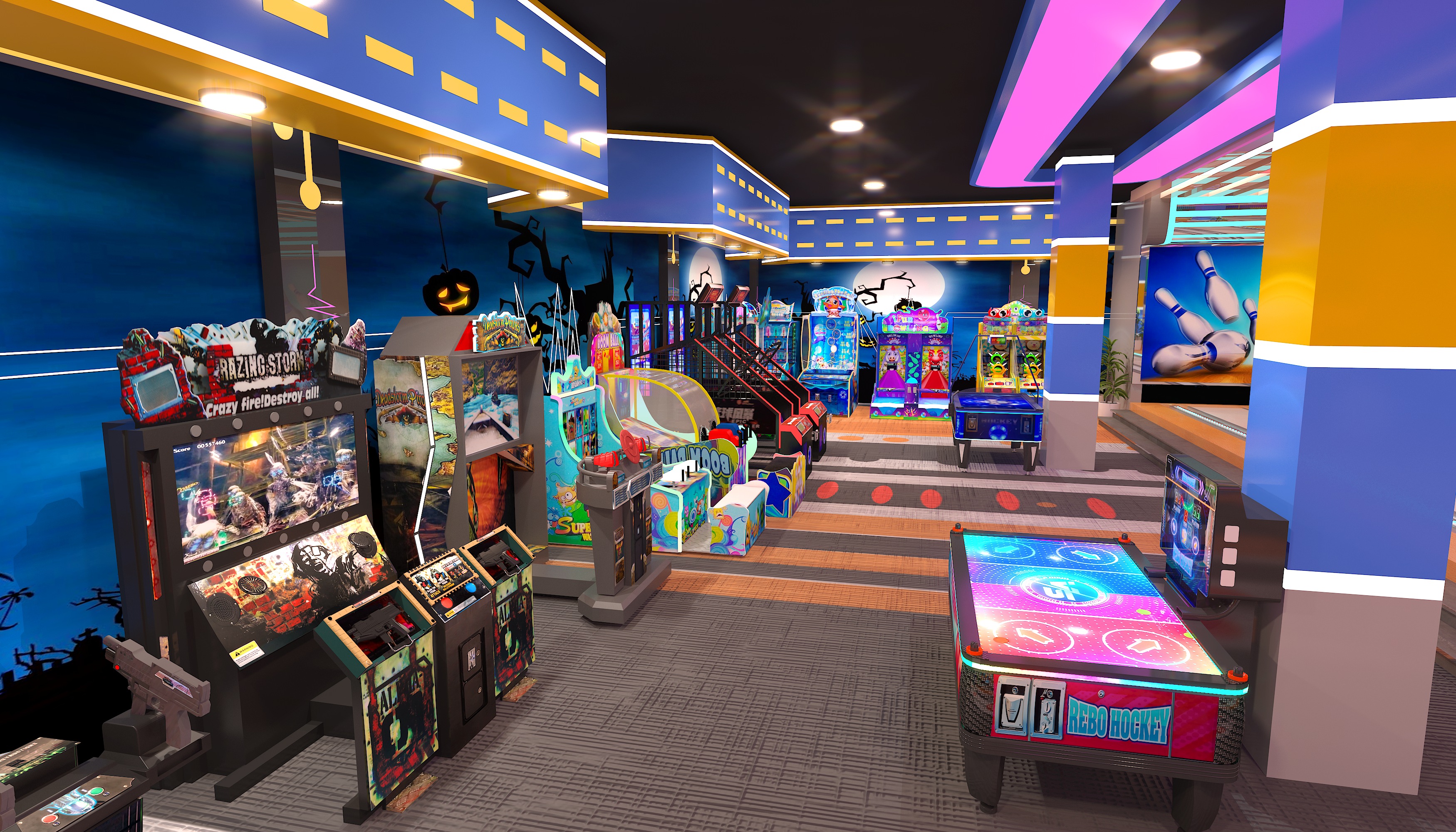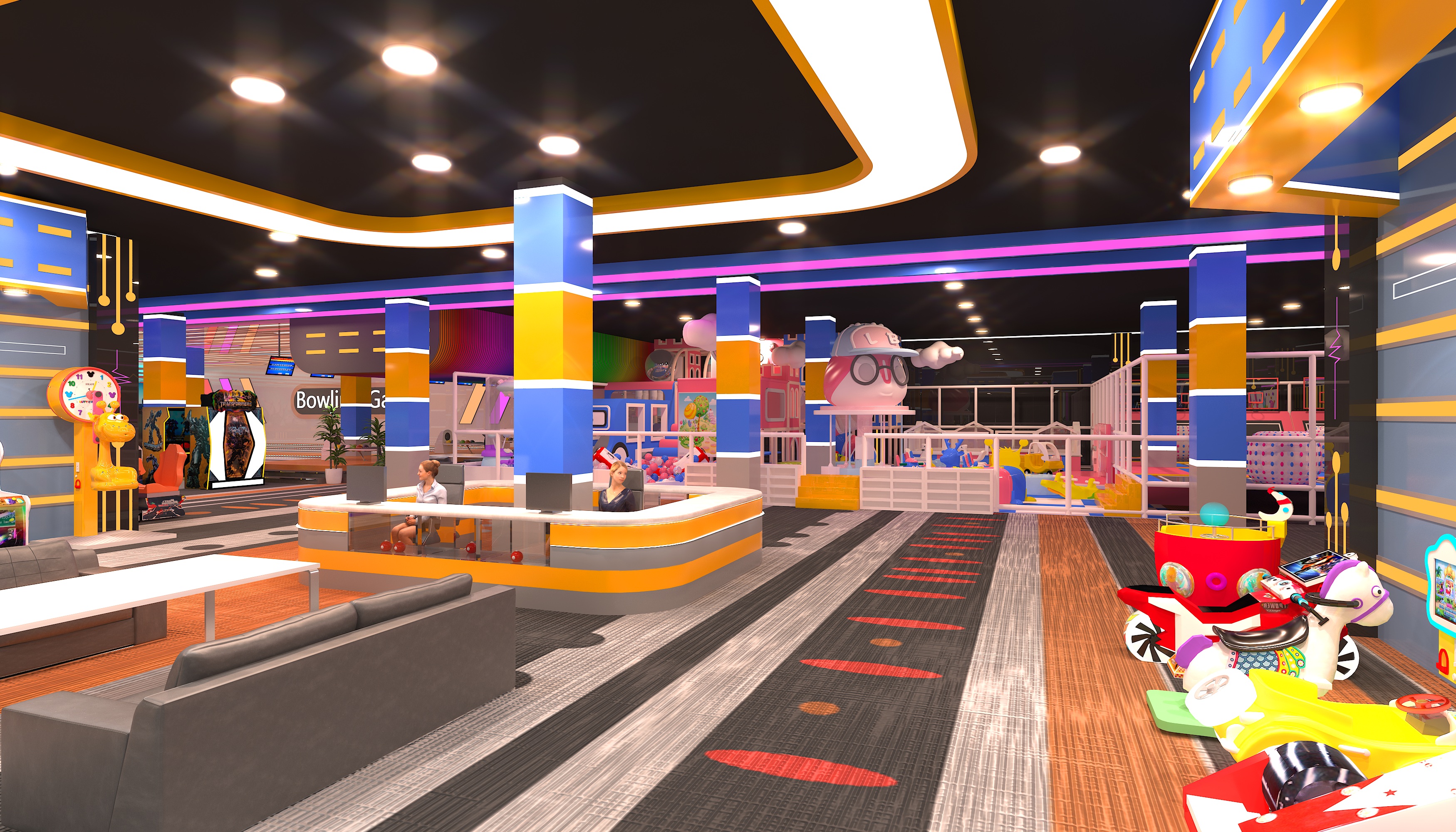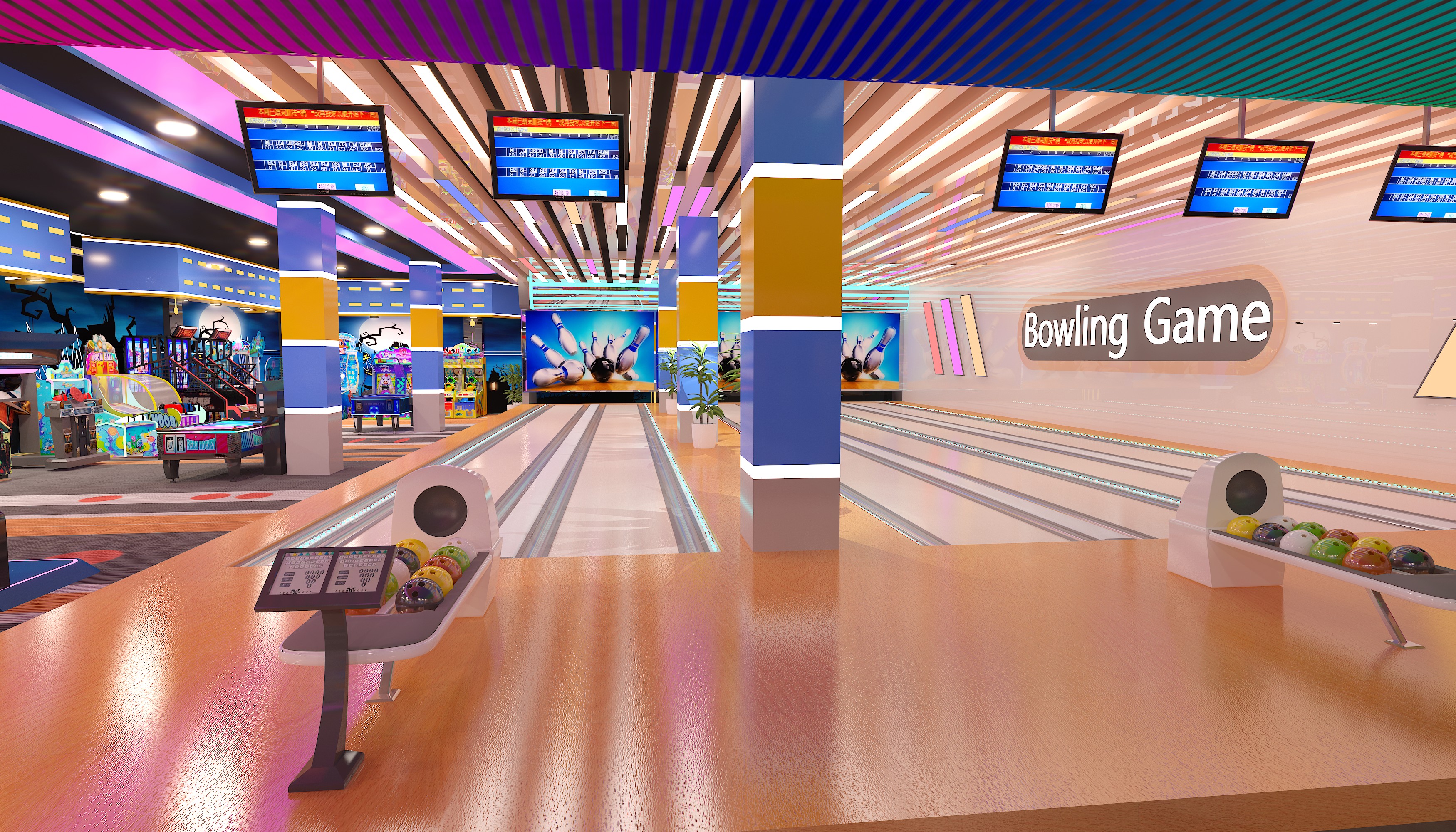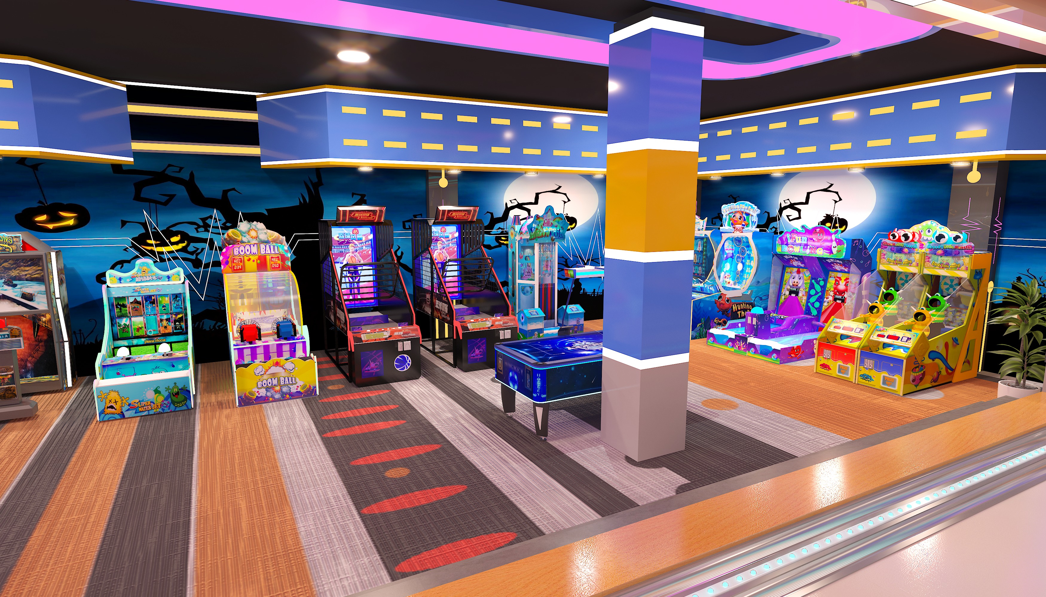 The style mixes trendy sports vibe with light - themed immersion. The bowling area has a cyber - colorful look, and the arcade zone features themed murals like Halloween, making it a sports - themed hangout for young people. Key equipment includes bowling lanes (with smart scoring and colorful balls, great for competitive socializing) and arcades like basketball shooters/racing simulators (for interactive gaming, covering short - time play). It’s a social - focused sports entertainment complex. With low - cost design, it suits both friend competitions and family outings. Perfect for hanging out with pals or bringing the family.