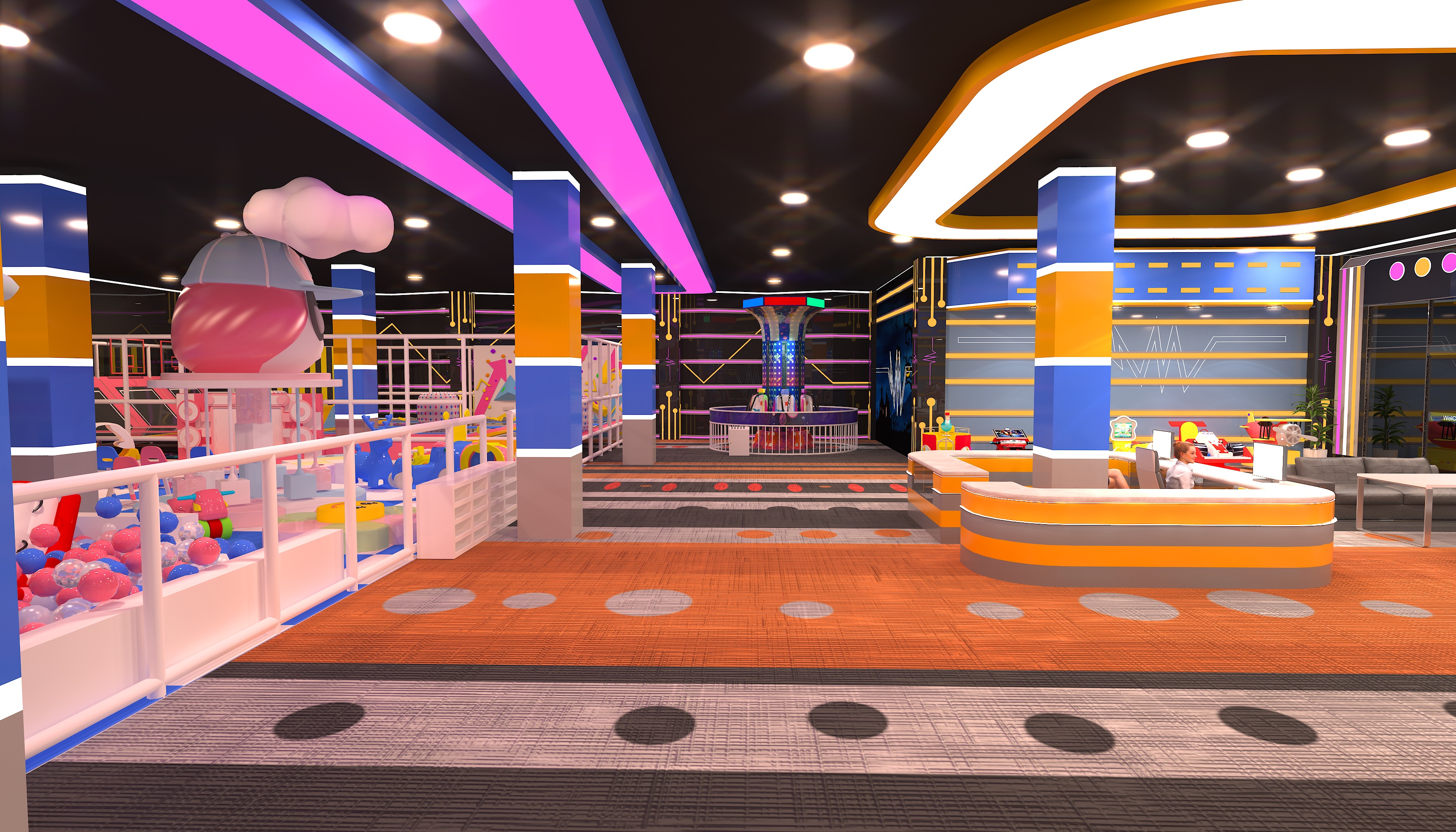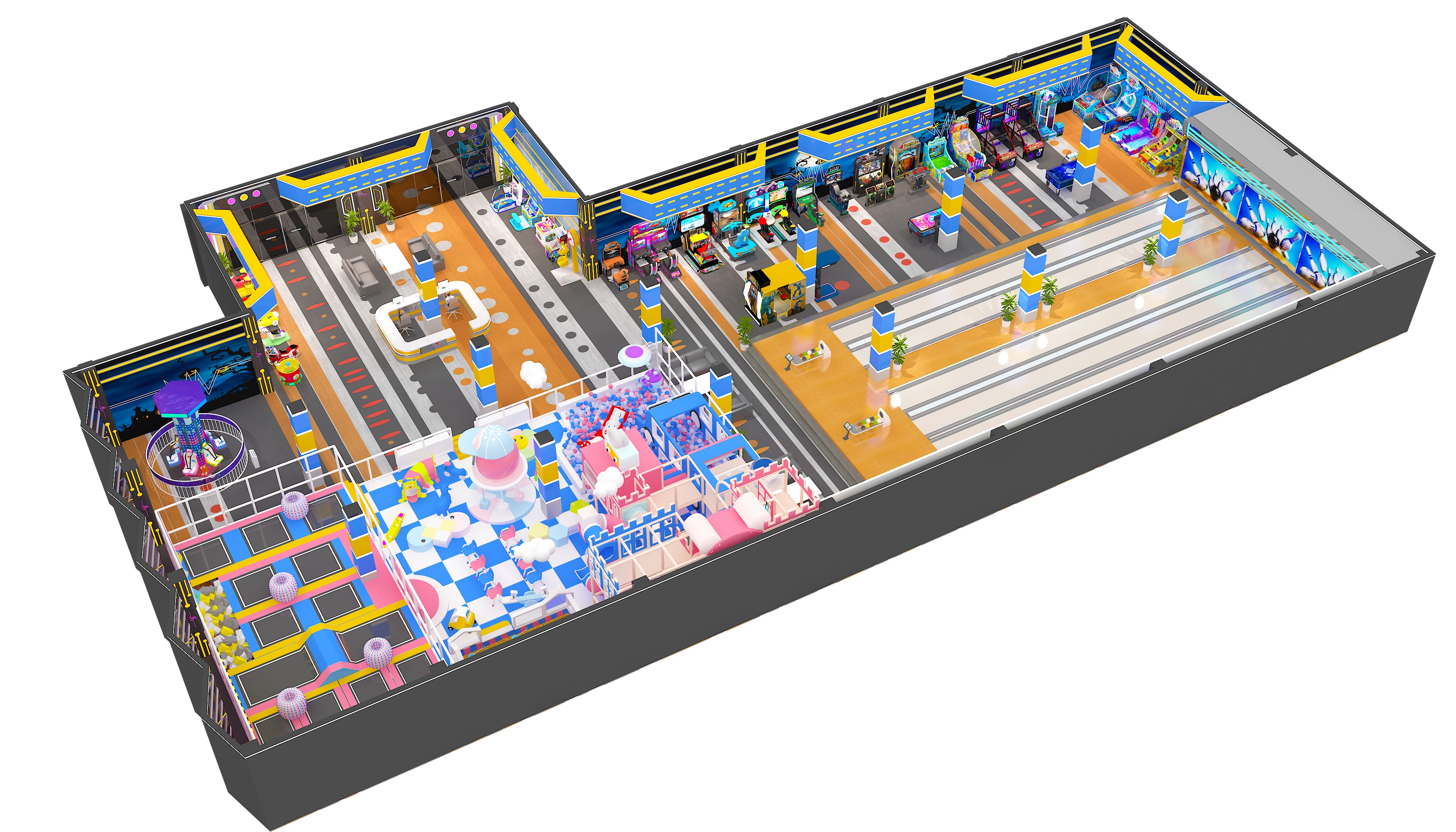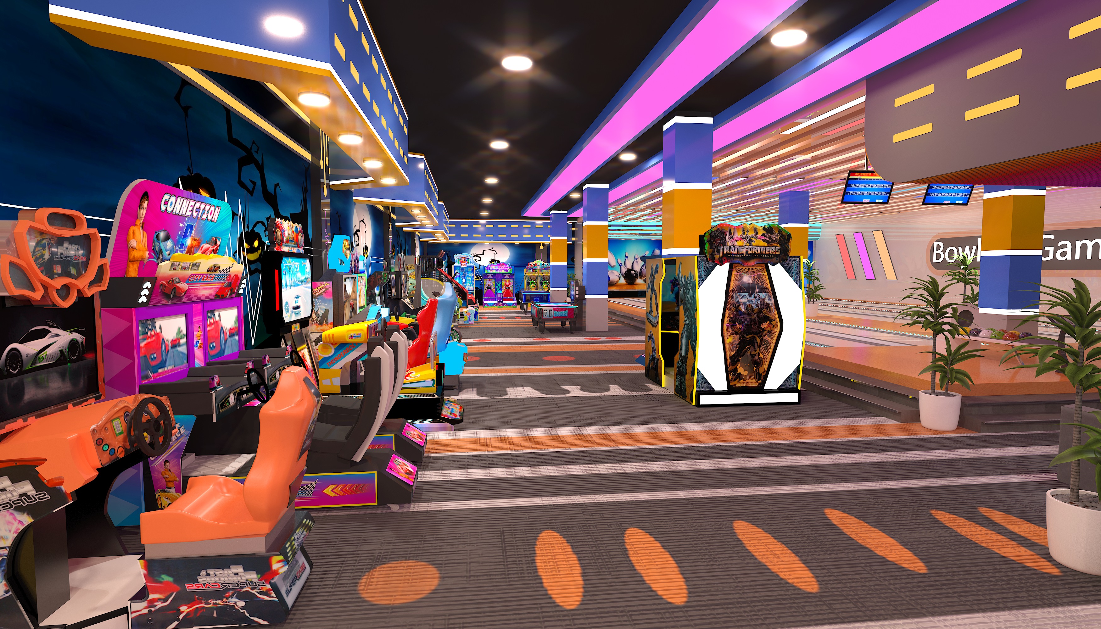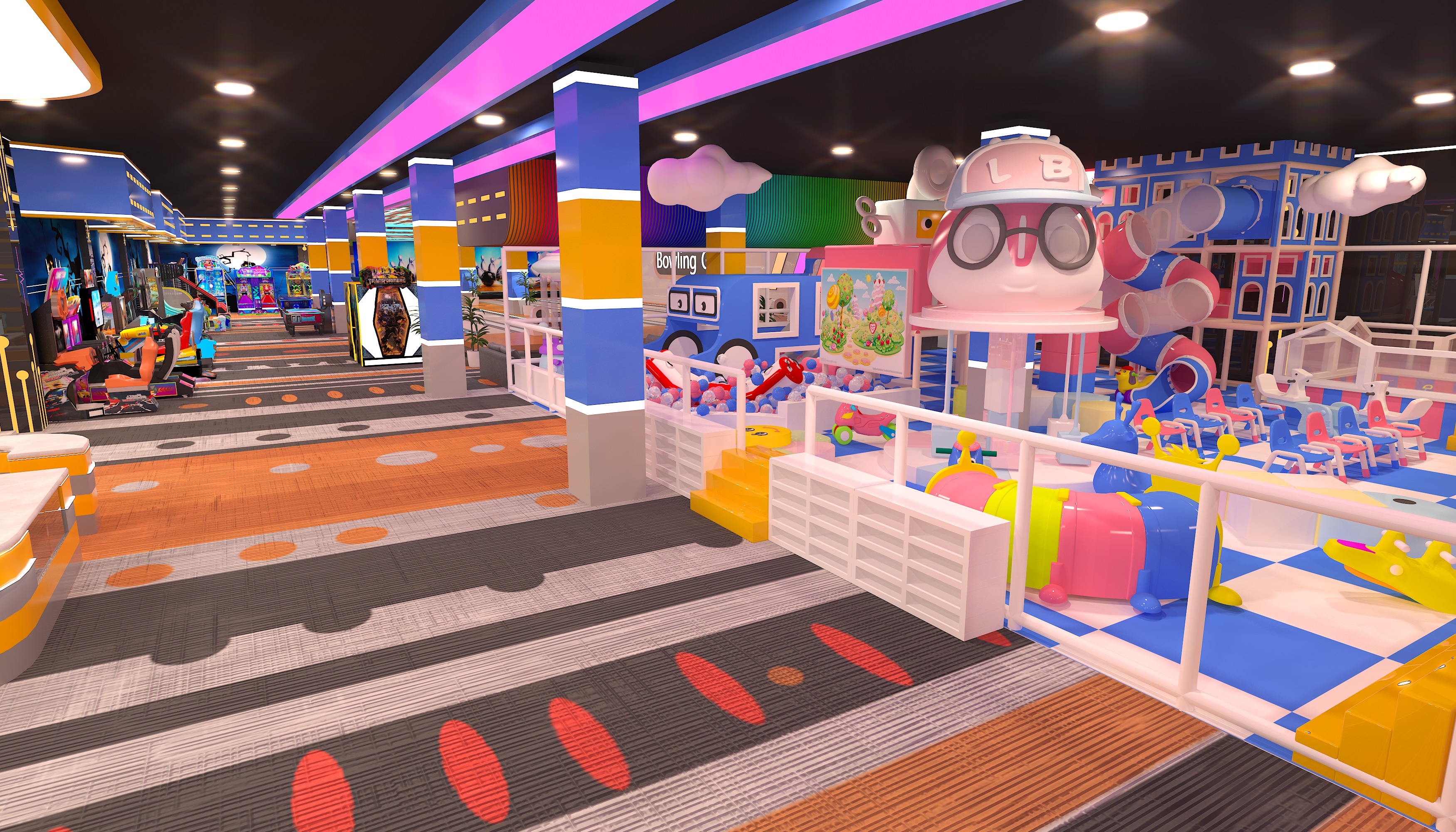 The style mixes trendy sports vibe with light - themed immersion. The bowling area has a cyber - colorful look, and the arcade zone features themed murals like Halloween, making it a sports - themed hangout for young people. Key equipment includes bowling lanes (with smart scoring and colorful balls, great for competitive socializing) and arcades like basketball shooters/racing simulators (for interactive gaming, covering short - time play). It’s a social - focused sports entertainment complex. With low - cost design, it suits both friend competitions and family outings. Perfect for hanging out with pals or bringing the family.