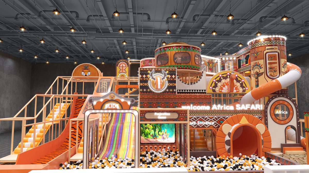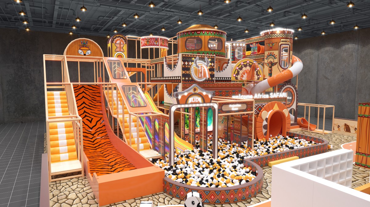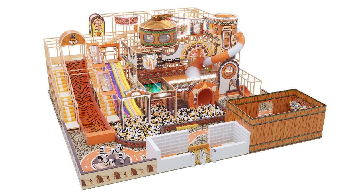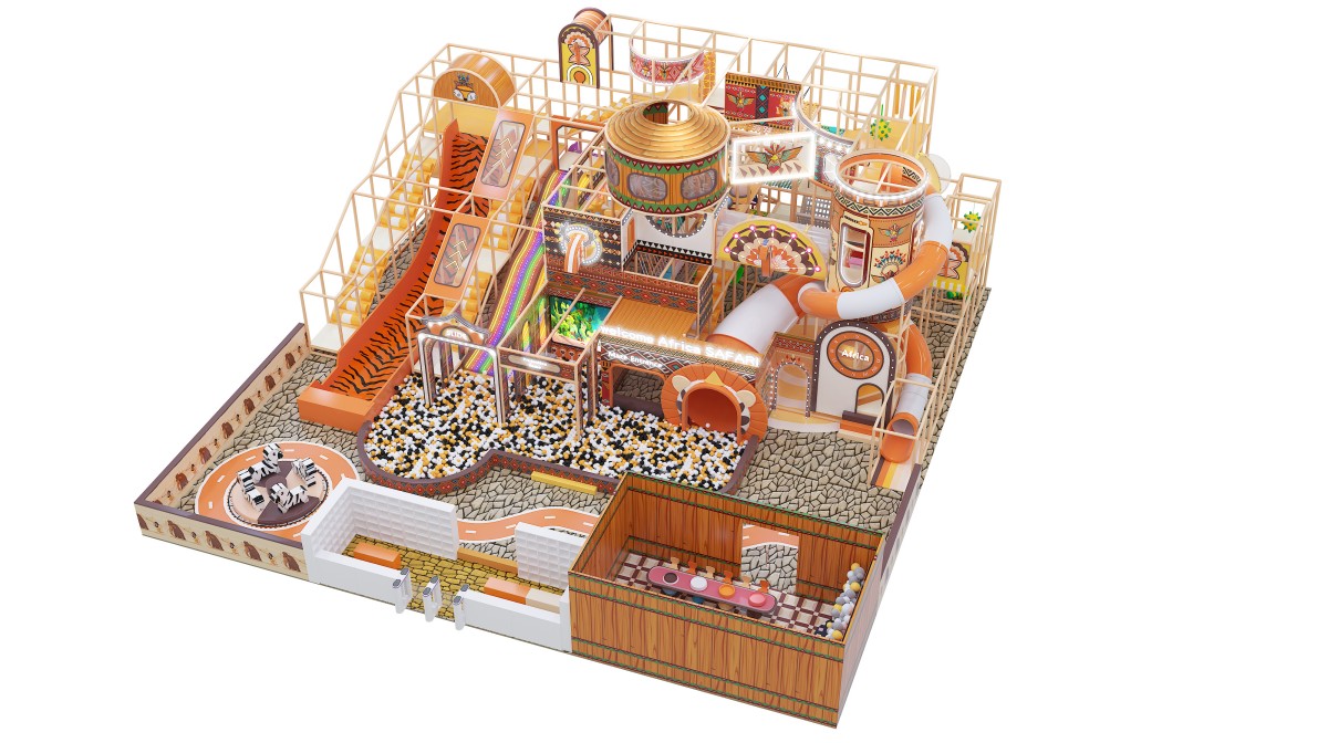 This African safari–themed indoor playground immerses kids in a warm-orange and natural-wood palette, accented with tribal motifs, zebra-print slides, and faux-stone flooring. At the front left, a wooden-walled sand pool and party room provide celebration zone. Mid-left features a zebra-pattern ramp slide, LED rainbow soft-slopes, and a projection-enabled ball pit for sensory thrills. The central multi-level adventure tower, with circular observation pods and spiral and tube slides, plunges older children into a sea of black-white-orange balls. On the right, elevated net bridges and tunnel passages link upper and lower levels for endless exploration.