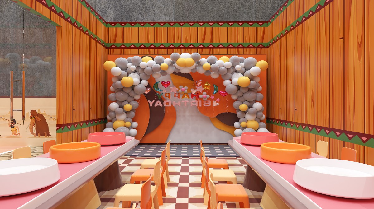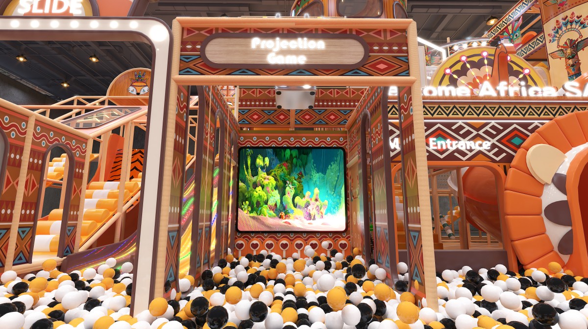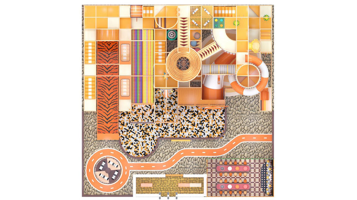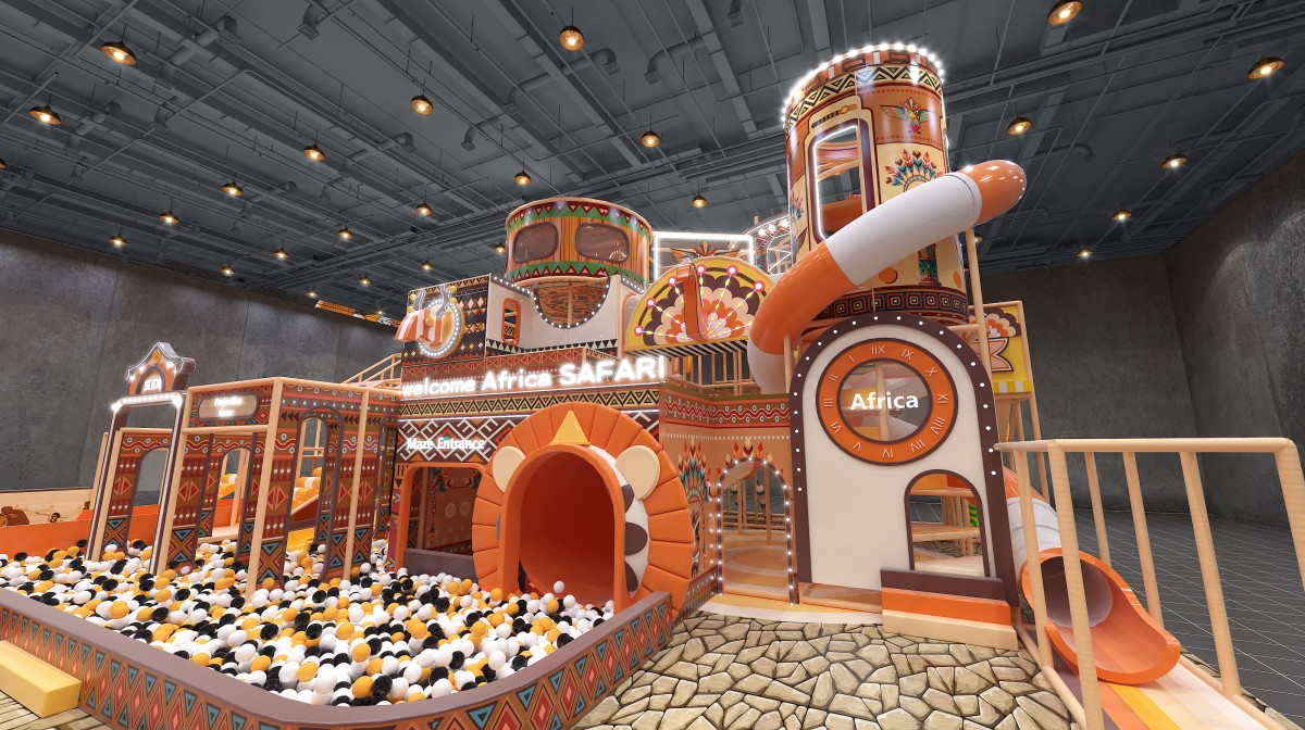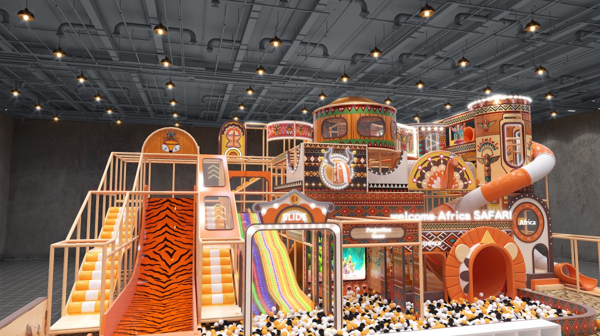 This African safari–themed indoor playground immerses kids in a warm-orange and natural-wood palette, accented with tribal motifs, zebra-print slides, and faux-stone flooring. At the front left, a wooden-walled sand pool and party room provide celebration zone. Mid-left features a zebra-pattern ramp slide, LED rainbow soft-slopes, and a projection-enabled ball pit for sensory thrills. The central multi-level adventure tower, with circular observation pods and spiral and tube slides, plunges older children into a sea of black-white-orange balls. On the right, elevated net bridges and tunnel passages link upper and lower levels for endless exploration.