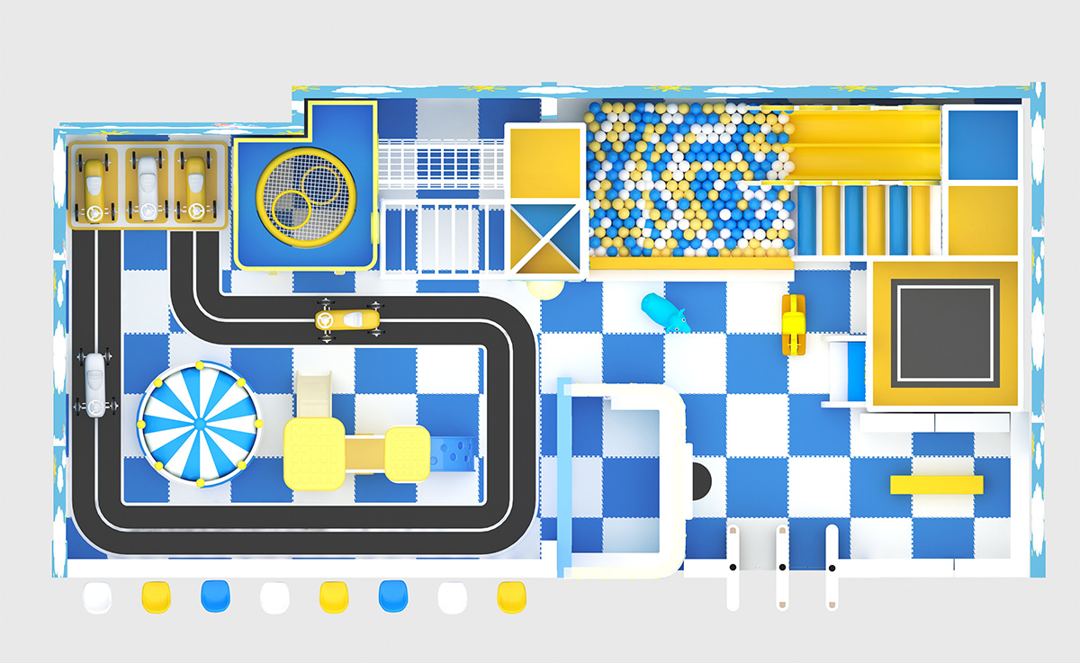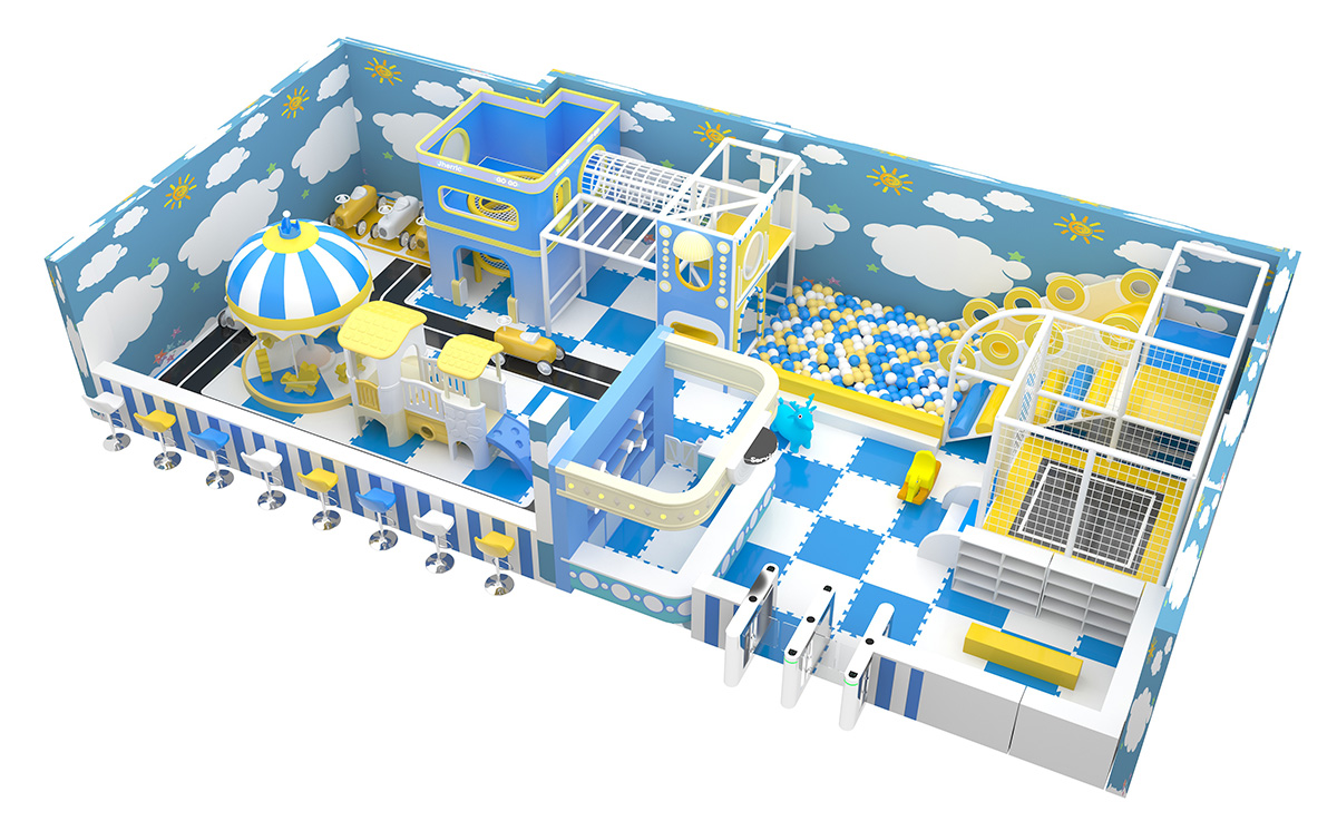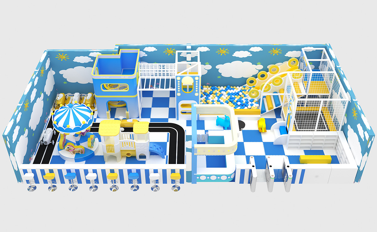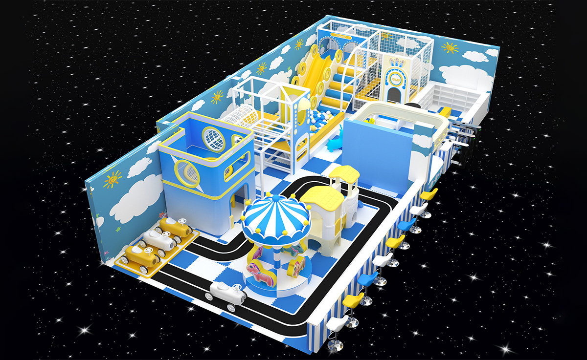 A ride-on track and mini carousel greet guests at the entrance, while a trampoline zone and rocking horses on the side ensure safe, soft-padded fun for kids ages 2–8 and seamless family bonding.