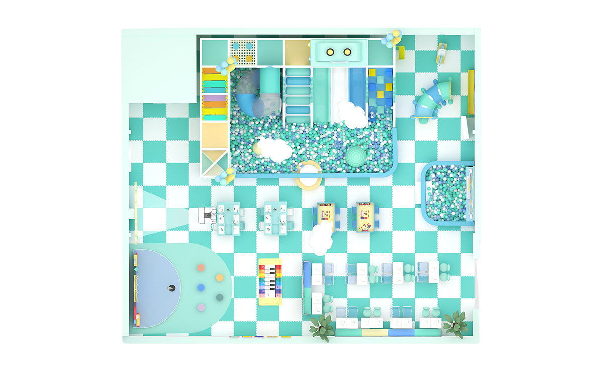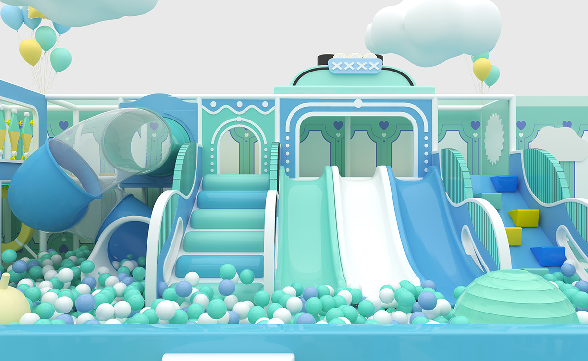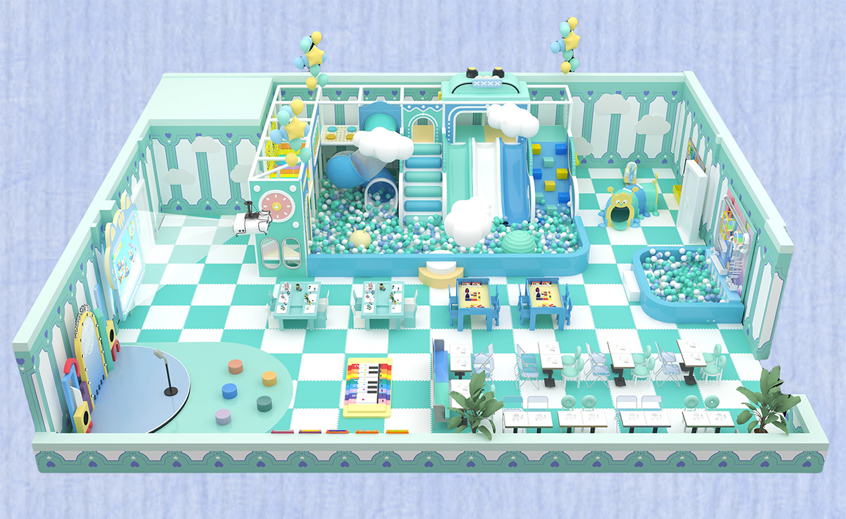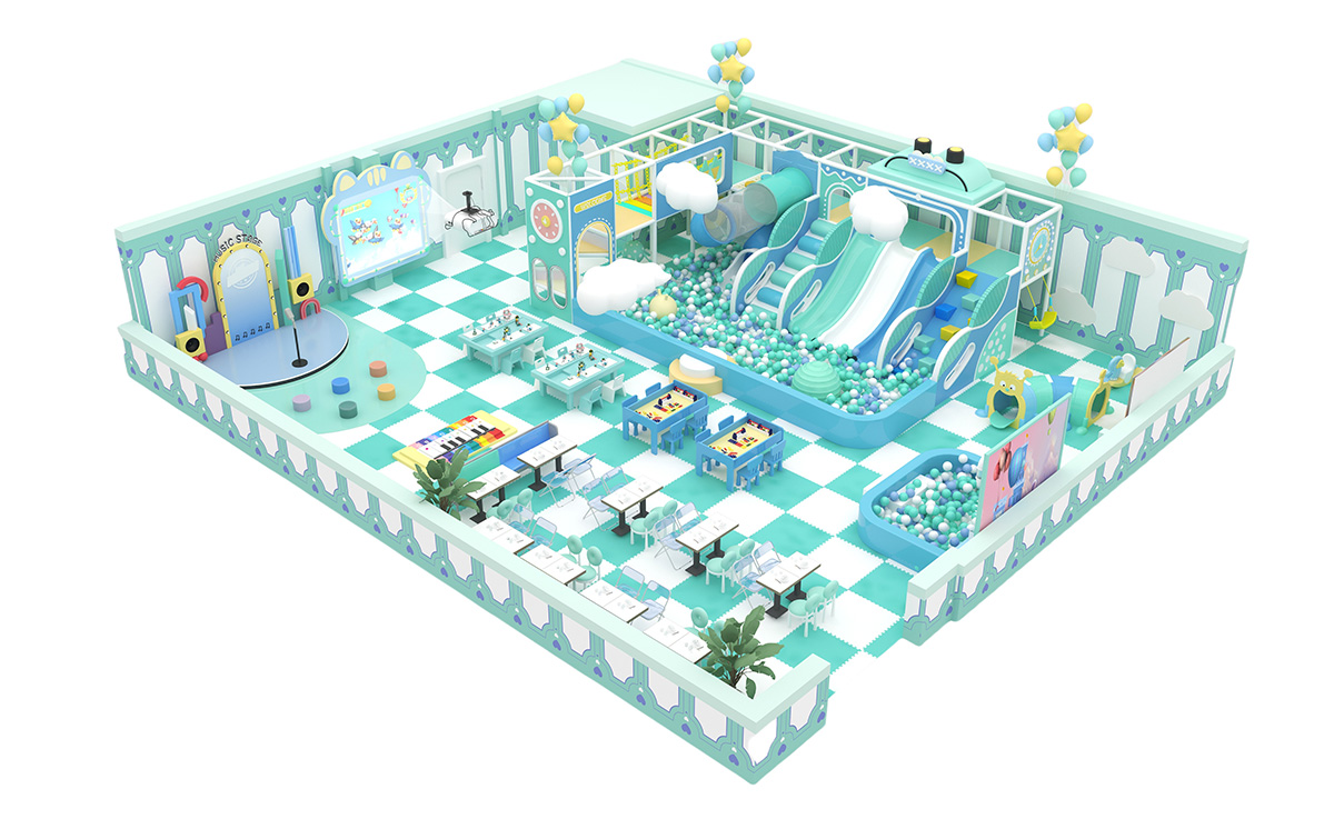 This mint-green indoor playground, adorned with clouds and balloons, creates a fresh, serene atmosphere and combines music play, creative tabletop games, active slides, and a science wall for an all-in-one exploration and learning experience for kids ages 2–8; soft padding at moderate heights ensures safety, while a spacious parents' area offers rest and a clear view for family bonding.
