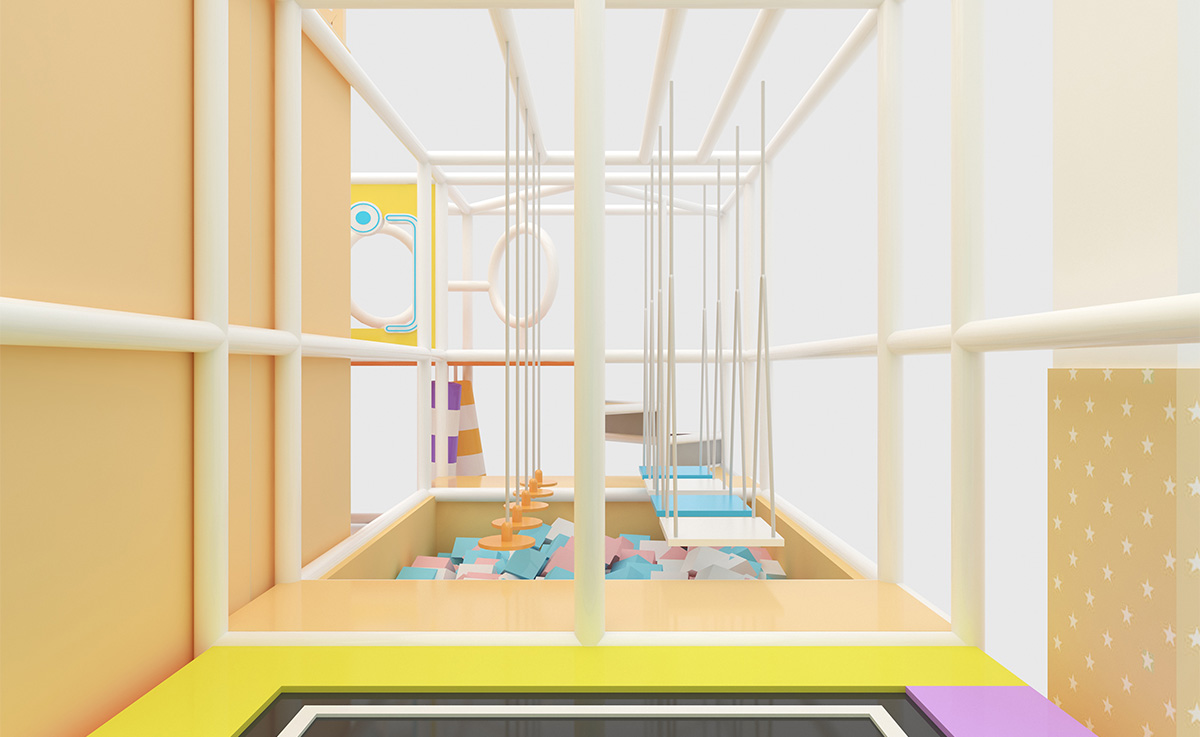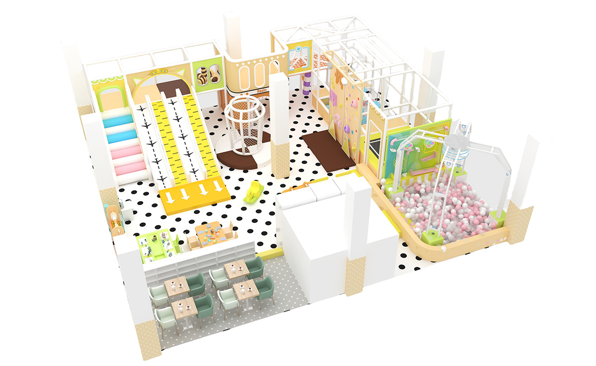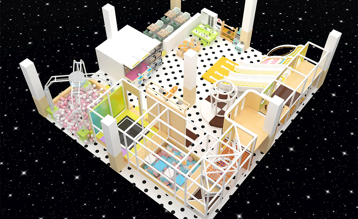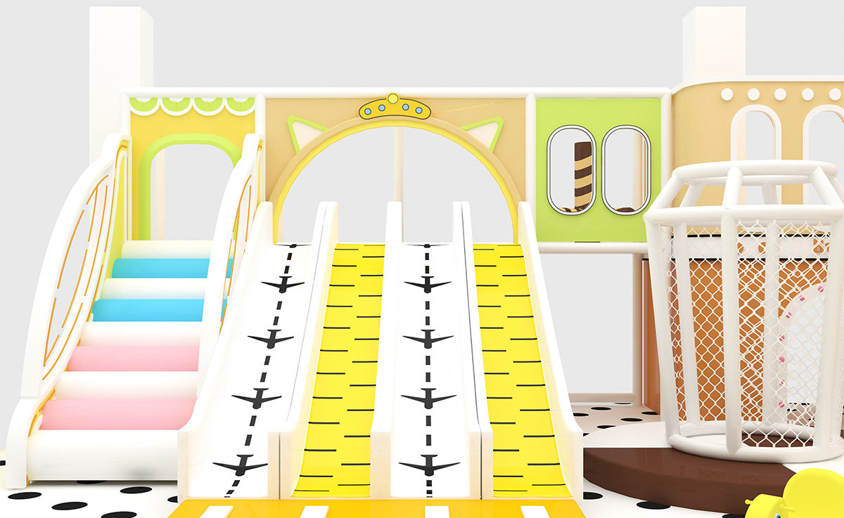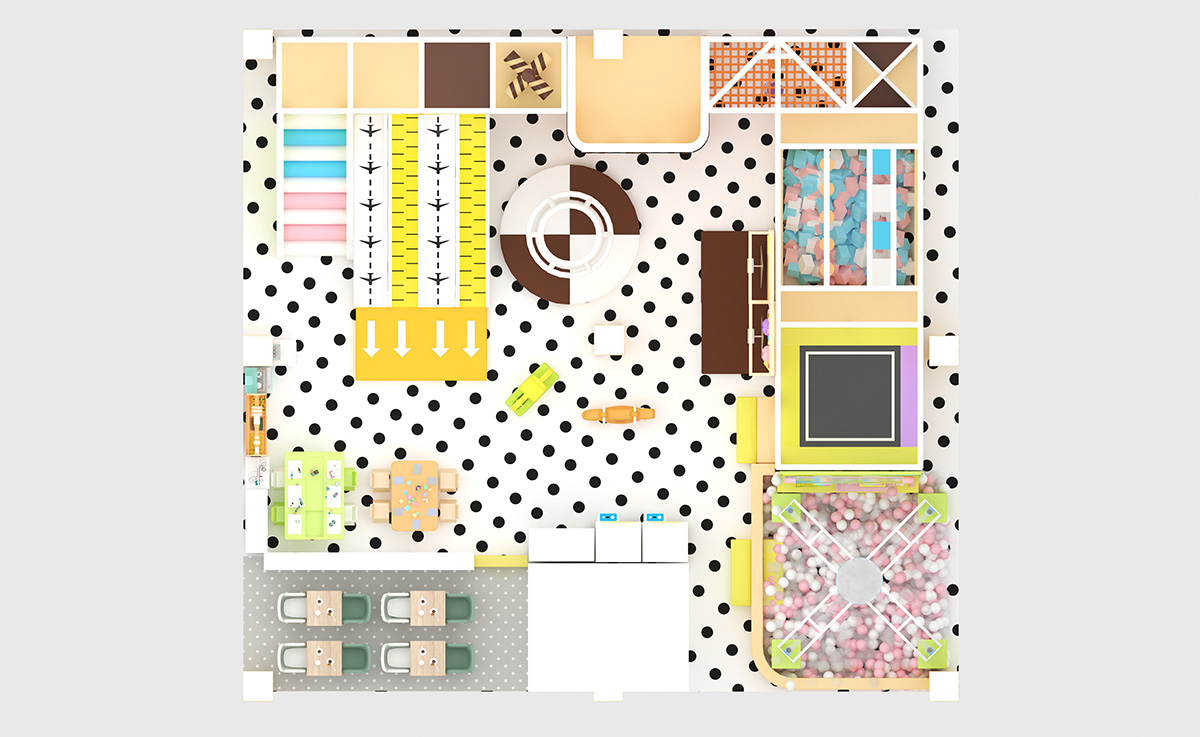 This candy-carnival indoor playground uses pastel pink, blue, and yellow tones, dotted floors, clouds, and balloons to create a magical atmosphere, offering slides, a climbing tower, mini carousel, ride-on road, fishing sand pit, and role-play houses all in one.