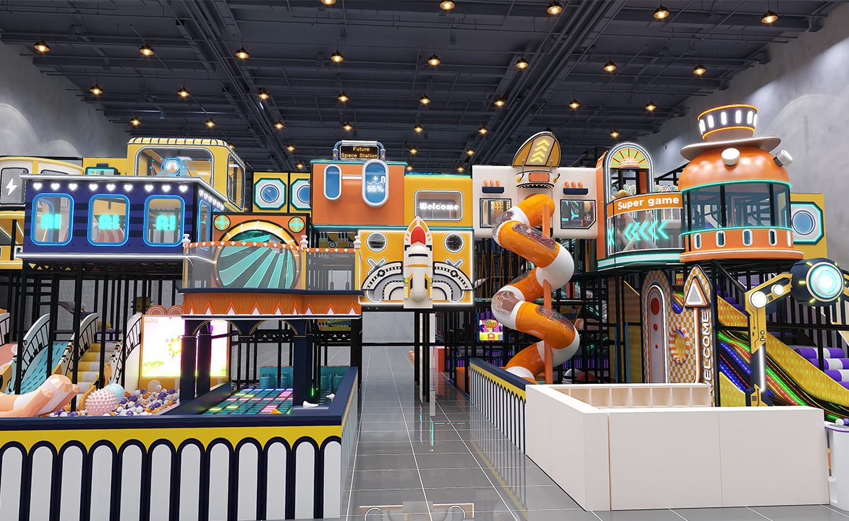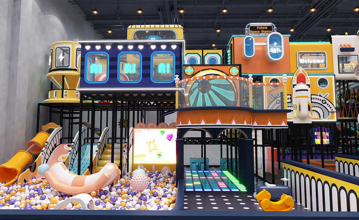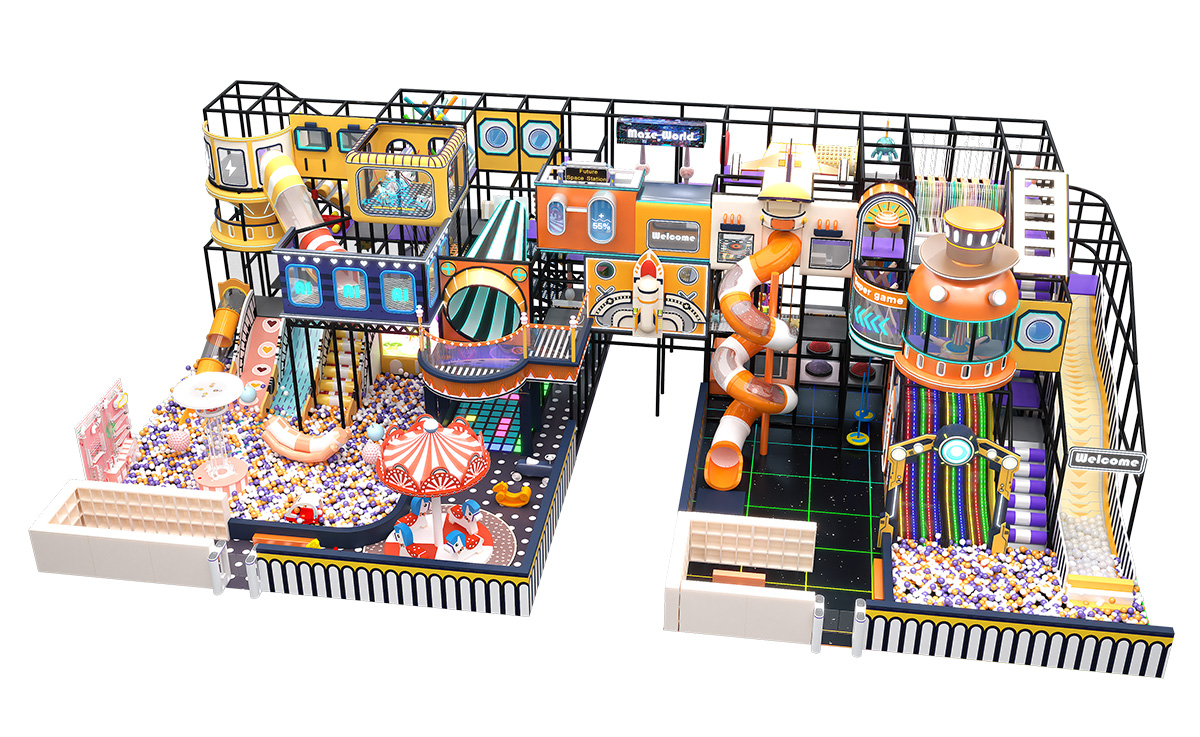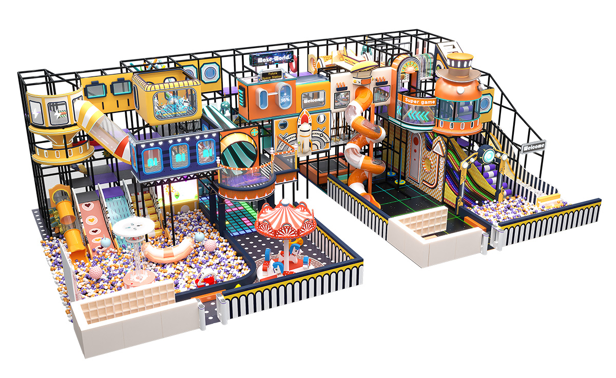 This indoor playground features two contrasting zones—“Whimsy Carnival” and “High-Energy Adventure”—unified by a sleek black framework. The left “Carnival” area in pastel orange, pink, and white offers toddlers (0–6) a safe, magical experience with an interactive drop-ball pit, soft slopes and tube slides, an LED dance floor, a carousel, and a sensory sand-and-block play zone. The right “Adventure” area in deep navy, neon, and tech-orange delivers thrills for older kids (7–12) with spiral slides, high-speed neon chutes, a space-rocket entrance, maze tunnels, and elevated rope challenges.