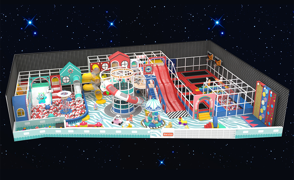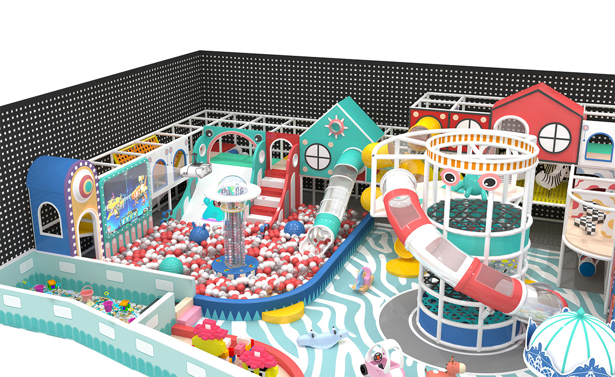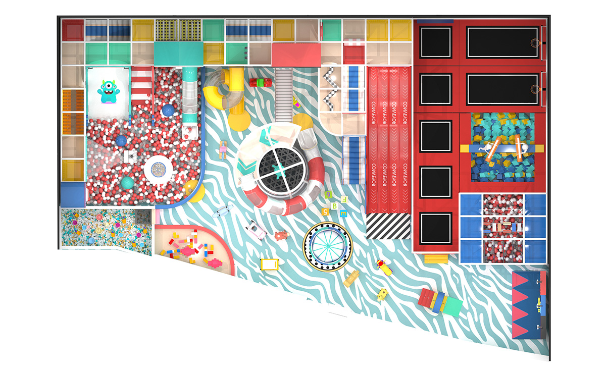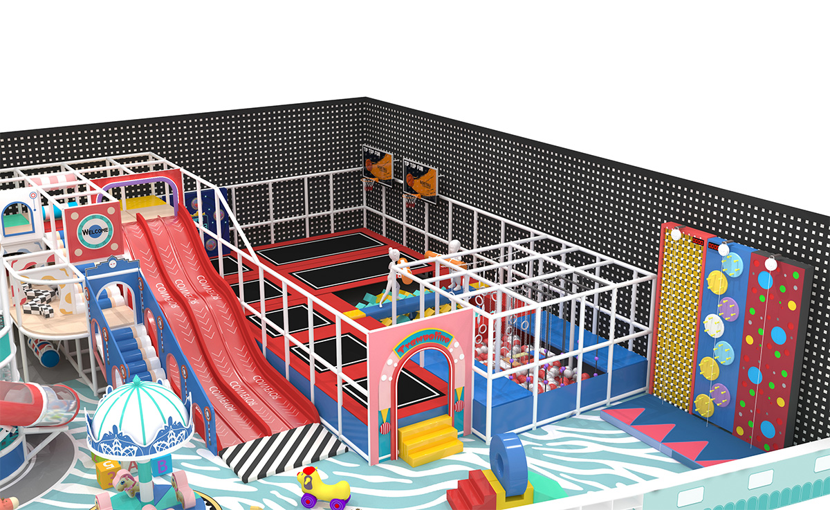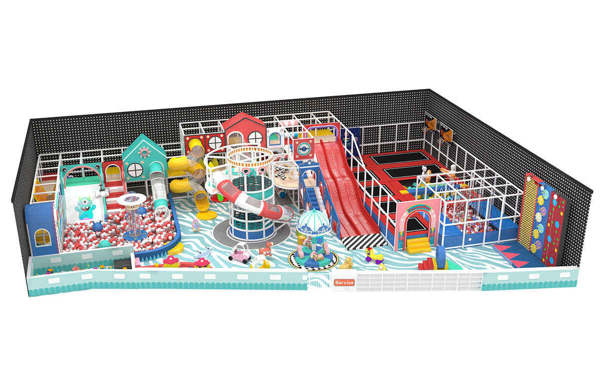 This indoor playground combines a modern cartoon village with geometric patterns, featuring vibrant reds, mint greens, and pure whites against a black-and-white dot-grid wall and gray-white striped floor for a striking, playful look. Zones are thoughtfully organized: a toddler area with house-shaped tunnels, a carousel, and a sensory ball pit for early exploration (0–3 years); a central multi-level play tower, giant ball pit, and interactive drop tower for adventure and friendly competition; three parallel racing slides and a four-unit trampoline/foam pit to boost speed and bounce; plus ring swings and a colorful climbing wall for balance and courage challenges.