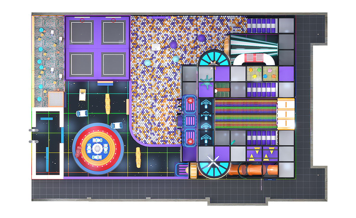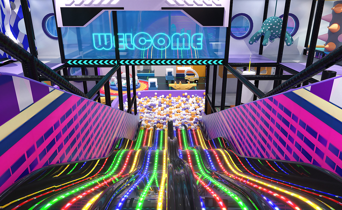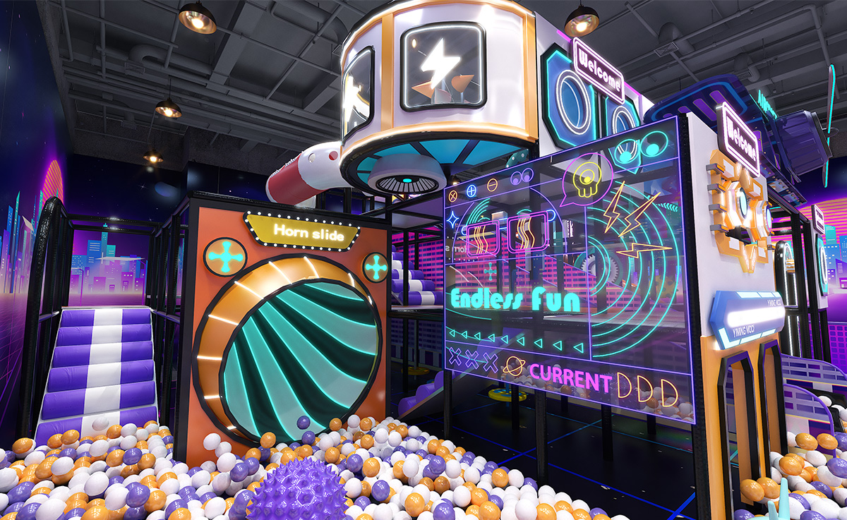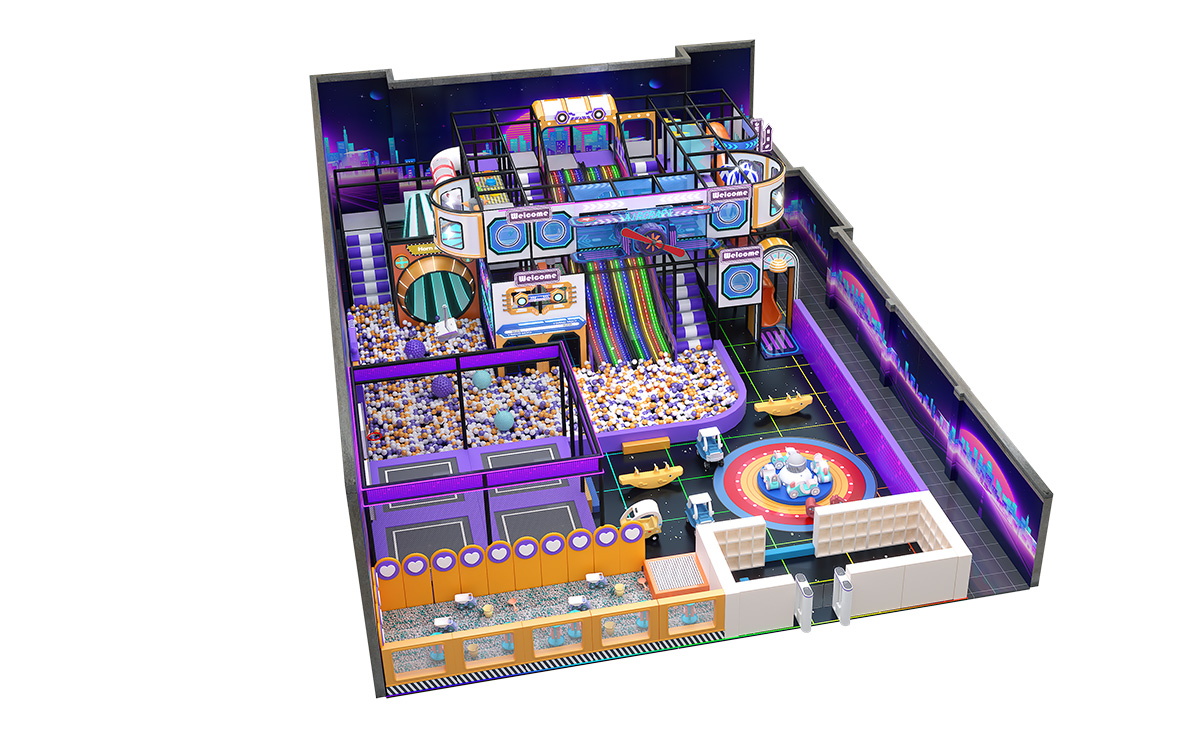 Crafted in a bold palette of purple, orange, and white—with a black grid floor accented by neon-green lines—this indoor playground immerses kids in a cyberpunk cityscape. A sprawling multicolored ball pit anchors the space, complemented by a vibrant LED rainbow slide, stepped slide, and signature Horn Slide for diverse sliding thrills. Trampolines offering both soaring jumps and friendly racing fun. A multilayered climbing-and-slide tower features internal passages and viewing platforms.