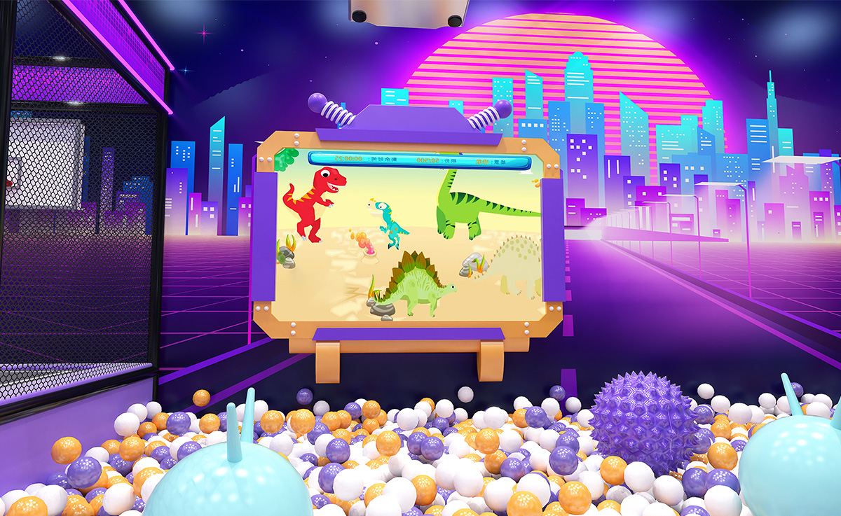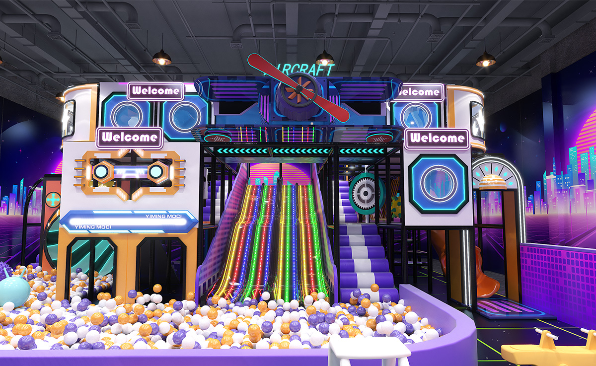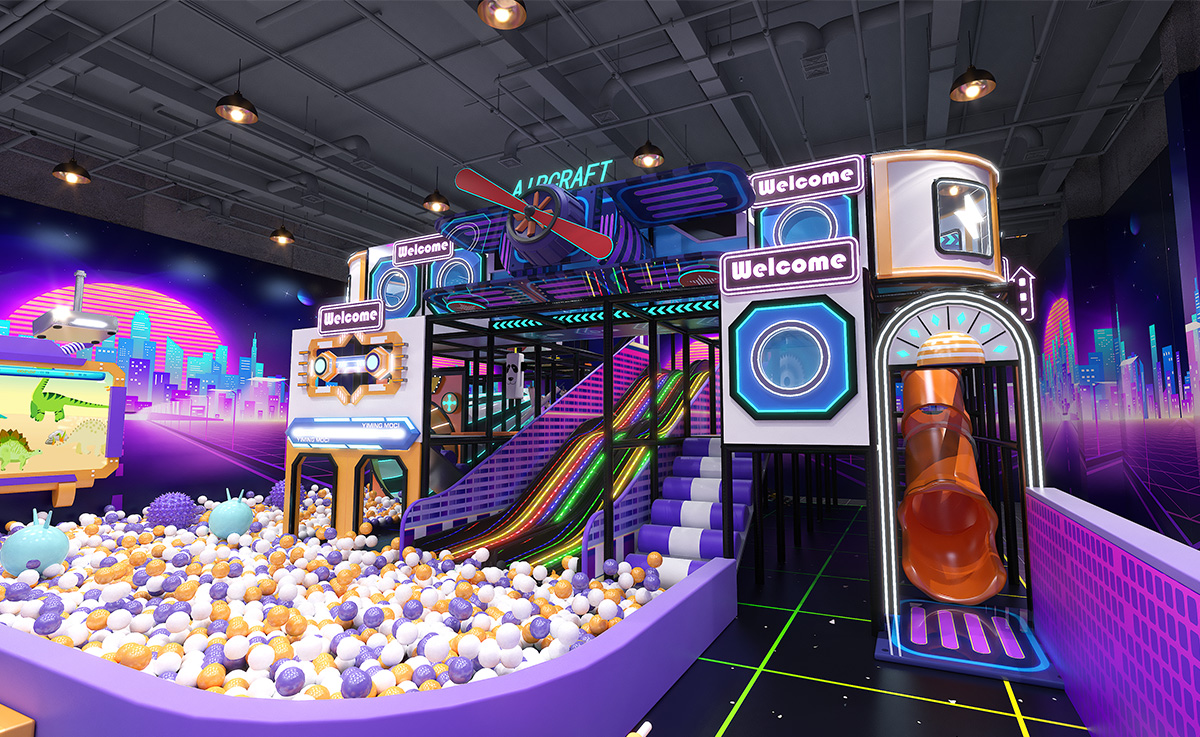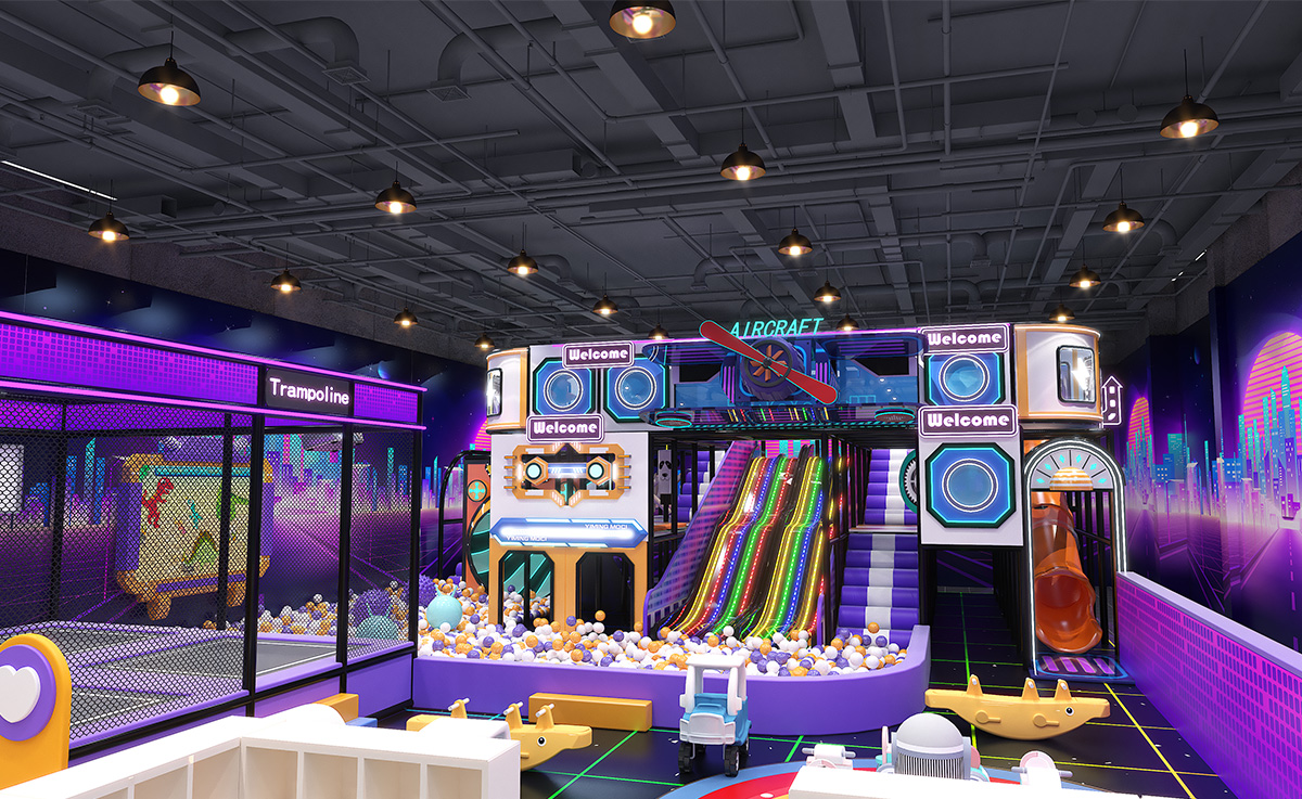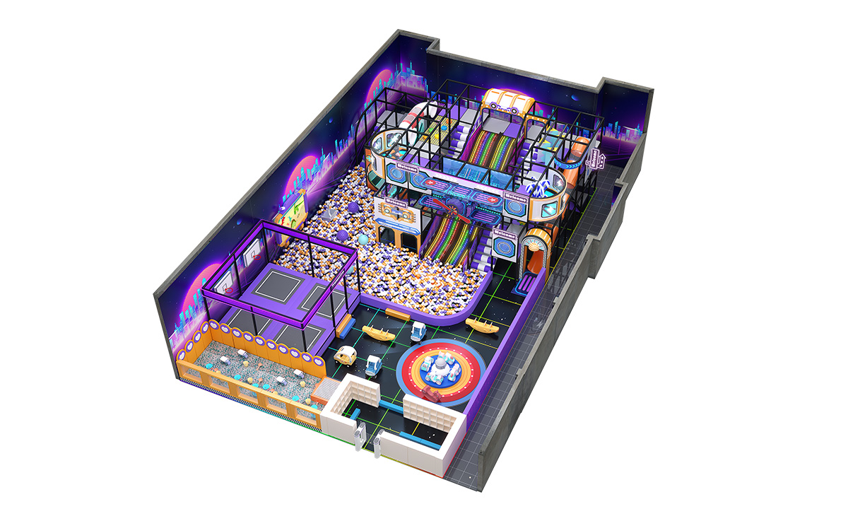 Crafted in a bold palette of purple, orange, and white—with a black grid floor accented by neon-green lines—this indoor playground immerses kids in a cyberpunk cityscape. A sprawling multicolored ball pit anchors the space, complemented by a vibrant LED rainbow slide, stepped slide, and signature Horn Slide for diverse sliding thrills. Trampolines offering both soaring jumps and friendly racing fun. A multilayered climbing-and-slide tower features internal passages and viewing platforms.