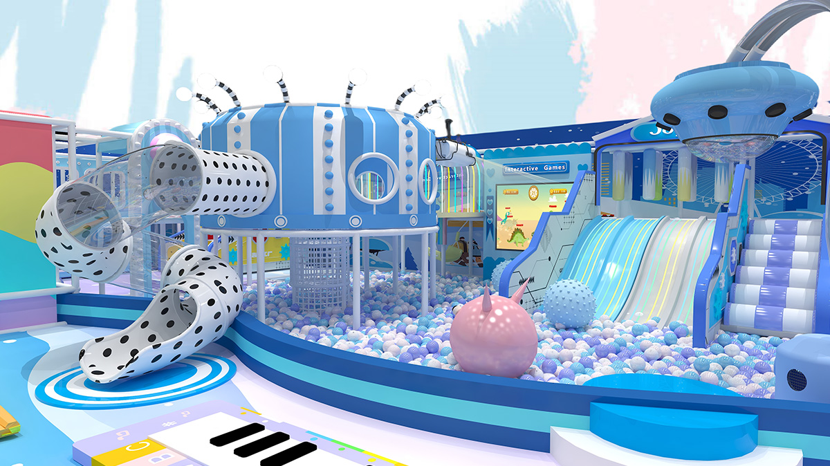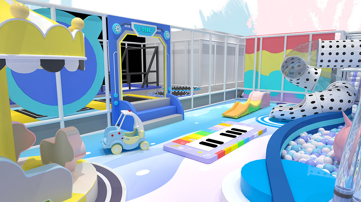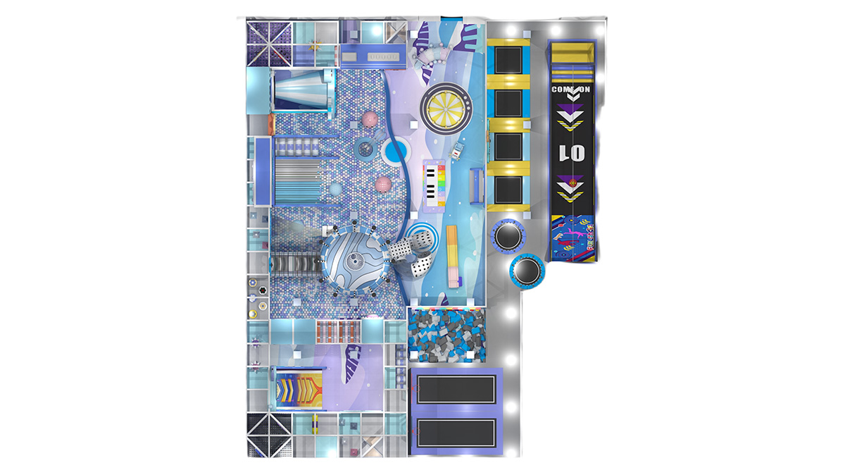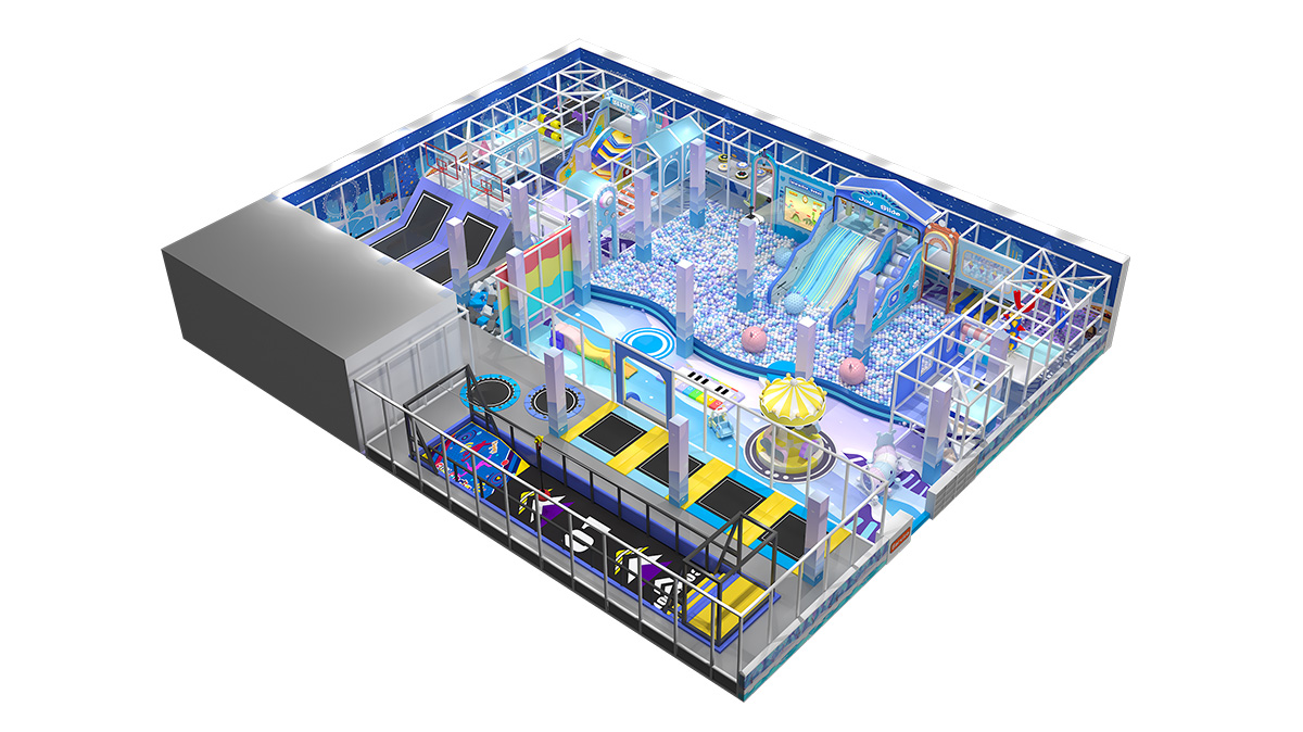 Dressed in sky-blue, lavender, and creamy yellow with neon candy accents, this indoor playland immerses kids in a pastel dreamscape. The front zone features a row of trampolines, spring jump lanes, a mini carousel, and toddler ride-on cars for early explorers. At its heart lies a sprawling ball pit with LED slides, dotted spiral tube slides, and a canopy with an interactive screen—offering seamless glide, bounce, and play. The back section unites a basketball shooting track, foam pit, climbing wall, and rope-net ninja course for progressive challenges.