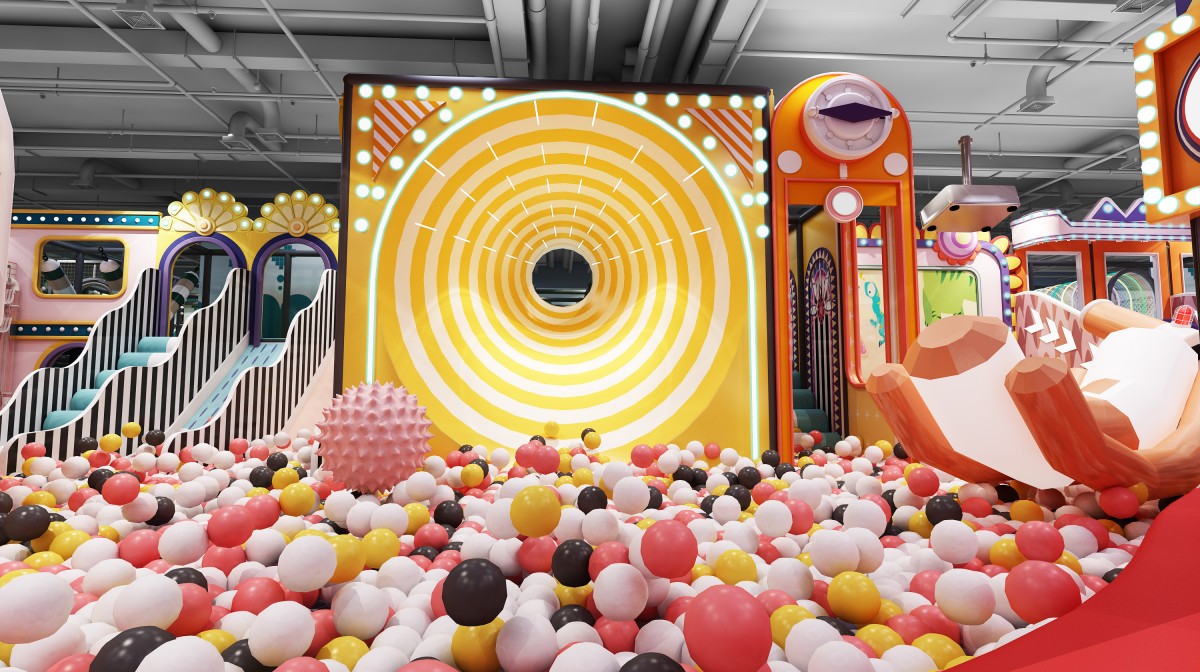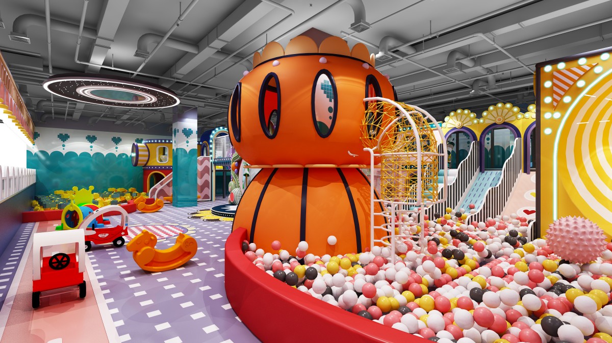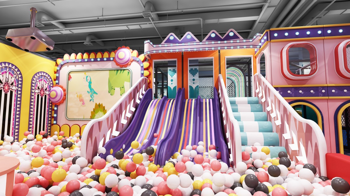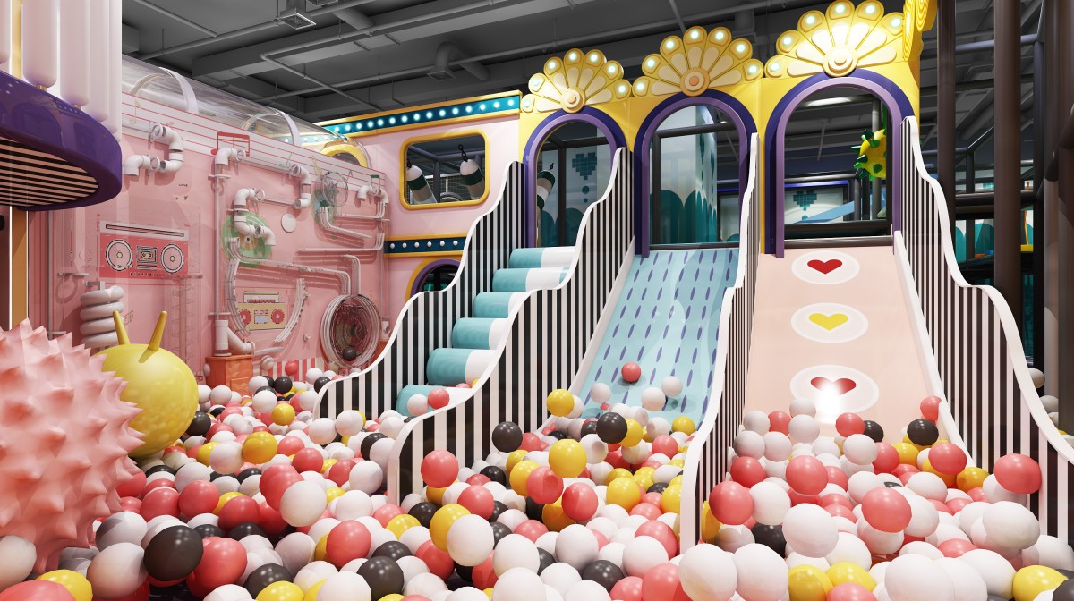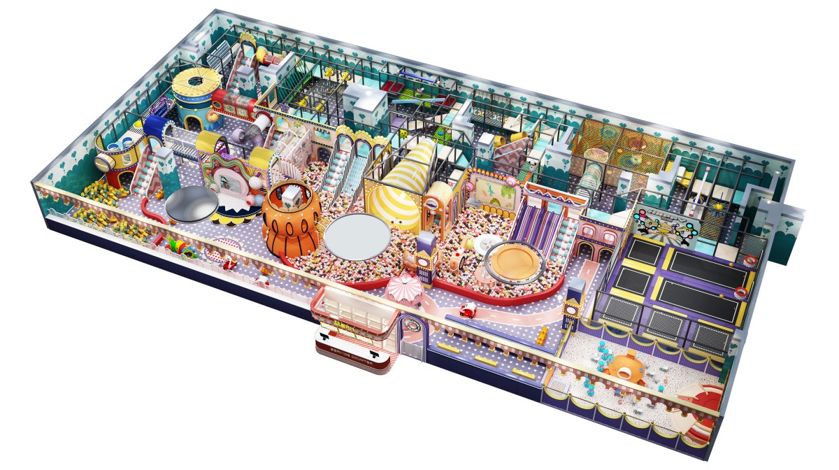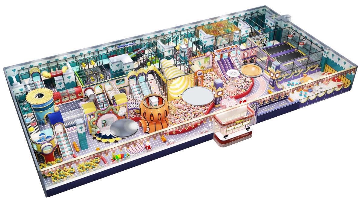 This indoor playground embodies a candy-dream theme with a palette of pinks, lavender, pale yellow, and mint green, accented by black-and-white stripes and metallic grays for a vibrant, whimsical setting. Guests enter through a service counter flanked by a “SHOW TIME” rotating stage for interactive greeting. The front right zone features role-play cottages and a toddler soft-play area—complete with rocking cars and building blocks—ideal for ages 1–3. At its core, a sprawling ball pit hosts multi-lane striped slides, a yellow-white spiral tube, and circular pit sections for tumbling thrills. The rear network of mesh obstacles and climbing bridges leads to a trampoline section with basketball hoops, engaging 2–12 year-olds in active challenges.
