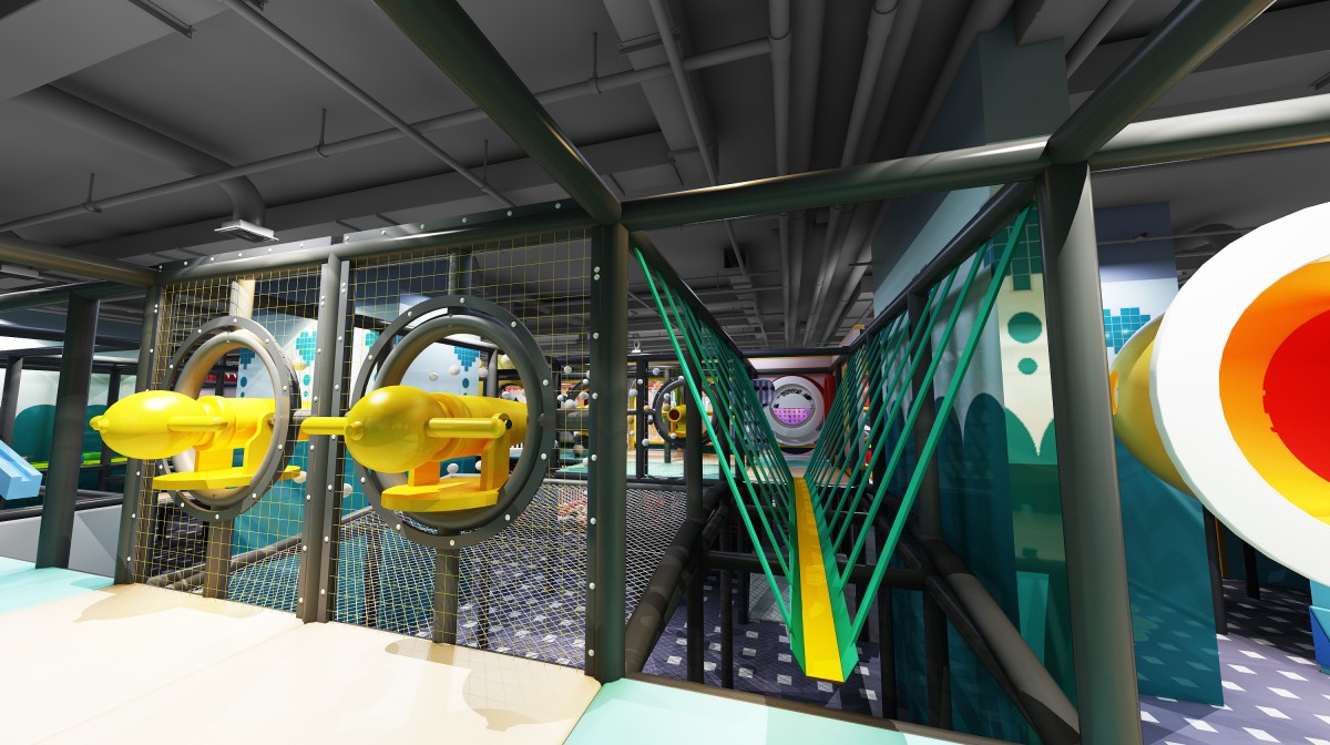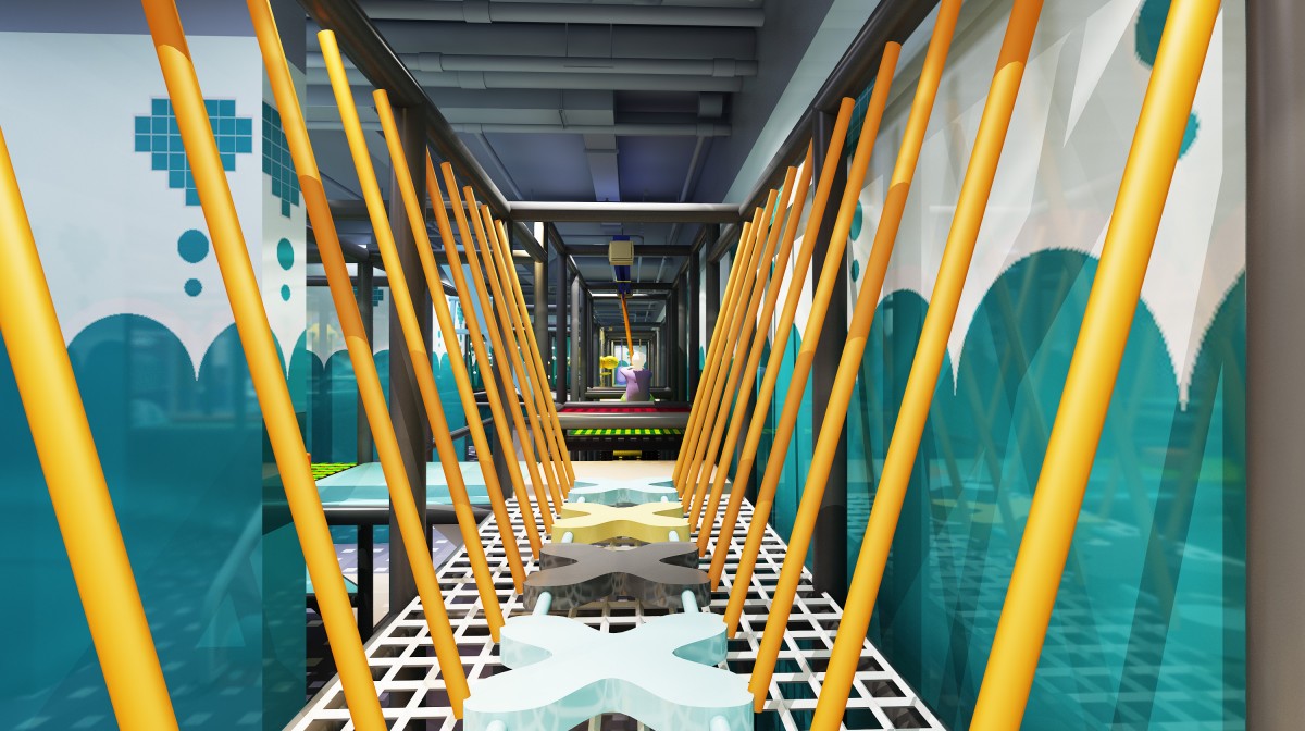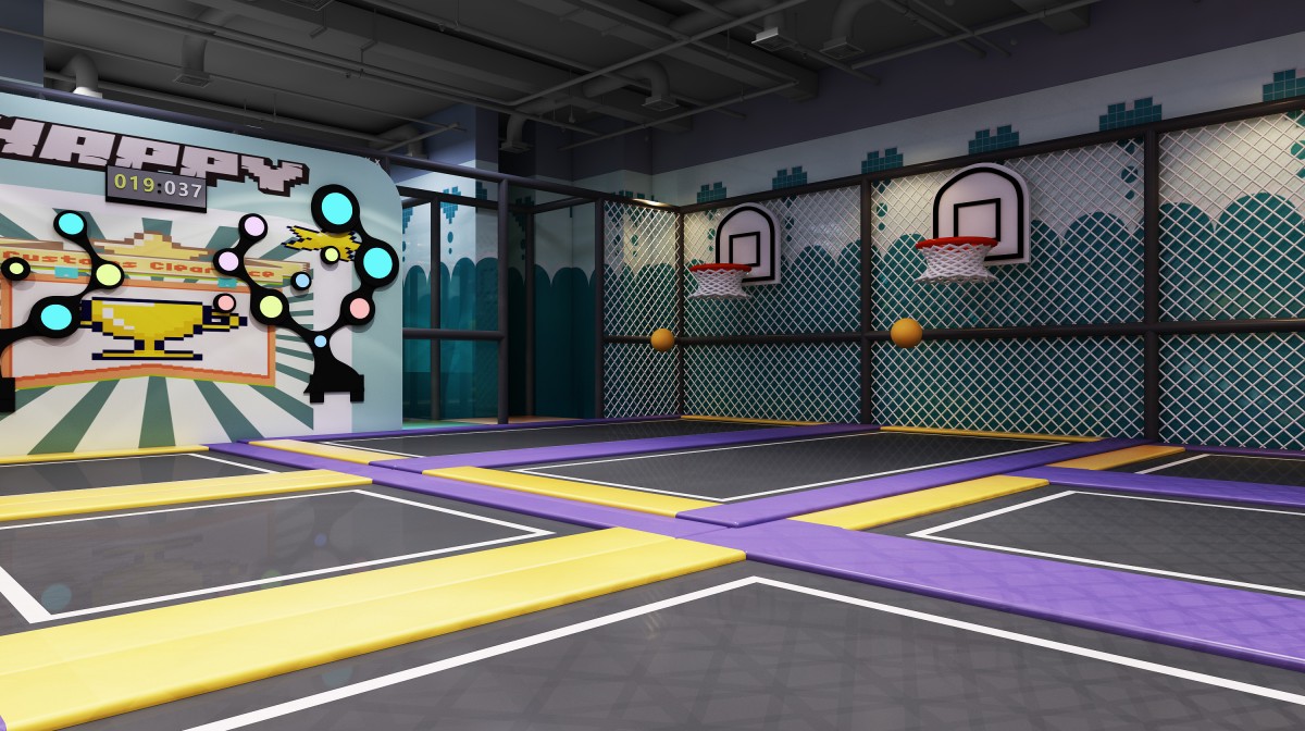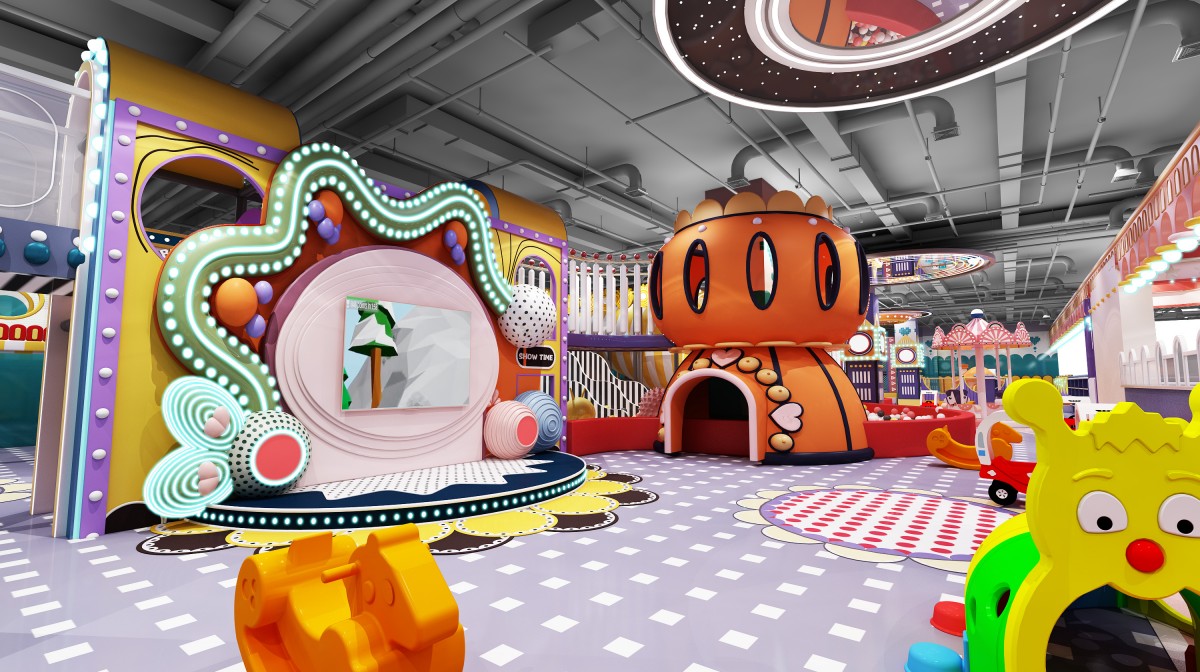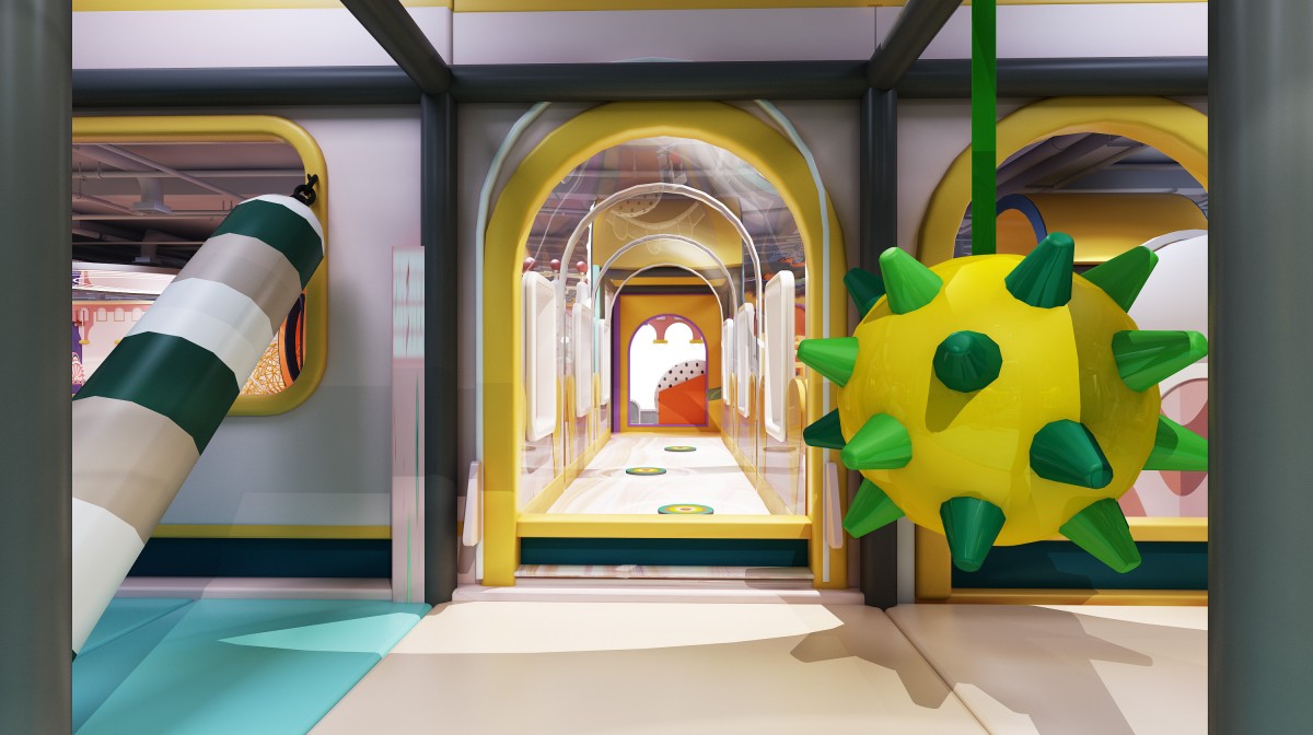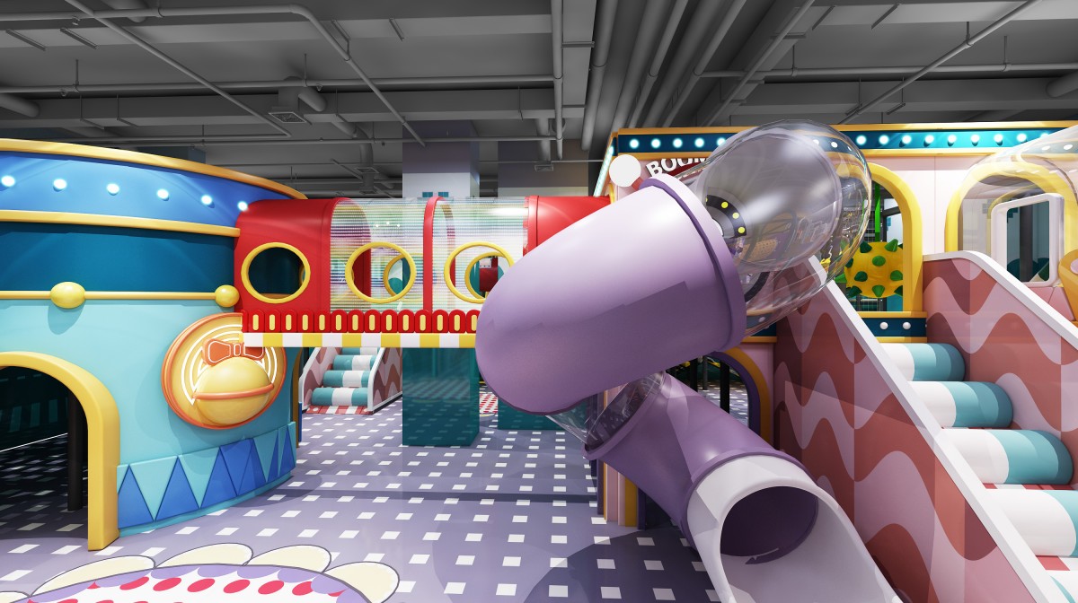 This indoor playground embodies a candy-dream theme with a palette of pinks, lavender, pale yellow, and mint green, accented by black-and-white stripes and metallic grays for a vibrant, whimsical setting. Guests enter through a service counter flanked by a “SHOW TIME” rotating stage for interactive greeting. The front right zone features role-play cottages and a toddler soft-play area—complete with rocking cars and building blocks—ideal for ages 1–3. At its core, a sprawling ball pit hosts multi-lane striped slides, a yellow-white spiral tube, and circular pit sections for tumbling thrills. The rear network of mesh obstacles and climbing bridges leads to a trampoline section with basketball hoops, engaging 2–12 year-olds in active challenges.