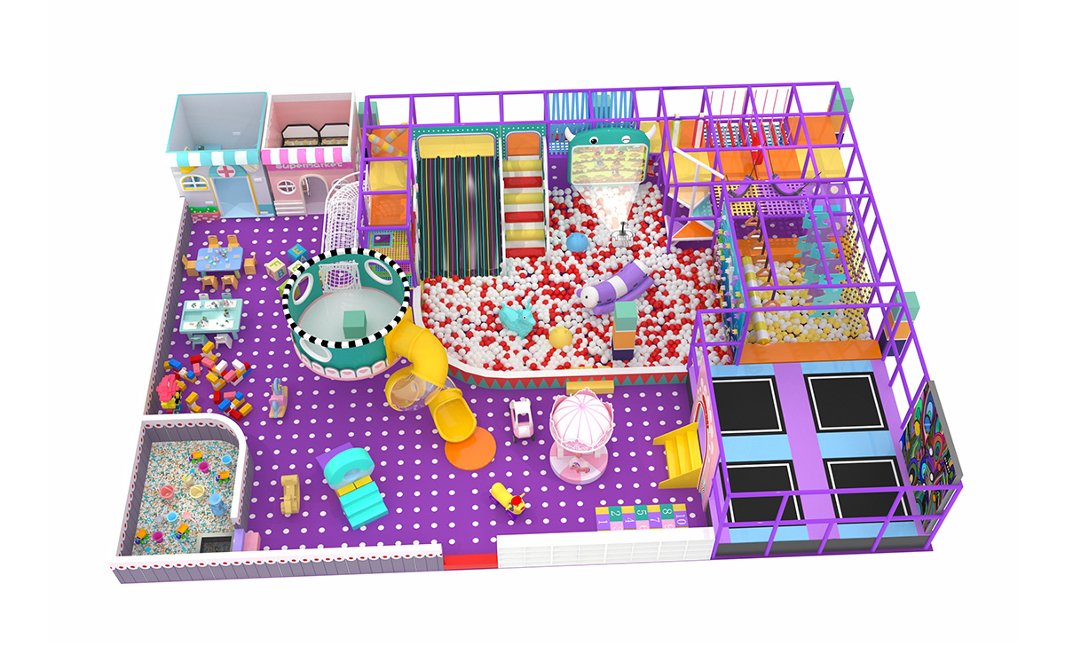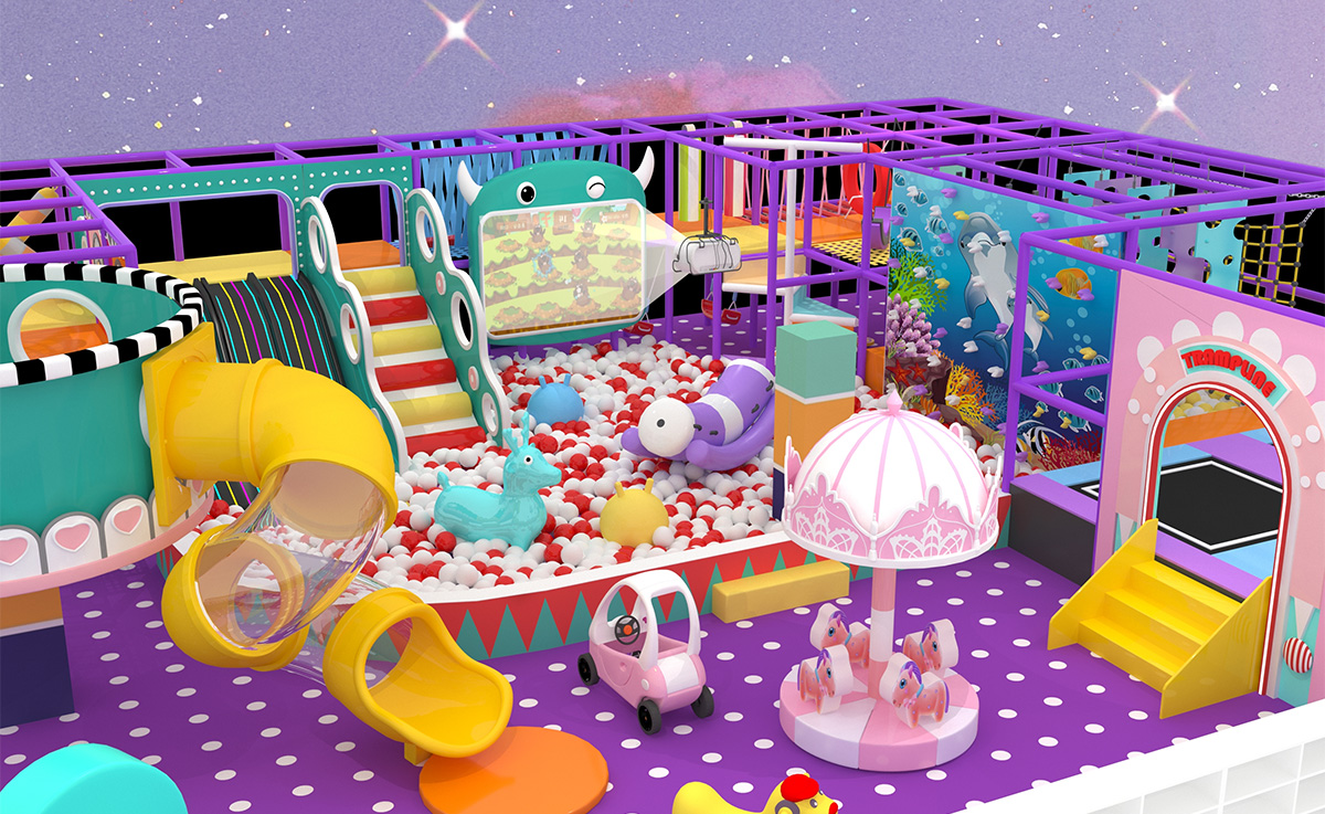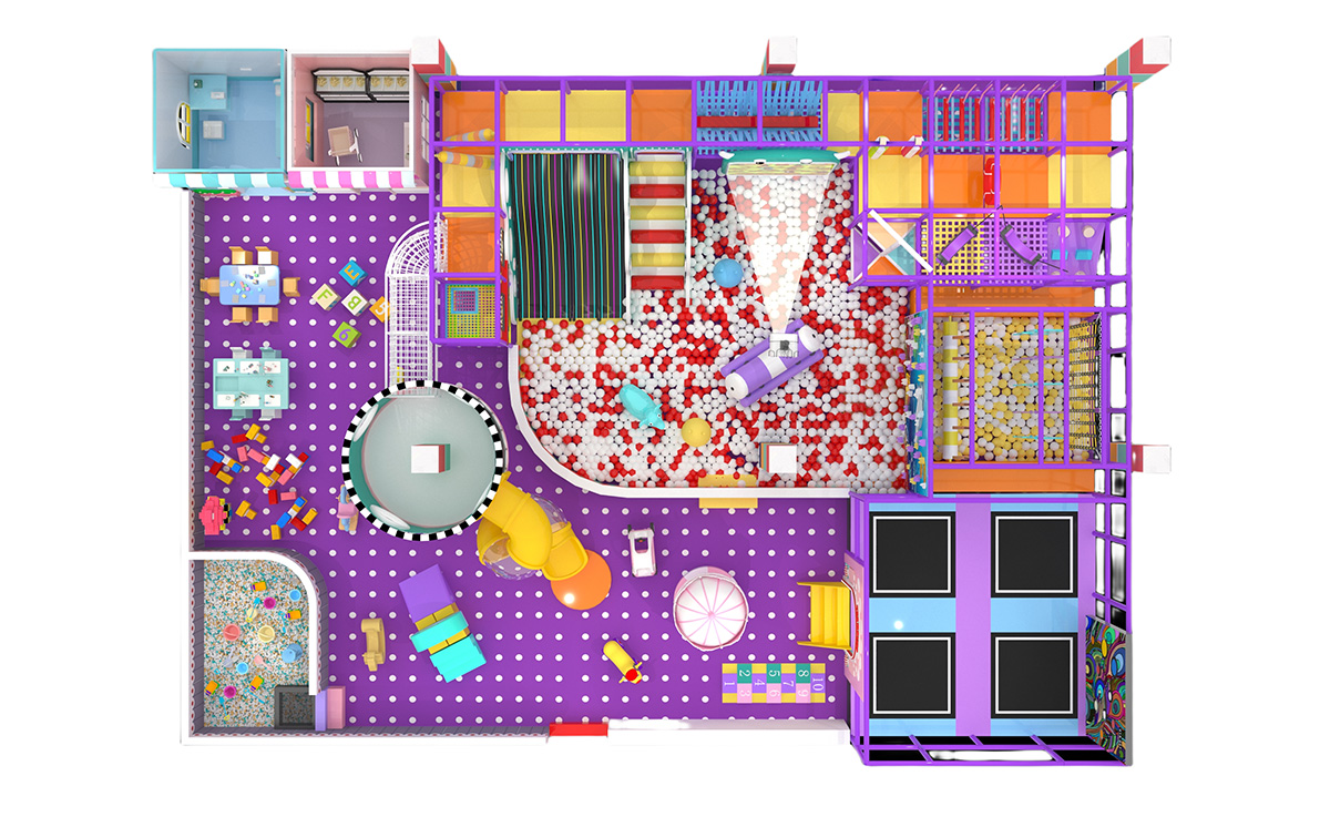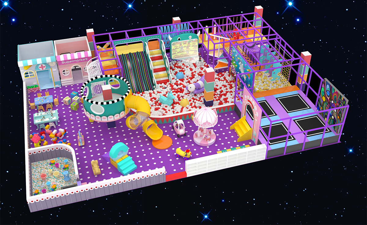 It features a Cosplay House with clinic and supermarket, a tower with a transparent tube slide and LED slides into ball pit. A ninja course of monkey bars, cheese board and net climbing, a four-unit trampoline zone with an interactive patting wall, fairytale carousel and ride-on cars, toy tables, sandpit and block area. Bold macaron hues and an open layout deliver wide-open sightlines, immersive fun and easy supervision. The quiet and sport zone is divided clearly.