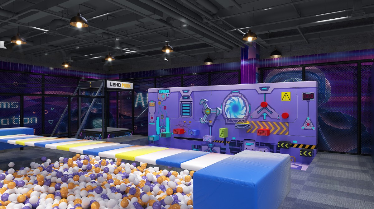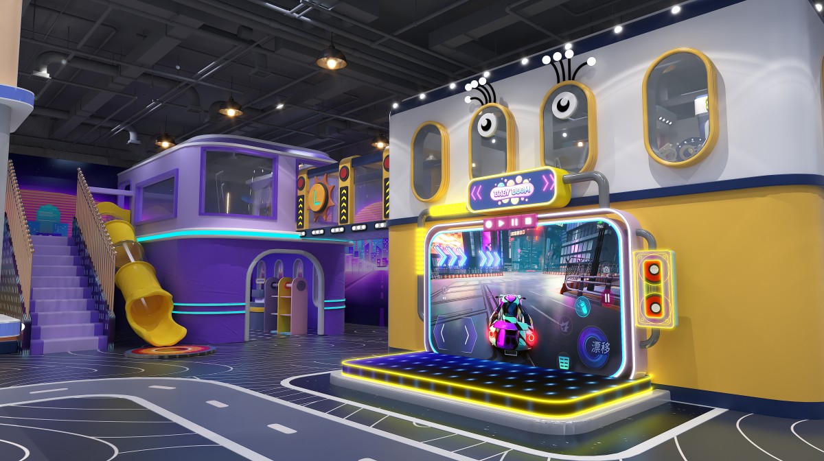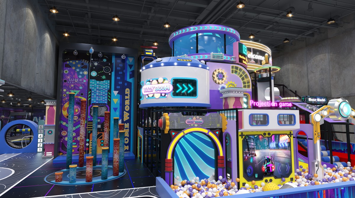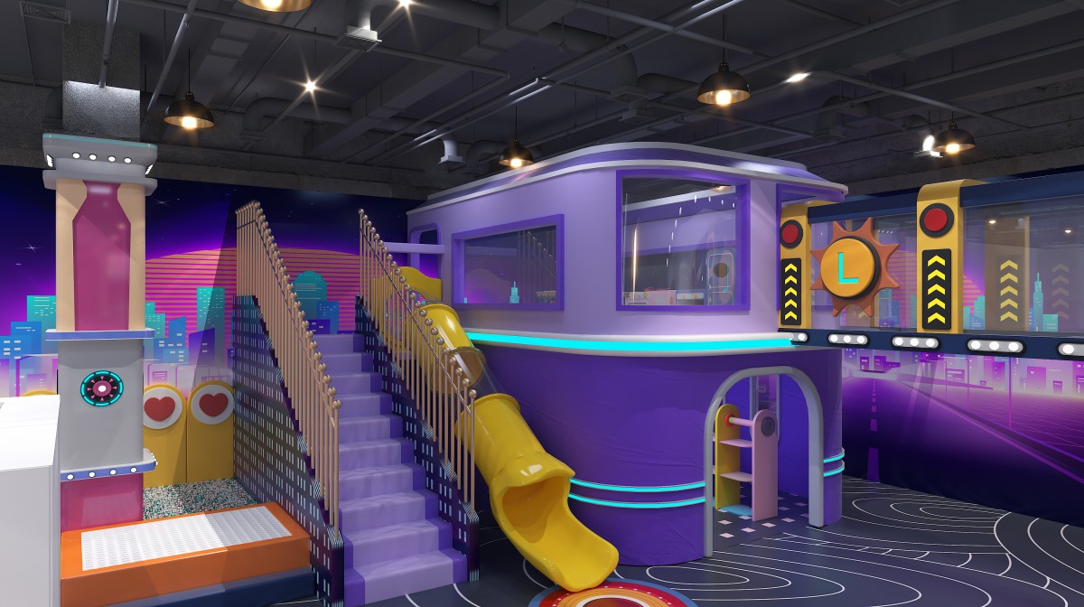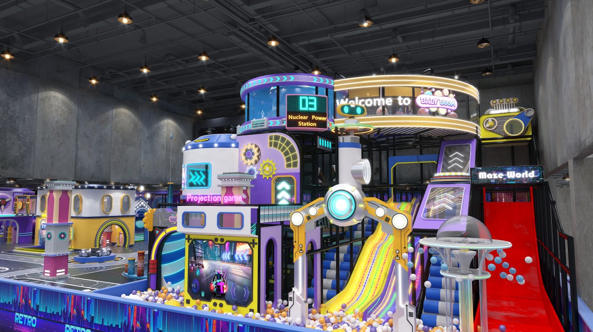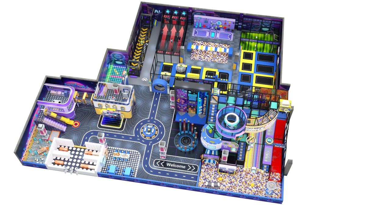 It's a cutting-edge indoor playground built around a three-level “Reactor Core” tower draped in glowing LED rings and neon arrows. From its interactive projection screen—where kids can race virtual cars and trigger dynamic effects by touch—to twin spiral and maze slides that plunge into a multicolored ball pit and foam-column field, every element blends high-tech thrills with soft-fall fun. A central illuminated runway links bouncing pillars, mini basketball trampolines, and climbing challenges (rock walls, net pods), while a separate toddler nook offers a safe kitchen role-play, police-car ride, and gentle sliders for ages 1–5.