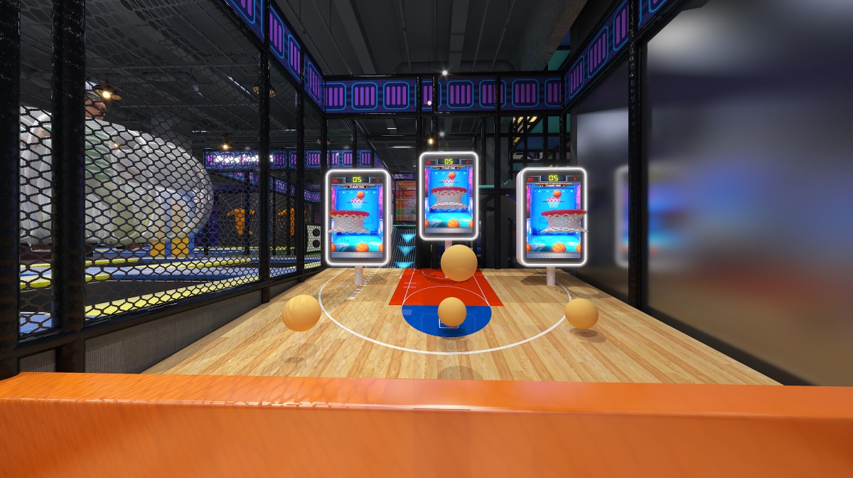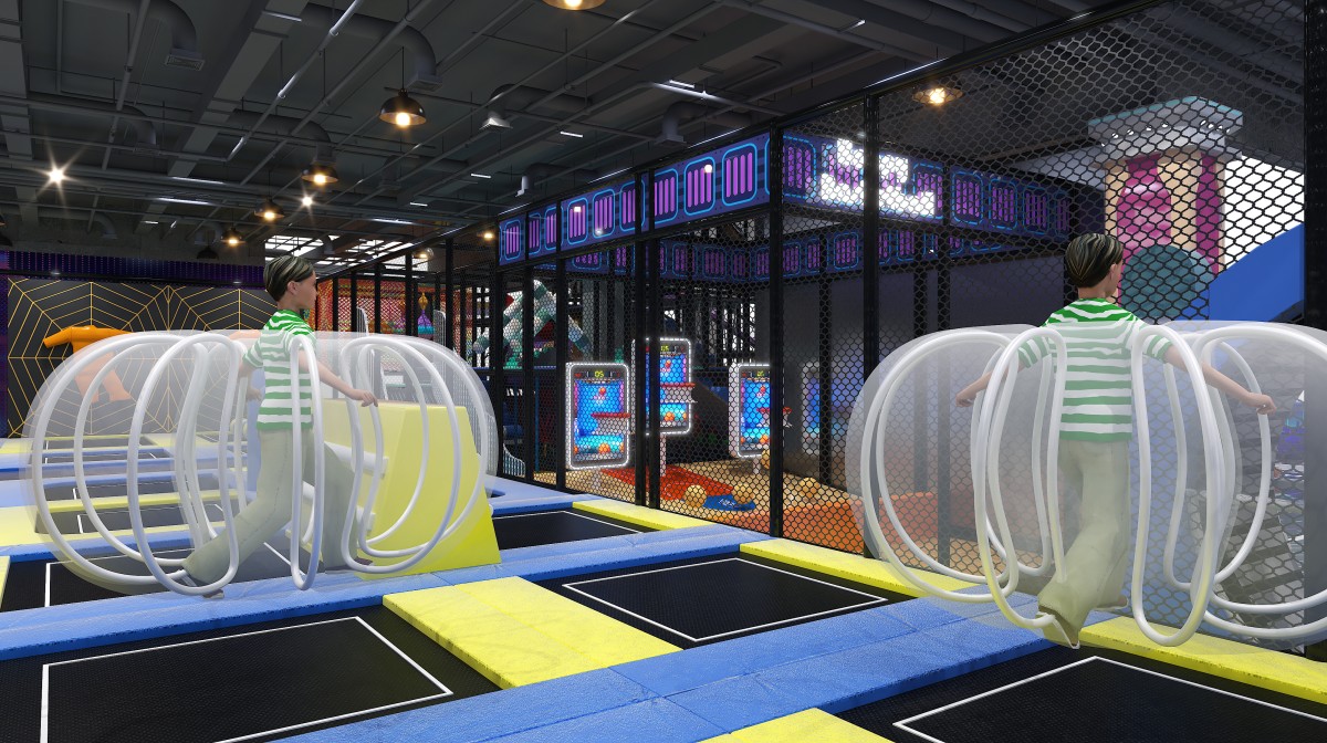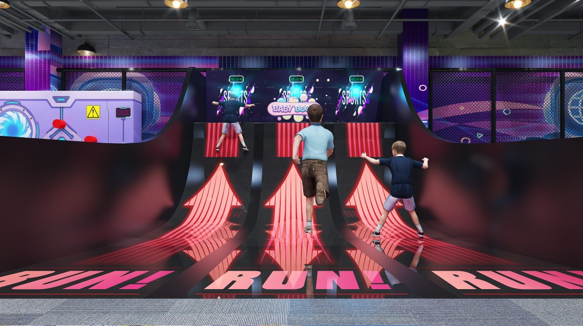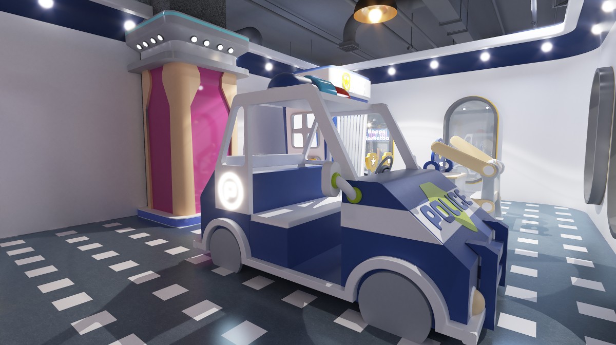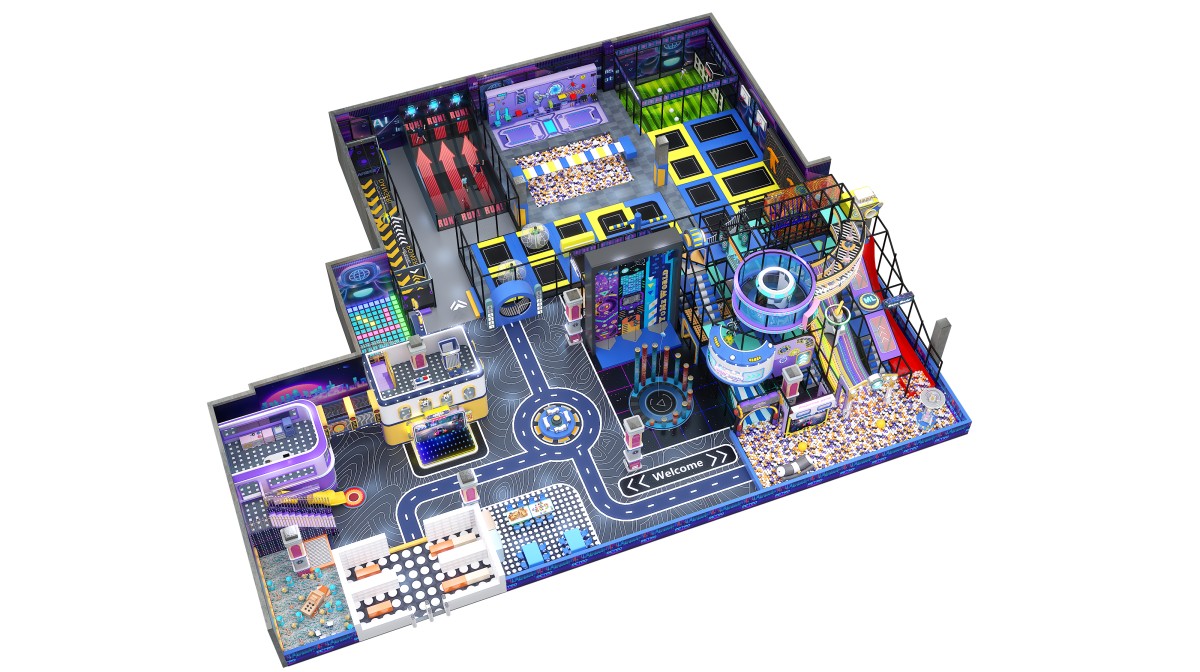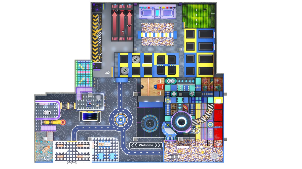 It's a cutting-edge indoor playground built around a three-level “Reactor Core” tower draped in glowing LED rings and neon arrows. From its interactive projection screen—where kids can race virtual cars and trigger dynamic effects by touch—to twin spiral and maze slides that plunge into a multicolored ball pit and foam-column field, every element blends high-tech thrills with soft-fall fun. A central illuminated runway links bouncing pillars, mini basketball trampolines, and climbing challenges (rock walls, net pods), while a separate toddler nook offers a safe kitchen role-play, police-car ride, and gentle sliders for ages 1–5.