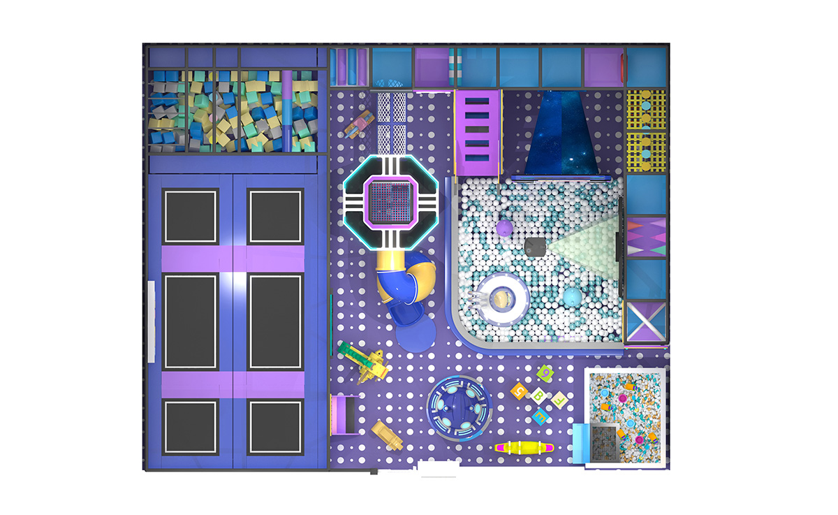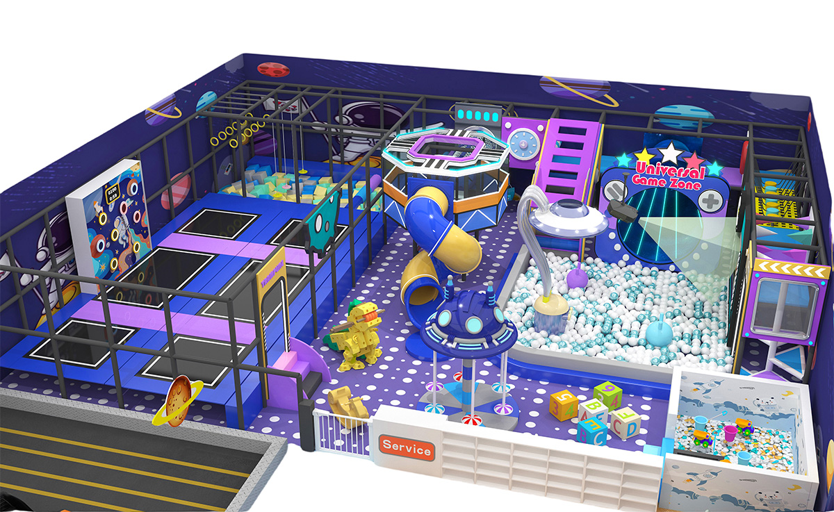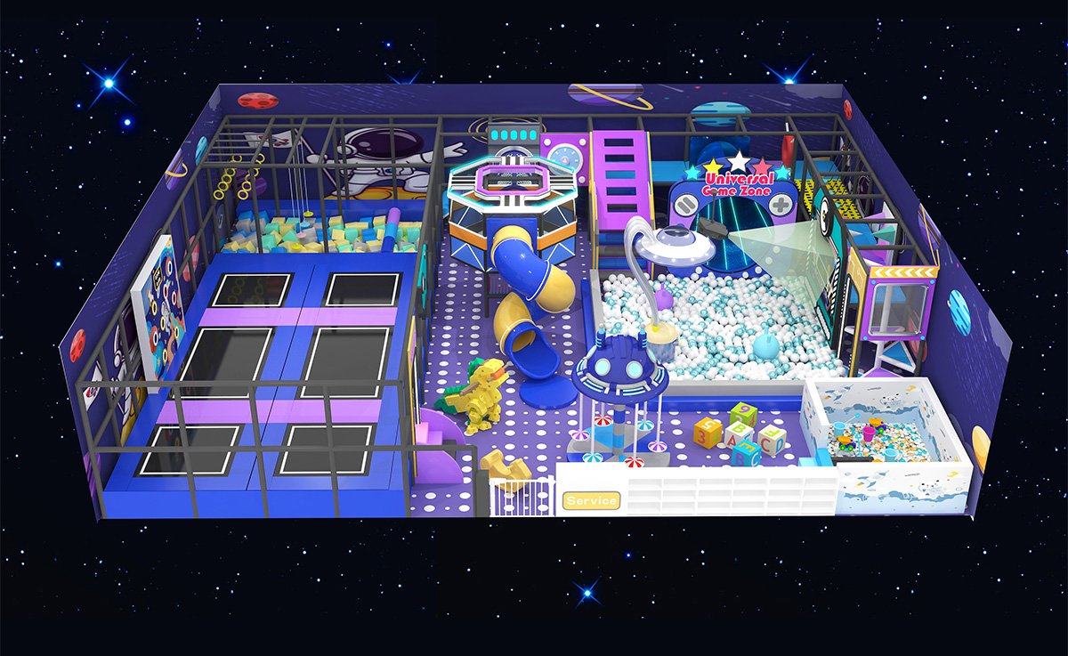A three-level, space-themed playhouse wrapped in deep-navy colors, featuring a transparent spiral slide, Portal-looks trumpet slide, and a white-and-blue projection ball pit, trampoline zone, ninja course with monkey bars and balance beam, foam block pit, kiddie rides, UFO carousel and toddler sand-and-block area. Its bold, futuristic palette and immersive design deliver a cosmic adventure, while the open layout and clear sightlines ensure children of all ages enjoy both playful exploration and active challenges under easy parental supervision.