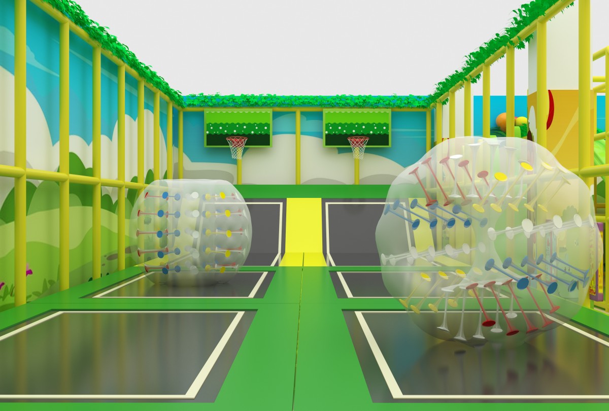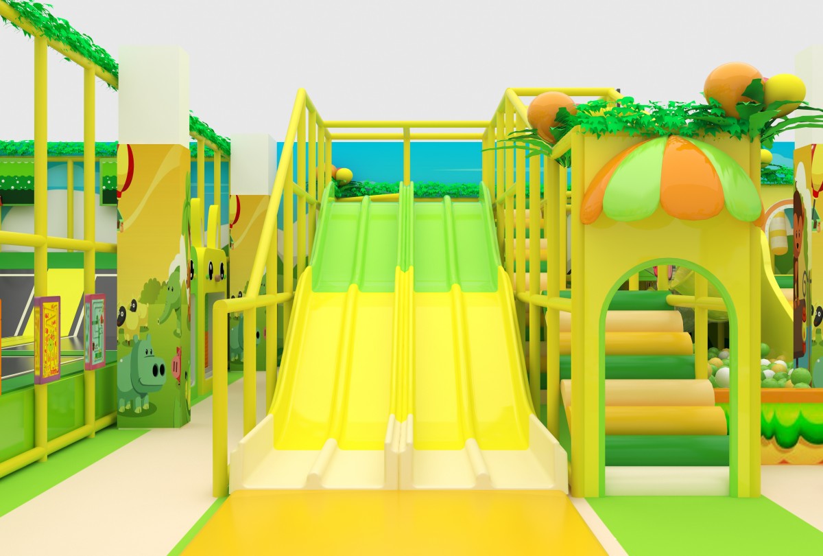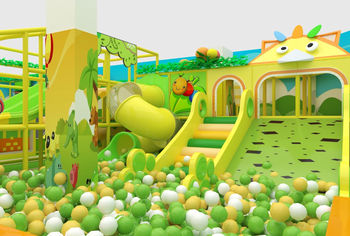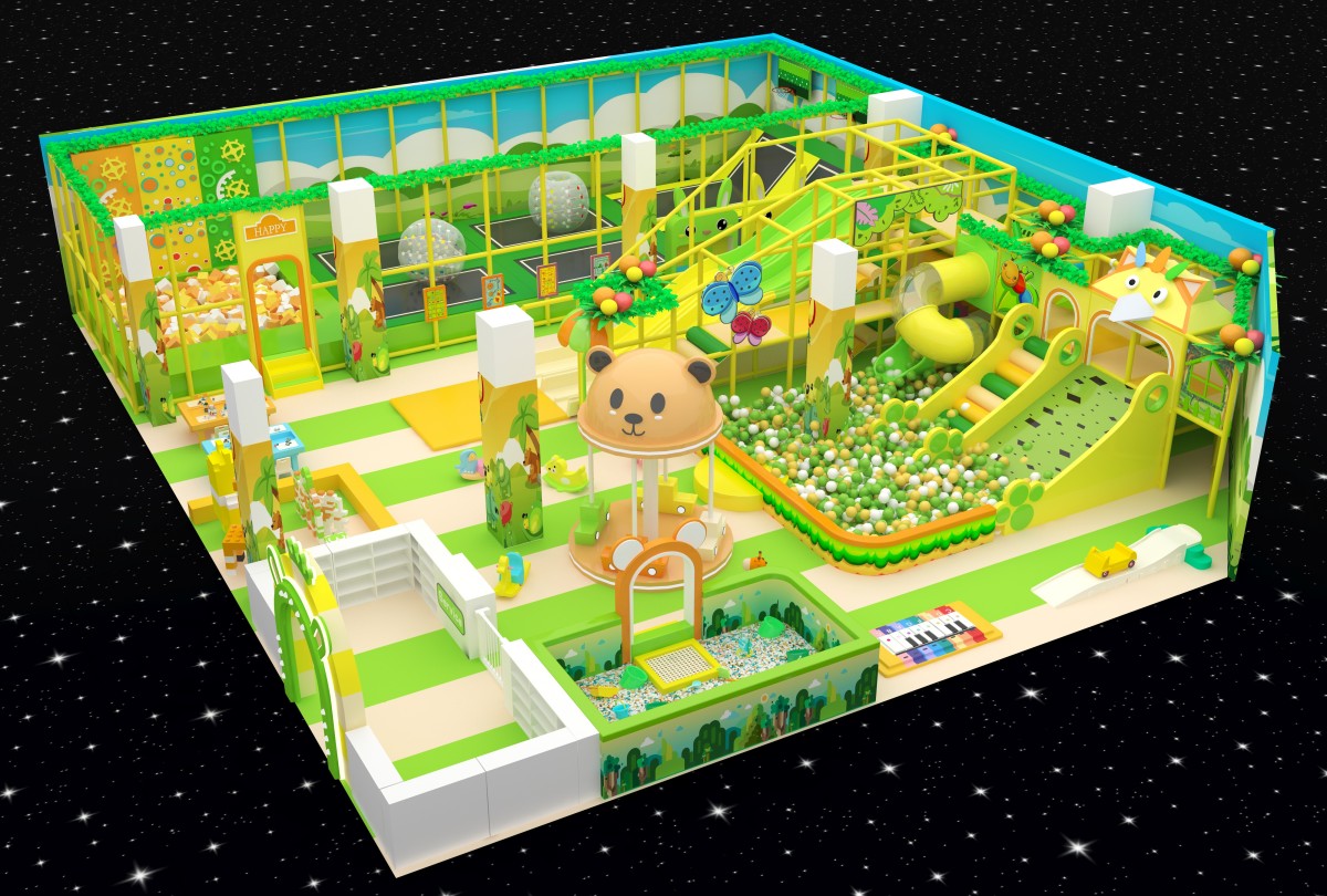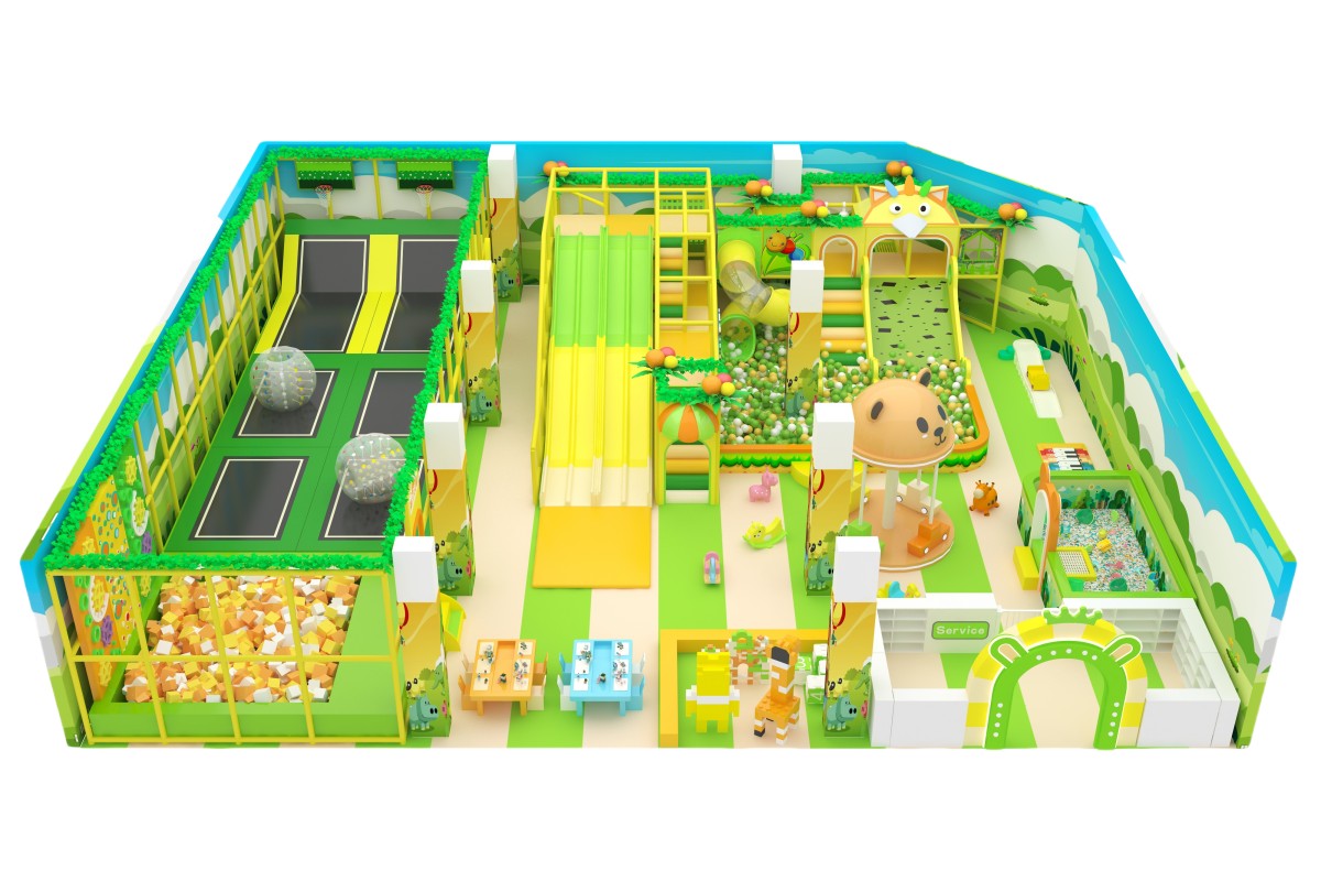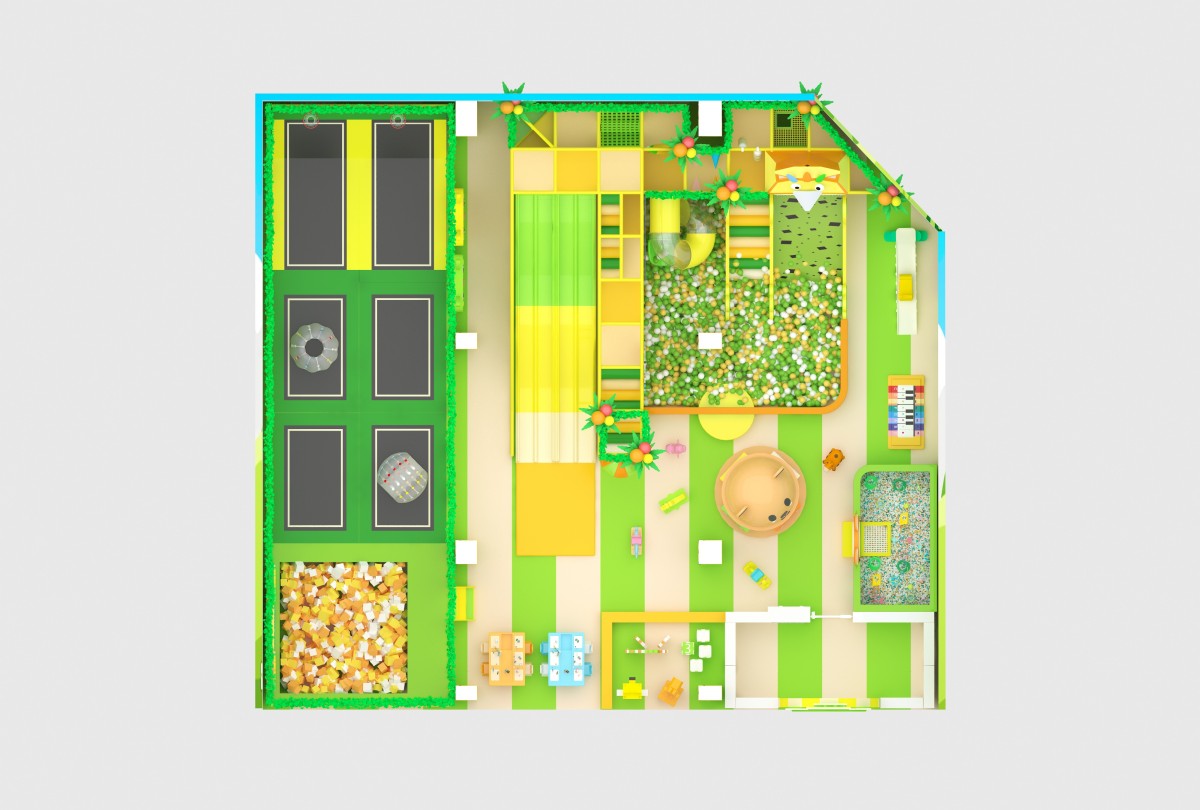 Set in a fresh palette of leafy green, lemon yellow, and off-white, this indoor playground features cloud and meadow murals with charming animal decals. On the left, the Activity Zone invites ages 3–8 to bound across four connected trampolines, roll inside transparent walking balls, and tumble safely in a foam-padded pit. At center, the Slide & Ball Pit Zone thrills ages 5–12 with three LED rainbow slopes, a wide spotted soft incline, and a clear tube slide dumping into a tri-color (black, white, green) ball sea. The right-side Play & Learn Zone delights toddlers (0–5) with a unicorn and panda carousel, wooden ride-on cars, block-building tables, and a mini-piano sand pit for sensory play. An open layout with low walls and soft flooring gives caregivers clear sightlines, while varied attractions cater to every age’s need for movement, imagination, and safe exploration.