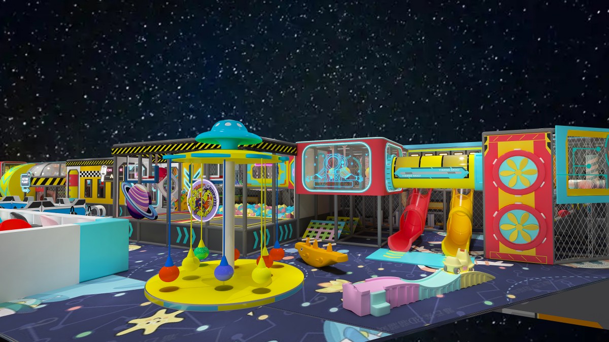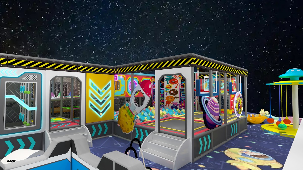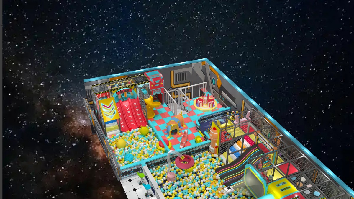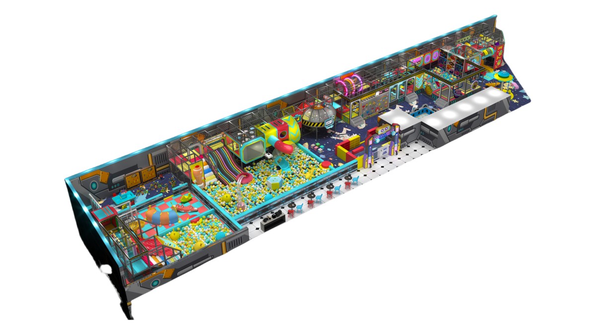 Themed around cosmic adventure, this indoor playground features a bright palette of yellow, sky blue and white accented with vibrant neon lighting for an immersive starry ambiance. The central ball pit, complete with a transparent UFO observation pod and multi-lane slides, serves as a visual centerpiece. Diverse zones—including a ninja challenge course, trampoline area, and toddler rockers—cater to children aged 2–12. A fully enclosed mesh structure guarantees safety, while the adjacent parental lounge offers unobstructed sightlines for constant supervision. Crafted from premium materials and precision-built, it ensures long-lasting durability and easy maintenance.