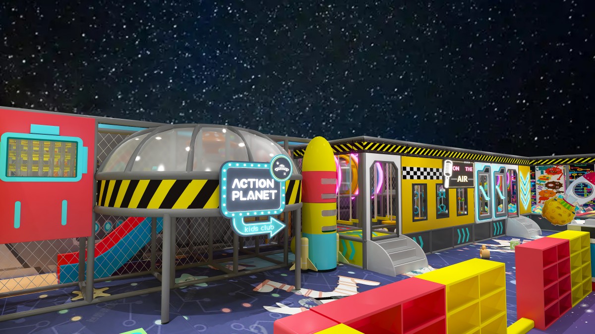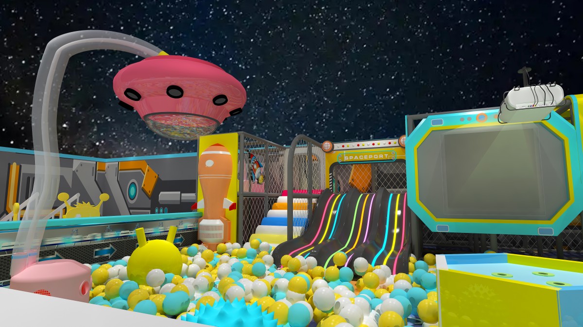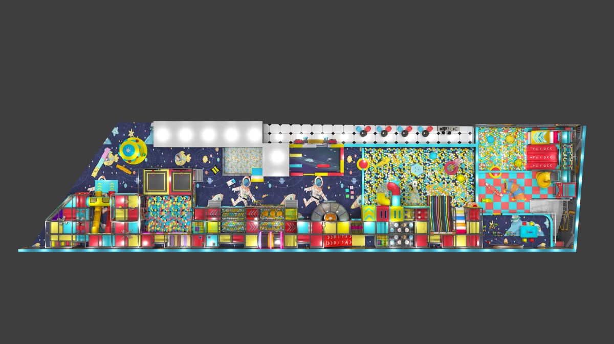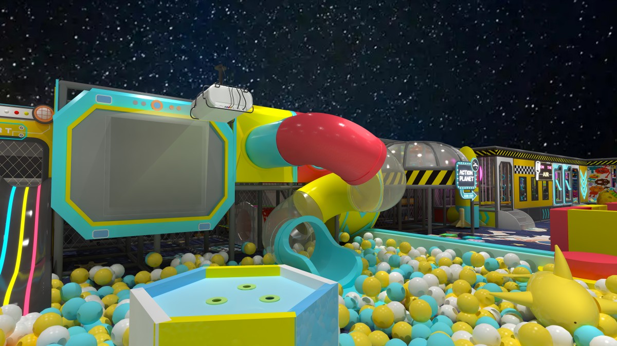 Themed around cosmic adventure, this indoor playground features a bright palette of yellow, sky blue and white accented with vibrant neon lighting for an immersive starry ambiance. The central ball pit, complete with a transparent UFO observation pod and multi-lane slides, serves as a visual centerpiece. Diverse zones—including a ninja challenge course, trampoline area, and toddler rockers—cater to children aged 2–12. A fully enclosed mesh structure guarantees safety, while the adjacent parental lounge offers unobstructed sightlines for constant supervision. Crafted from premium materials and precision-built, it ensures long-lasting durability and easy maintenance.