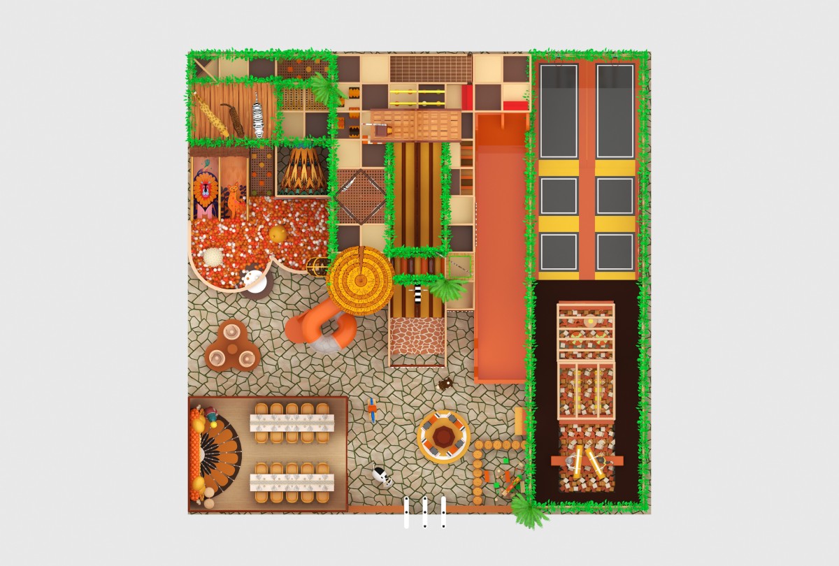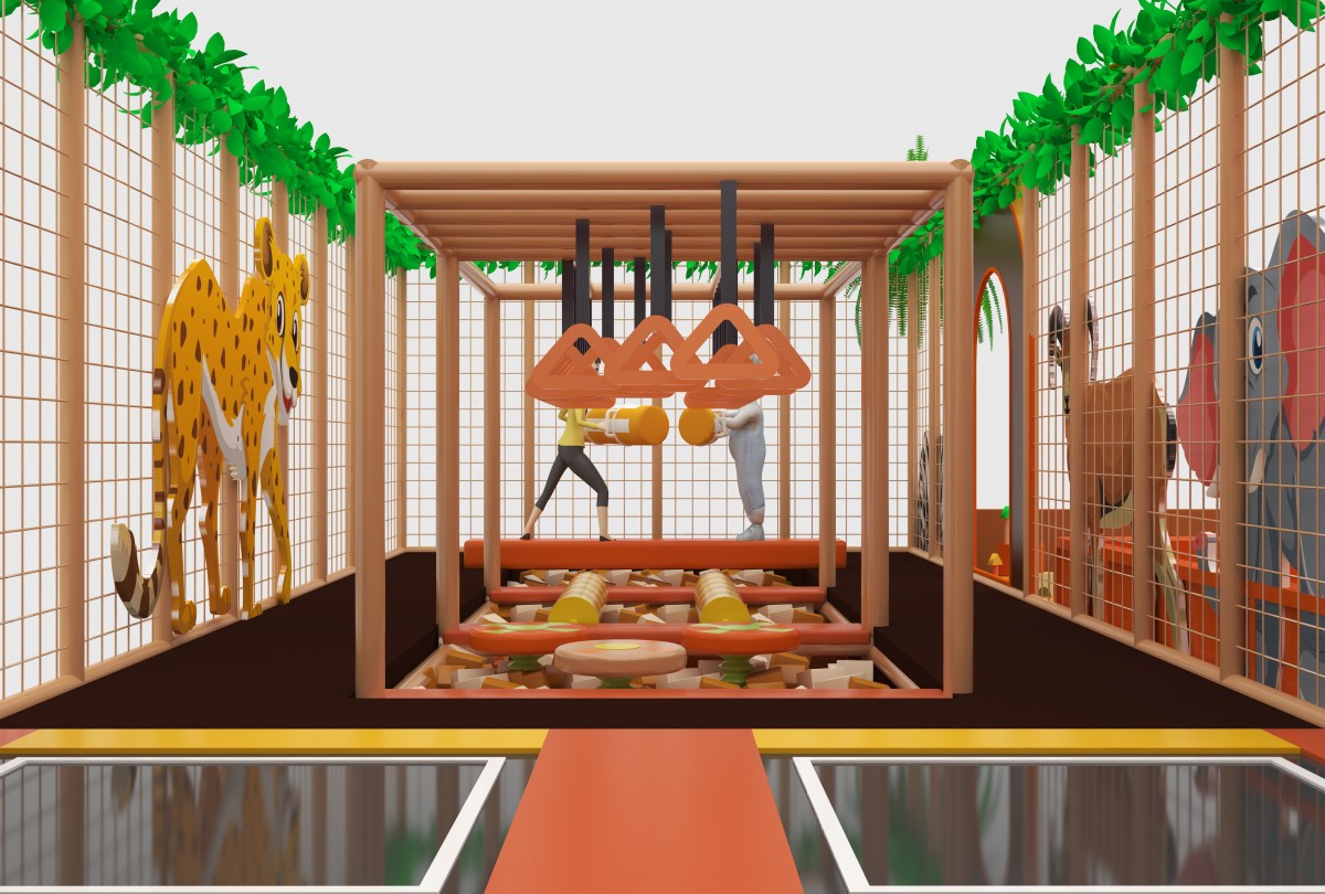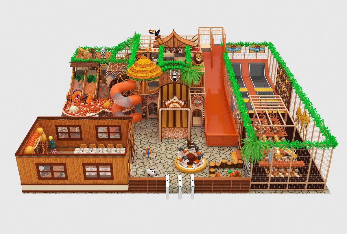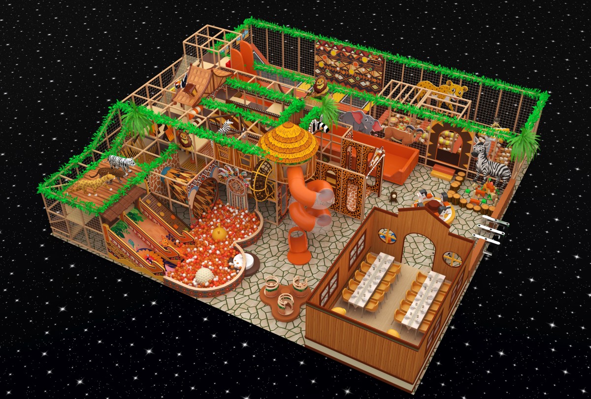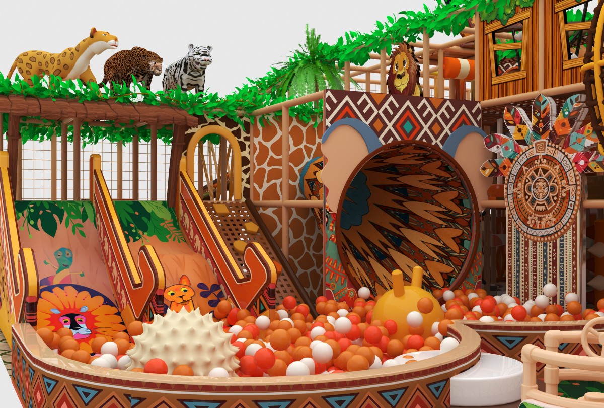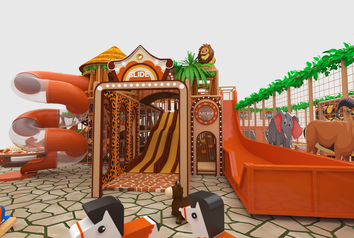 Inspired by the African savannah, this indoor playground combines warm wood tones and vibrant oranges with lush greenery and lifelike lion, zebra, and giraffe figures to create an immersive safari adventure. Multiple straight and spiral tube slides, rock-climbing walls, and net tunnels intertwine across several levels, inviting kids to explore and conquer new heights.