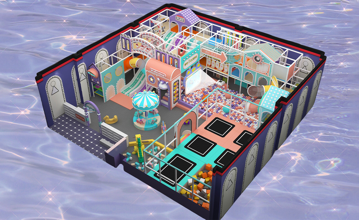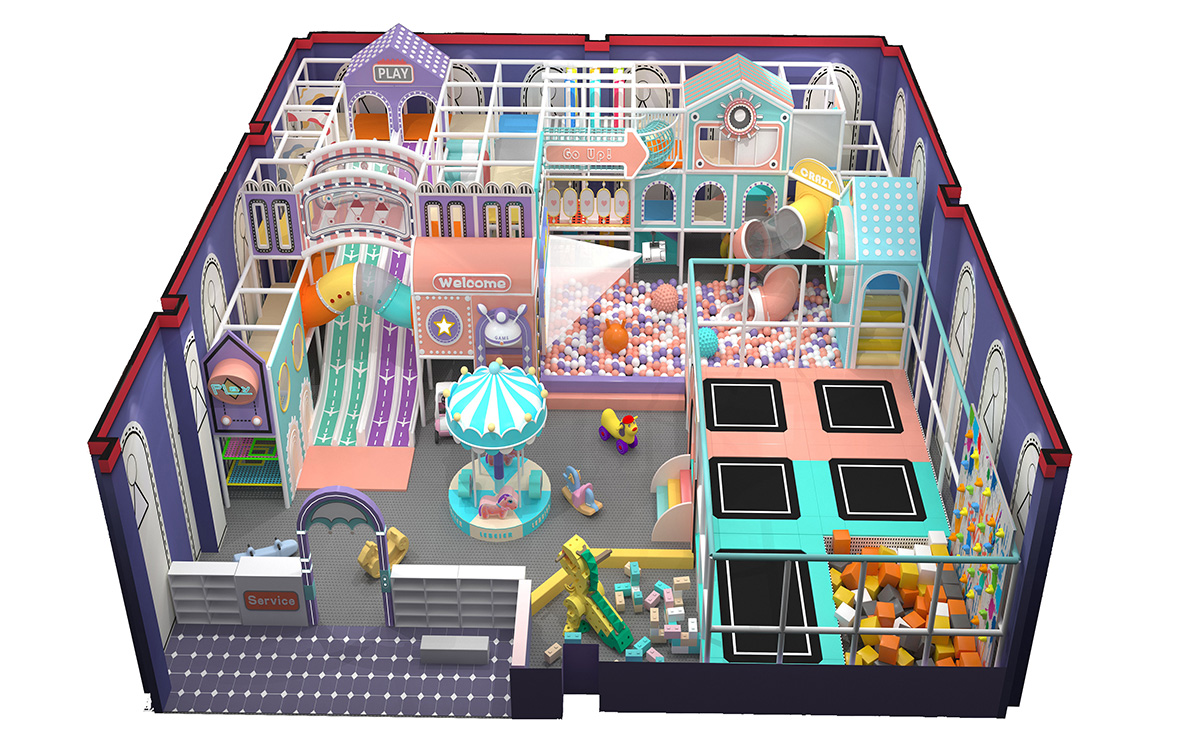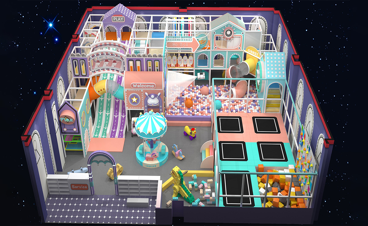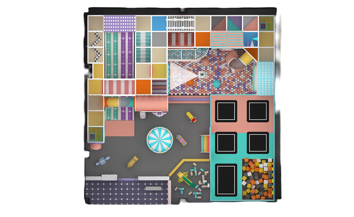 This pastel-hued playground features a three-level playhouse perfect for kids to chase and conquer every corner. They can climb up towers, race down a wavy high slide, or a transparent spiral tube slide into a fancy ball pit, then bounce on trampolines, scale a climbing wall or zoom through a foam block pit. A carousel, block area and service-bar seating complete the open layout. The lighting would shine through every corner.
