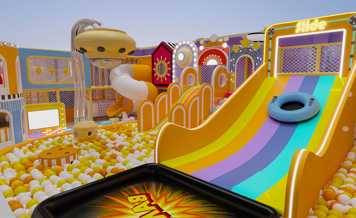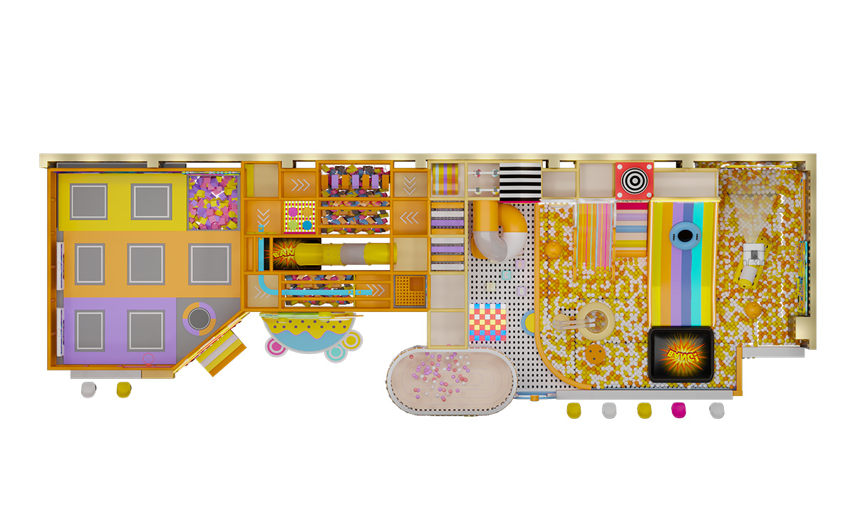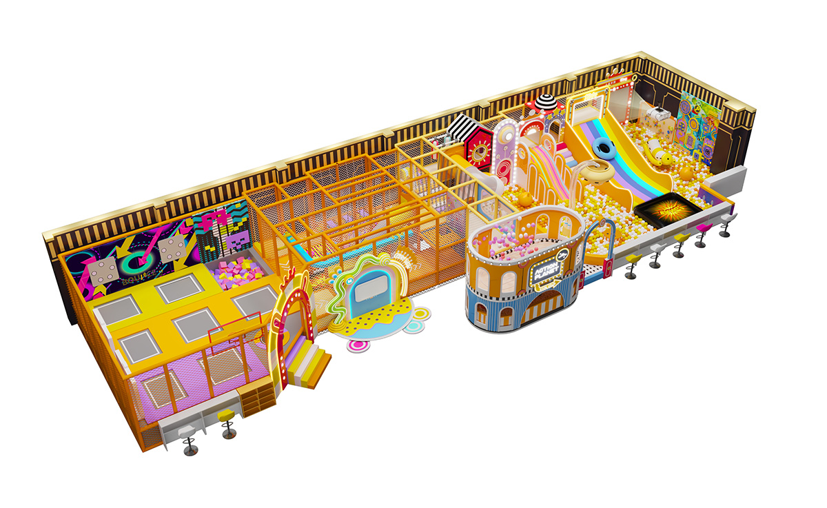 This L-shaped indoor playground features multiple rainbow racing slides and spiral tube chutes, with a series of obstacle-challenge elements—ninja rings, rope bridges, climbing walls—running throughout. A trampoline zone, an interactive game screen, a foam pit and a vibrant ball pool complete the layout. Bold gold accents paired with lively rainbow hues create a striking visual. The abundant slides and challenge courses not only ignite kids’ curiosity but also enhance balance and coordination, making it perfect for 3–12 year-olds to explore, compete and socialize.