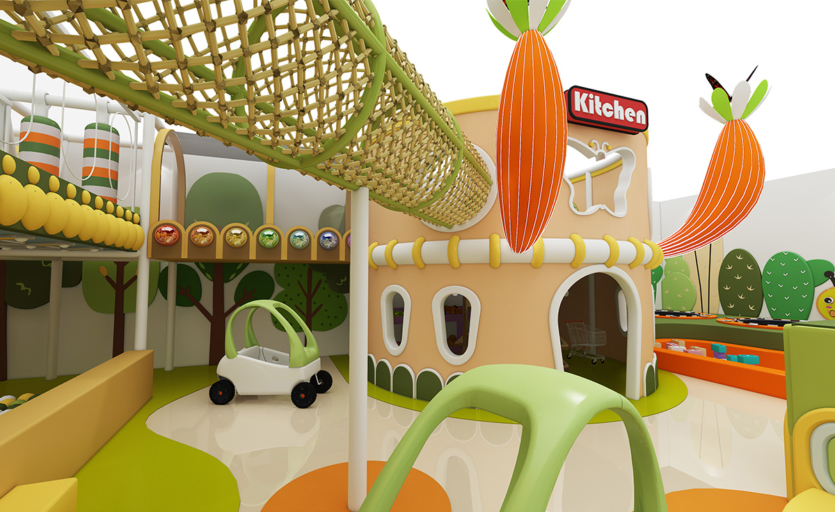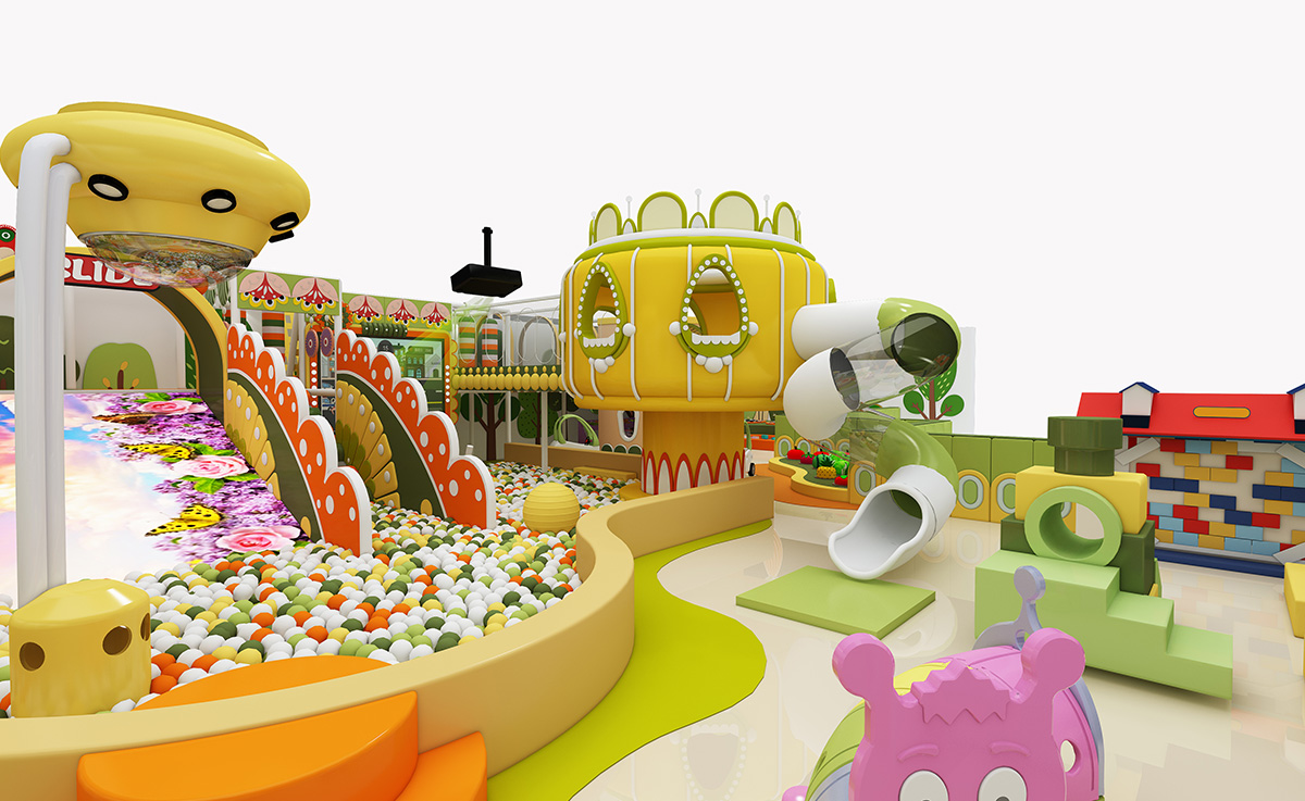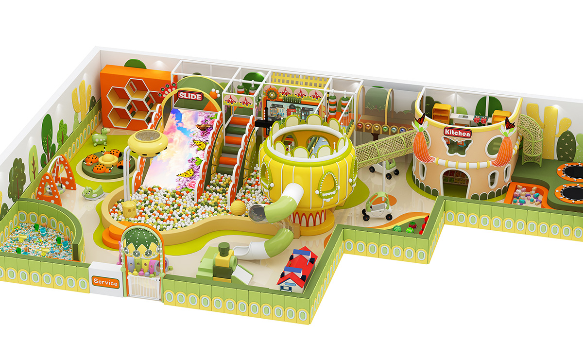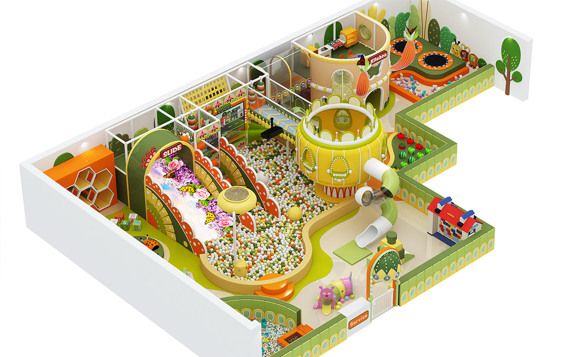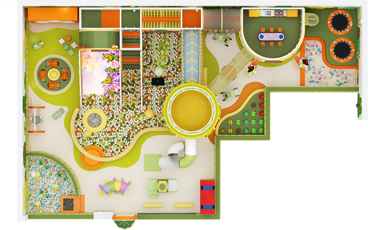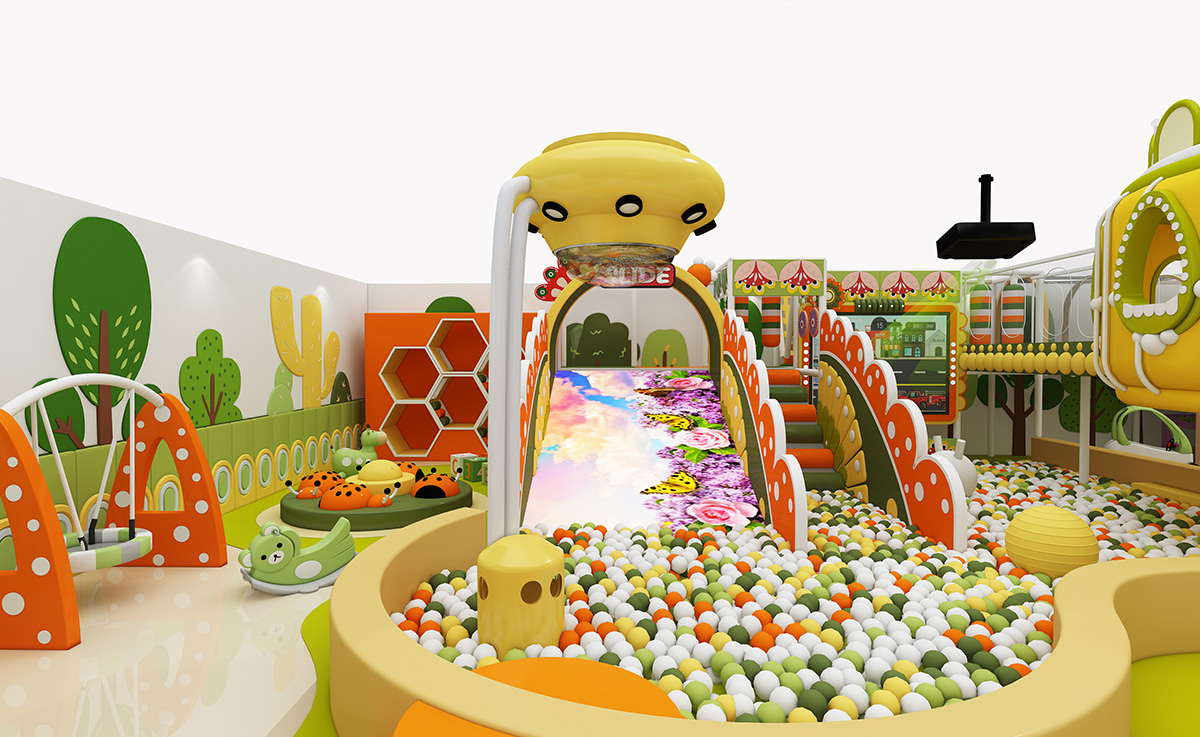 This playground design' embraces a forest theme with soft yellow, green, and orange hues set against playful tree murals, creating a warm, natural ambiance. Clearly defined zones cater to all ages: a soft ball pit and block area for toddlers encourage early sensory play; a central interactive slide and colorful ball pool ignite active fun; climbing structures and mesh tunnels offer balance and teamwork challenges; while a role-play kitchen and jumping zone spark imagination and social interaction.