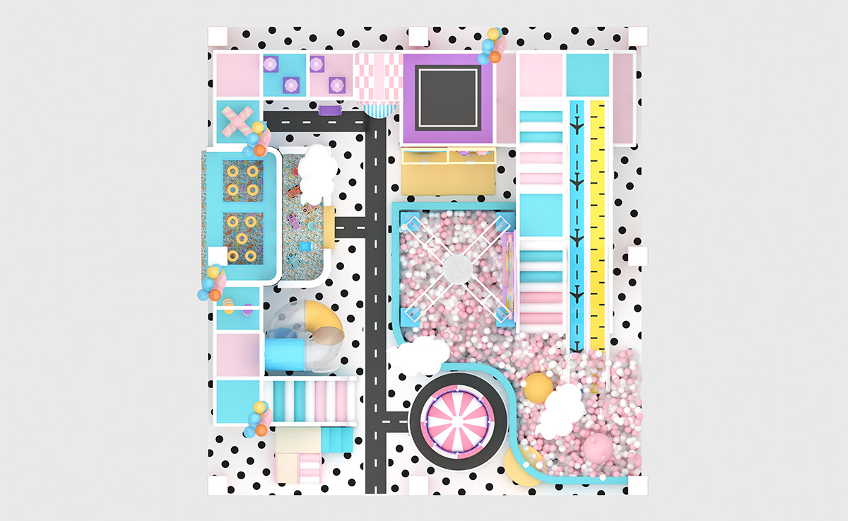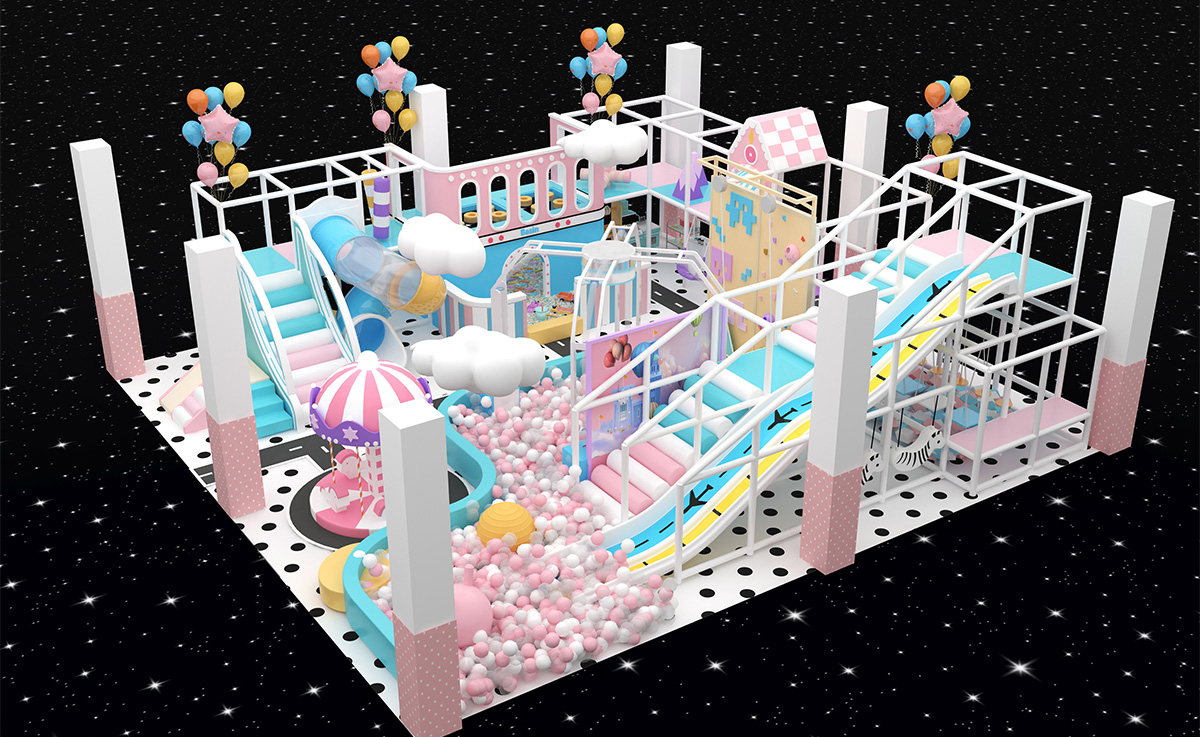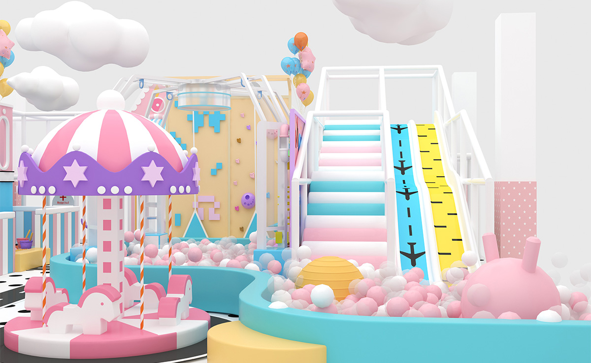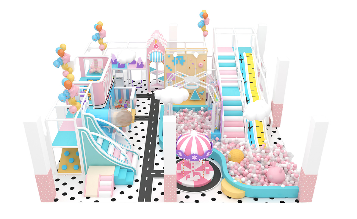 This candy-carnival indoor playground uses pastel pink, blue, and yellow tones, dotted floors, clouds, and balloons to create a magical atmosphere, offering slides, a climbing tower, mini carousel, ride-on road, fishing sand pit, and role-play houses all in one.