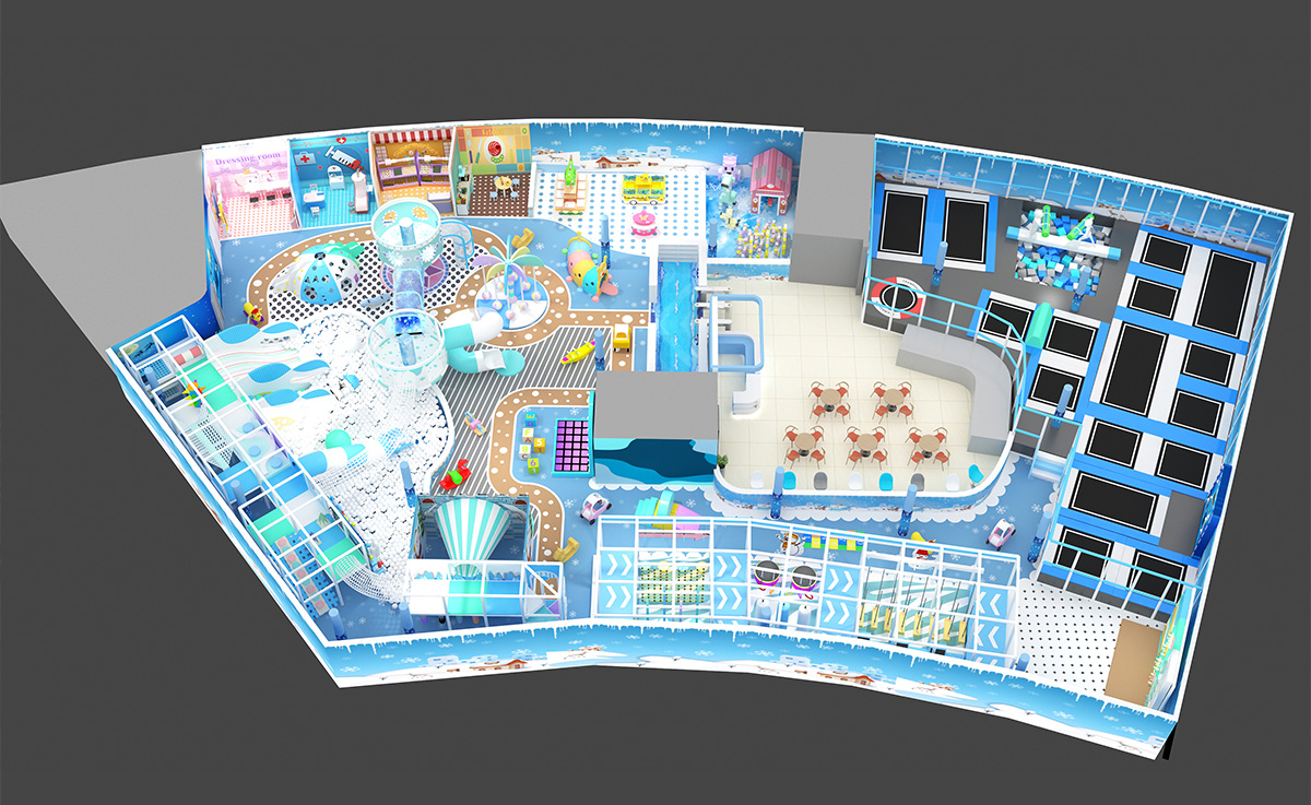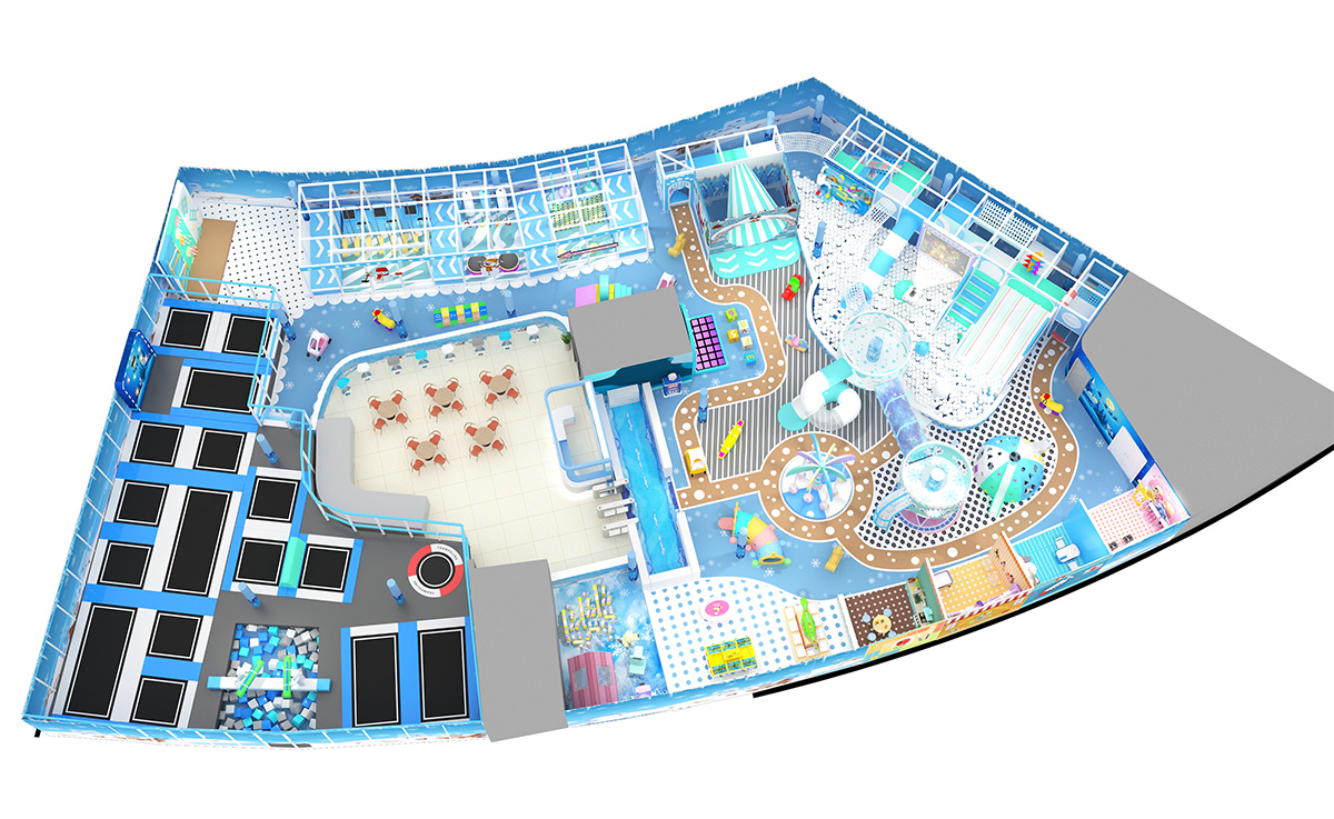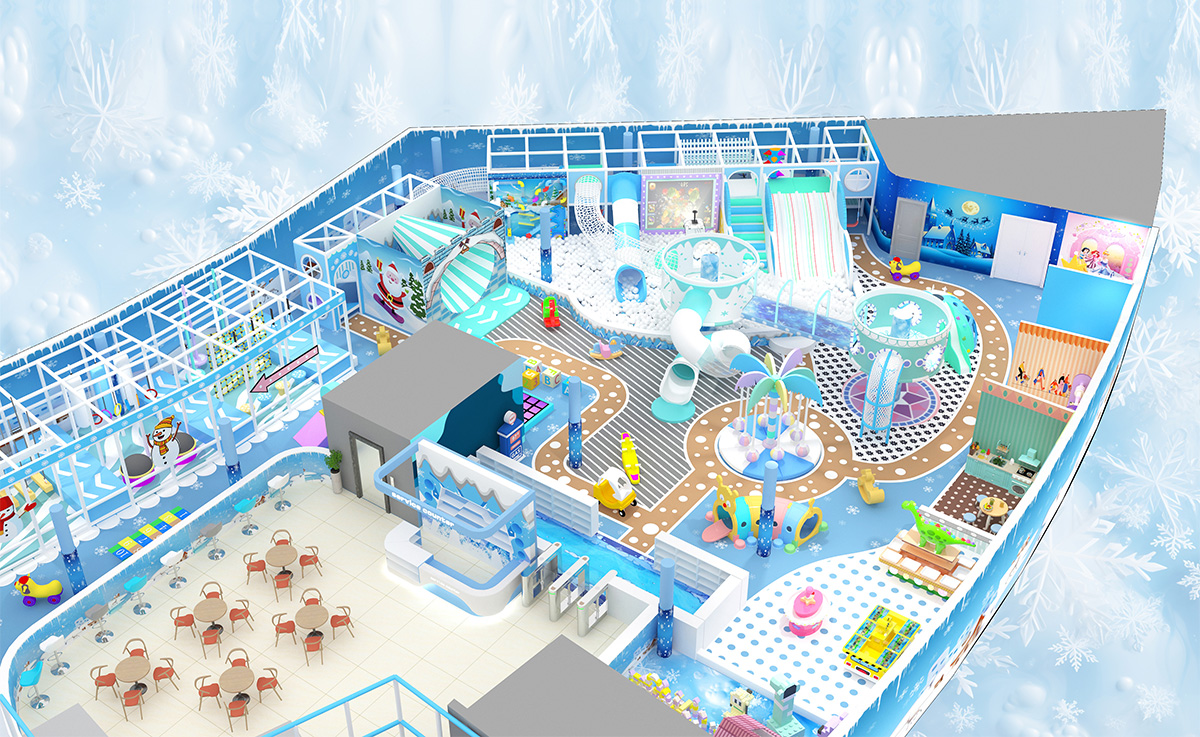 This indoor playground brings a winter fairy-tale to life with a fresh palette of icy blue and pure white, accented by soft pastel highlights for an immersive snowland ambiance. A central ball pit and crystal-clear tube slides anchor the experience, while dedicated zones—from trampolines and foam oceans to role-play cottages and toddler soft-play—cater to ages 2–12. Secure mesh fencing and an adjacent parental café ensure clear sightlines and peace of mind.