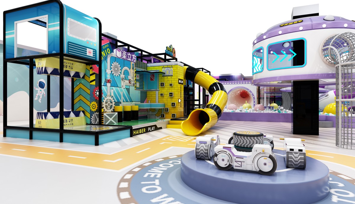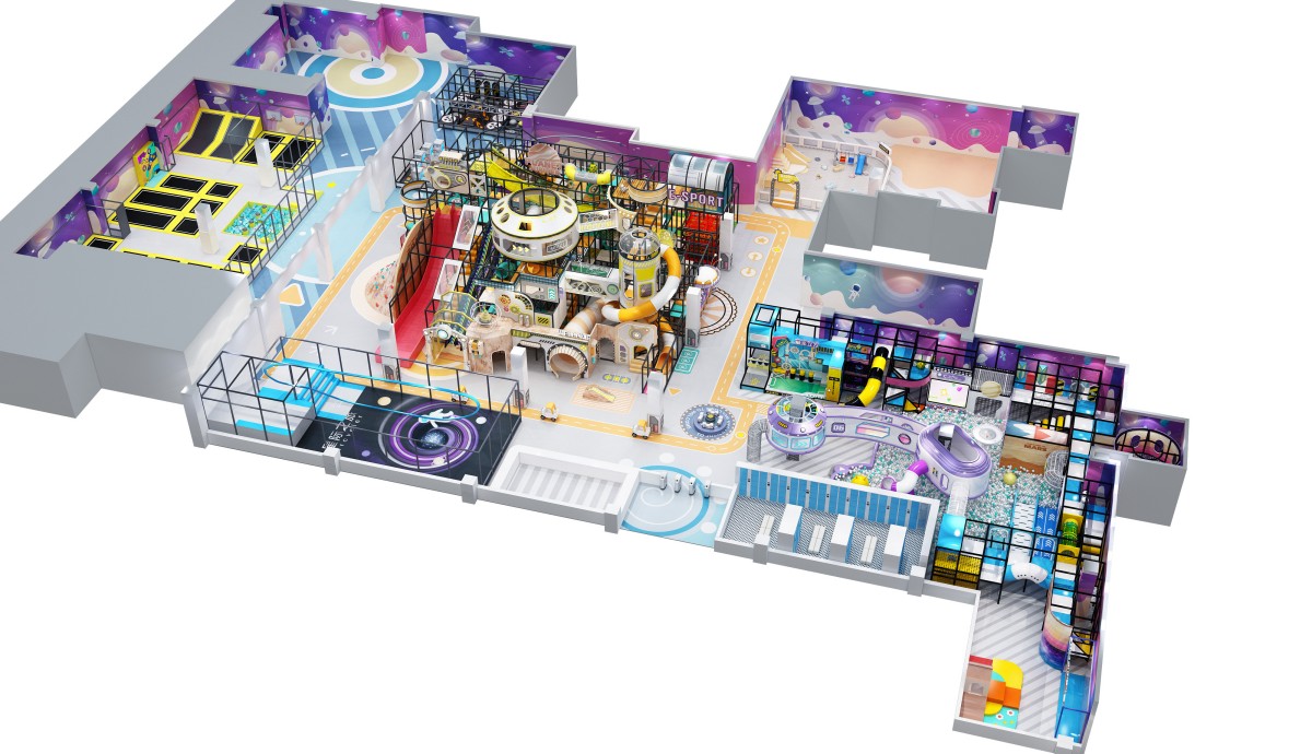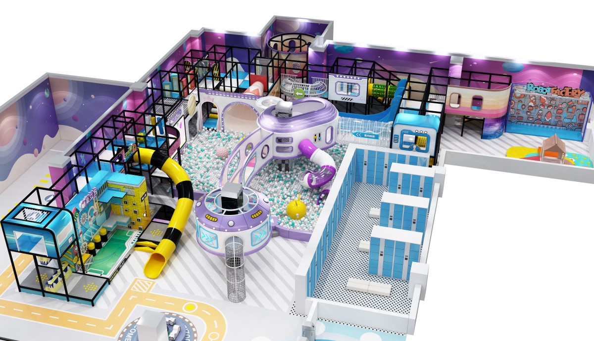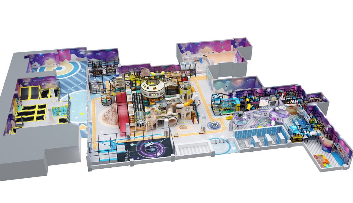 Inspired by a "space adventure" theme, our playground uses vibrant purples, whites, and yellows to create a dreamy atmosphere that’s both dynamic and fun. Kids can bound freely in the spacious trampoline area or test their courage and speed on multi-level slides and climbing slopes. The giant ball pit and spinning discs add joyful interaction, while the aerial rope maze hones balance and bravery. With a quiet building-block zone and exploratory sandpit, it also caters to each child’s curiosity and creativity.