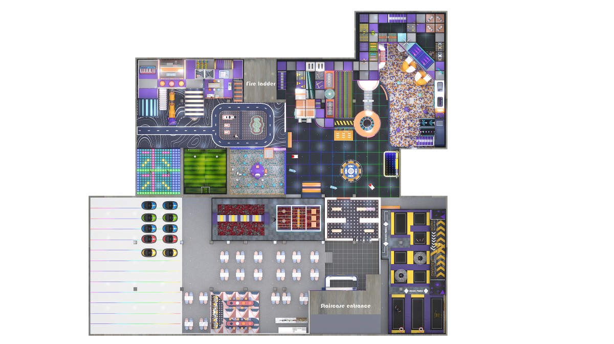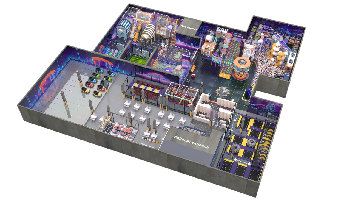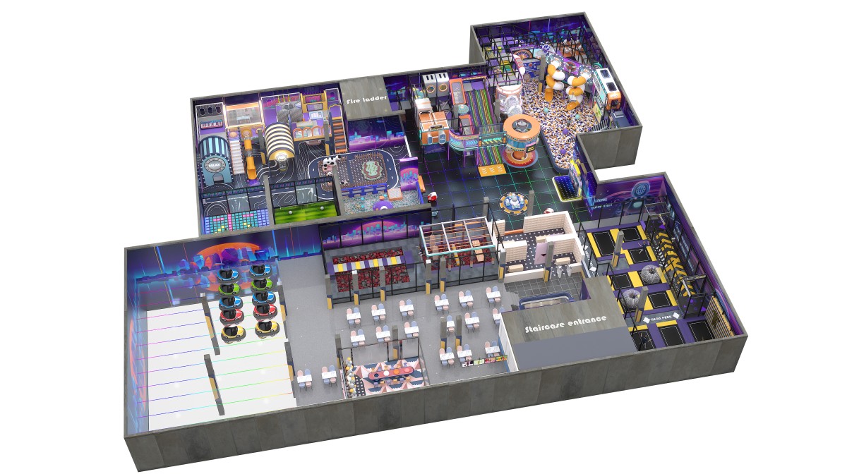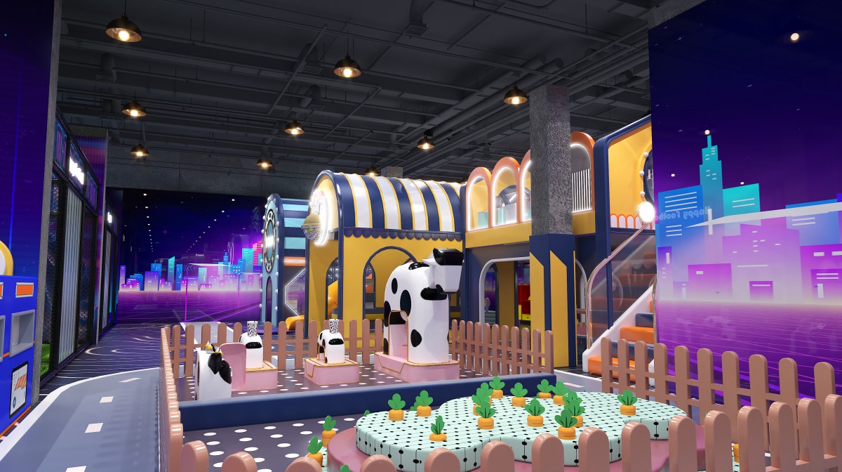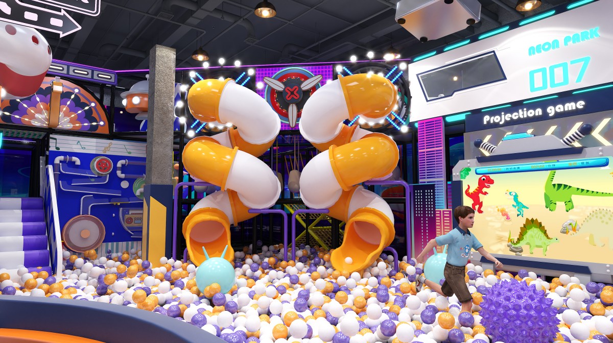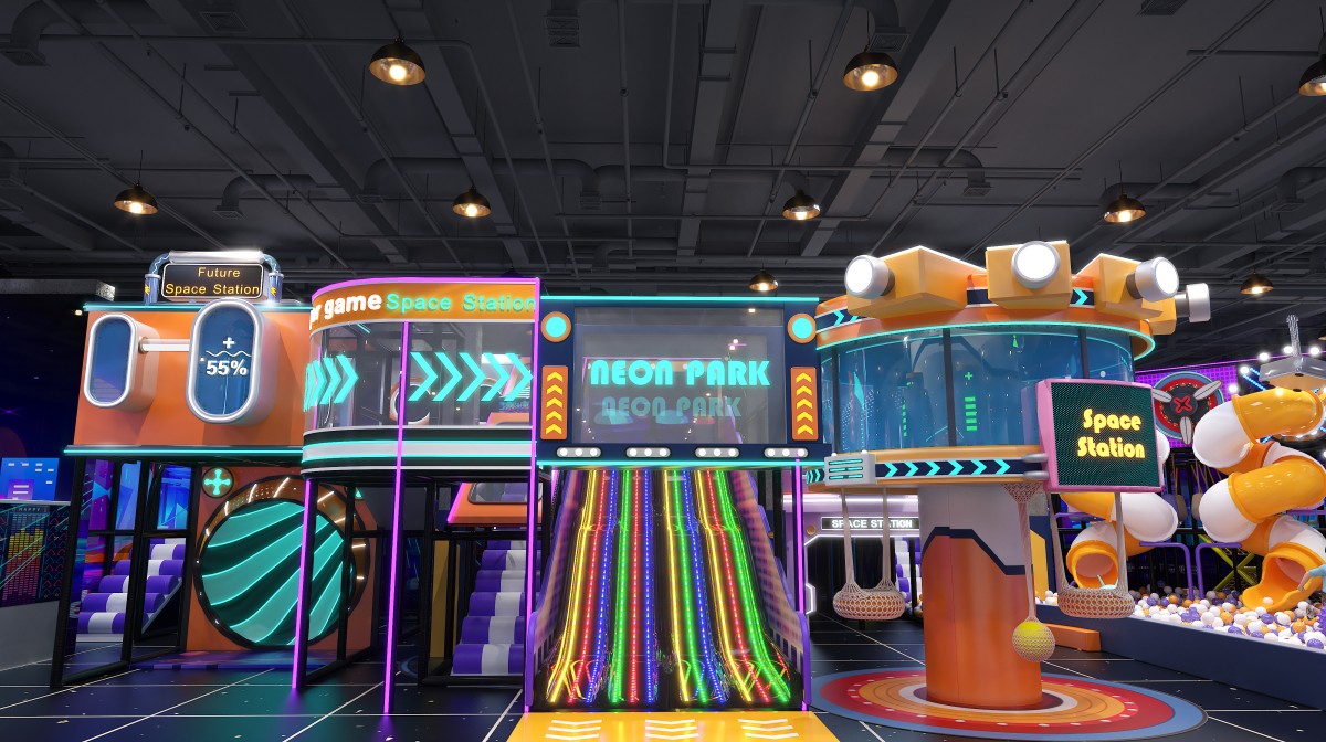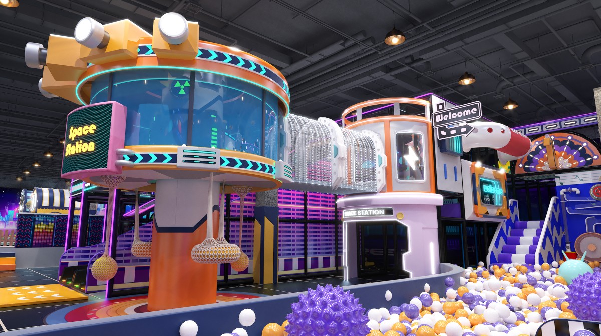 Star Sailor is a two-level, neon-lined indoor playground built around a glowing cylindrical “super game” control tower, linked by transparent tube tunnels and a rainbow-lit three-lane slide that spills into a purple-orange ball pit dotted with spiky sensory orbs and hanging net pods. Interactive projection panels, foam-pillar obstacle zones, rope bridges, and mesh-encased climbing nets surround a three-lane LED slide and spiral tube chutes, all set against black-and-white grid flooring embossed with glowing arrows. A pastel-fenced toddler corner, complete with carrot-shaped stools and cow ride-ons, ensures safe creative play, while overhead industrial fixtures and chrome accents heighten the futuristic, “space station” atmosphere.