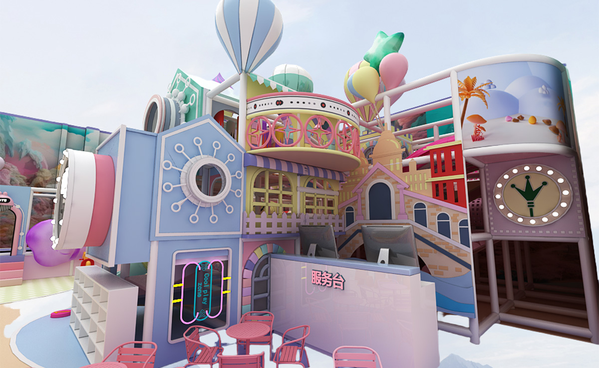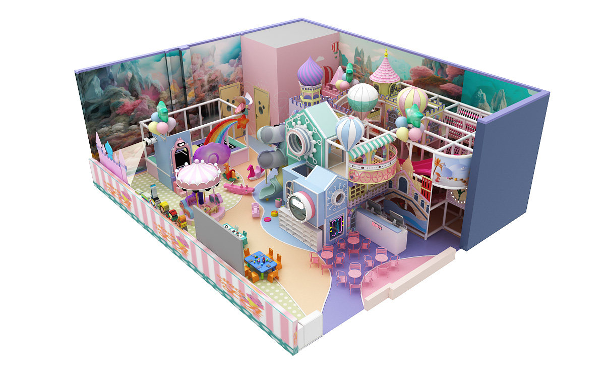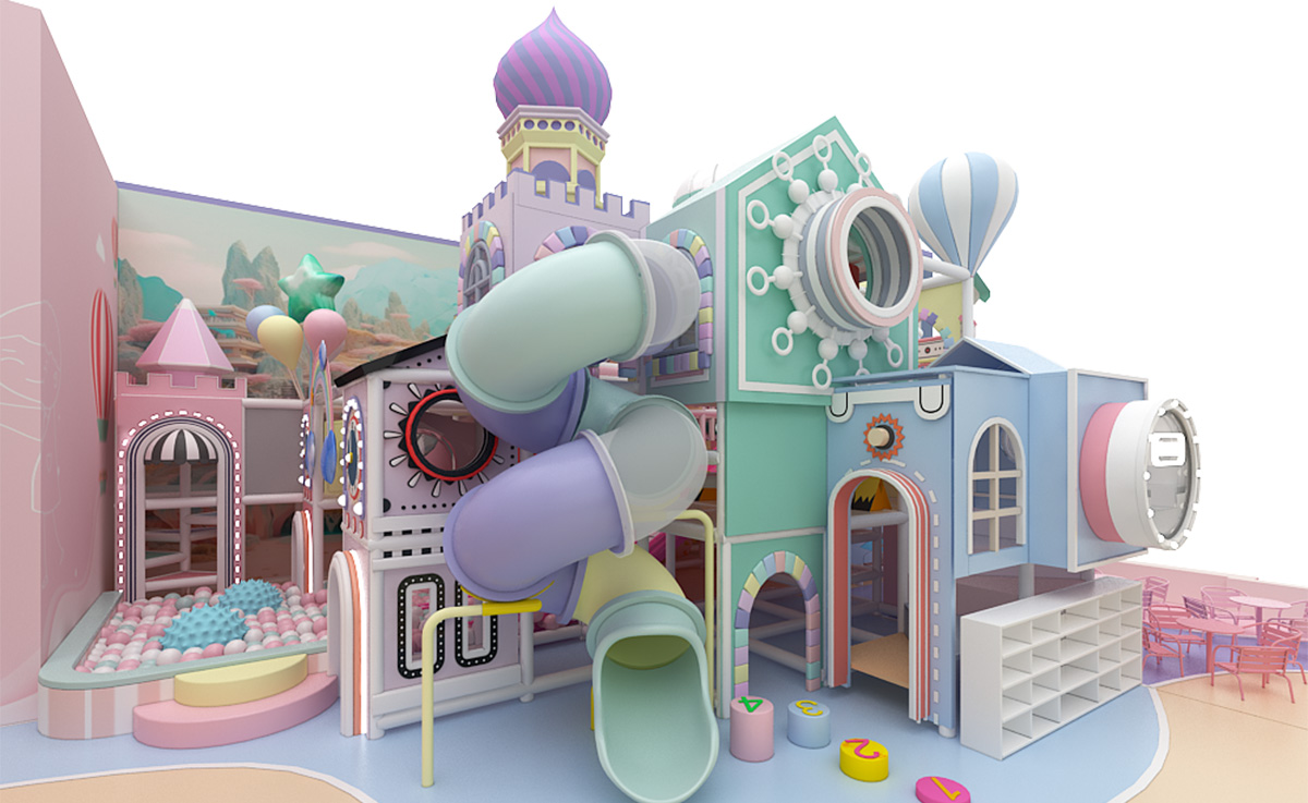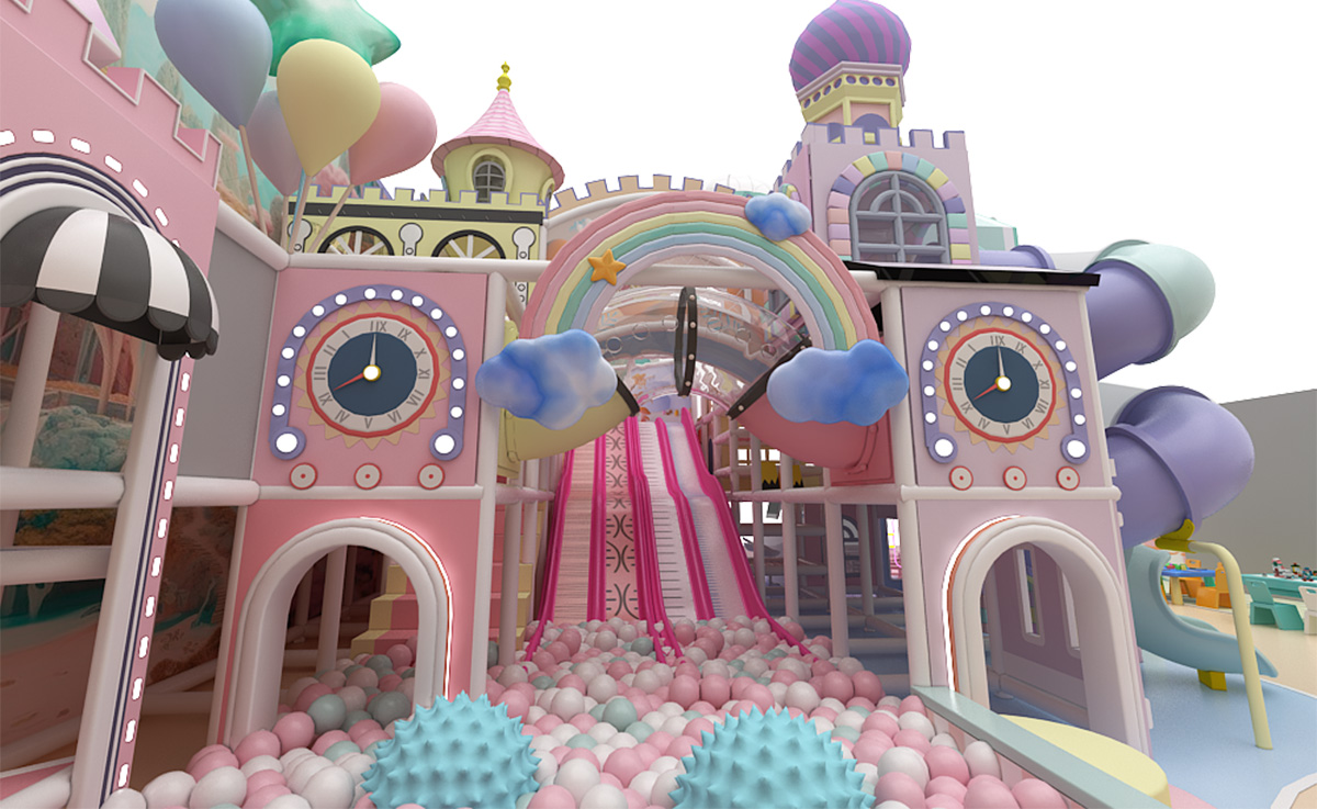 Discover Castle with Russian structure feature: A pastel-lit, multi-level castle where children climb fairytale towers, then zoom down a spiral tube slide or one of three straight chutes into a rainbow ball pit; ride a mini-carousel, dance on a giant piano-key floor and dig in a soft-play sandpit, while the toddler corner with rocking horses, 360° safety nets, padded surfaces and a parent lounge by the service desk keep every adventure safe and worry-free.
