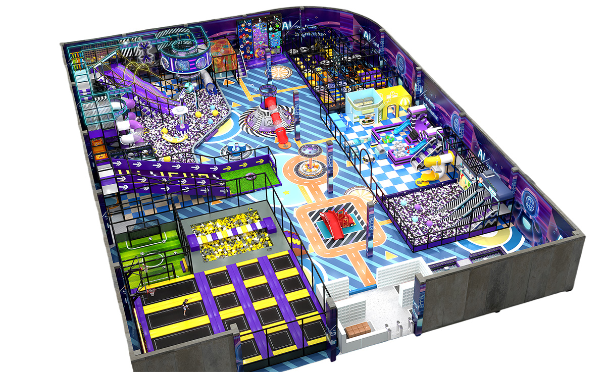 Styled in a sleek neon-purple and navy palette, this playground delivers a cutting-edge, futuristic vibe from the moment kids step through the entrance. A vibrant trampoline and foam-pit area with mini basketball and soccer stations lets little ones burn off energy and build motor skills. At its heart, a multi-level adventure structure combines a rainbow slide, spiral tubes, an oversized ball-pit island, spinning UFO, and rope-climbing challenges for boundless thrills. A dedicated toddler corner features a mini market and café for role-play, craft tables, and pint-sized slides that spark creativity and social play. Alongside, an arcade zone of claw machines and coin-ops sits beside a cozy café bar where parents can relax while keeping a watchful eye.