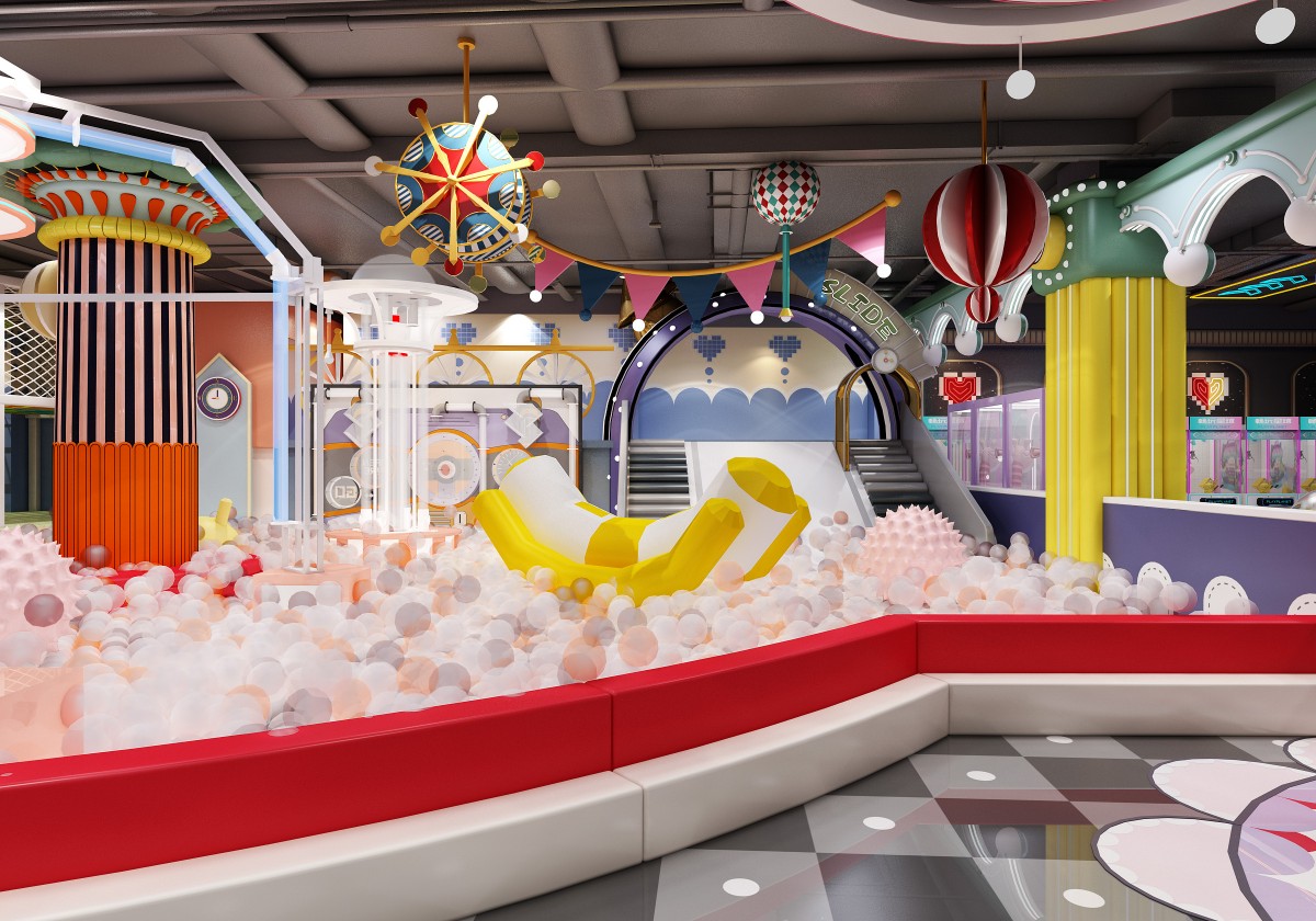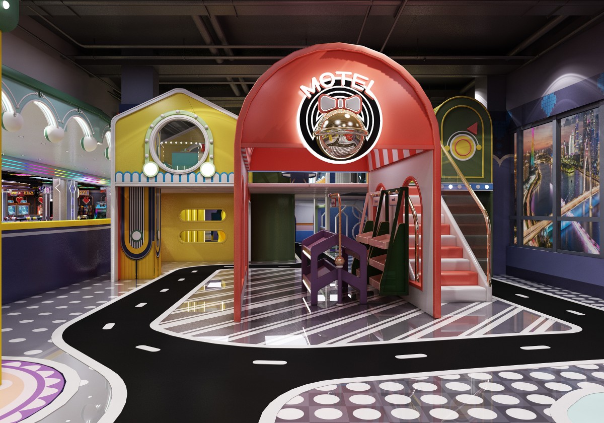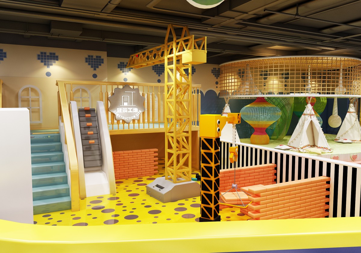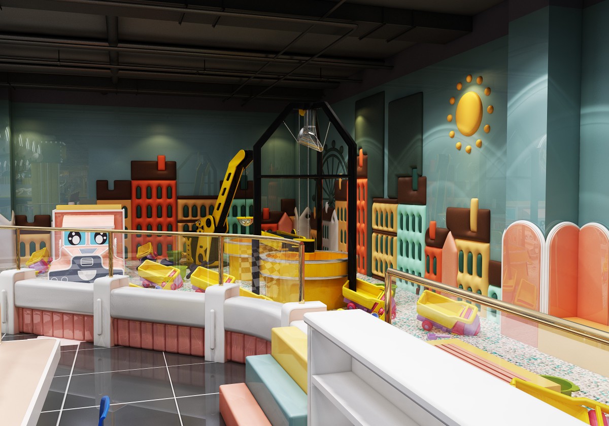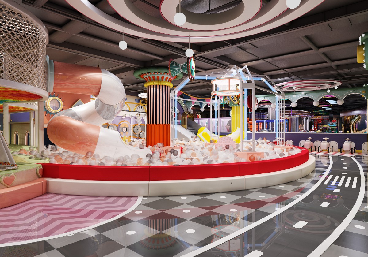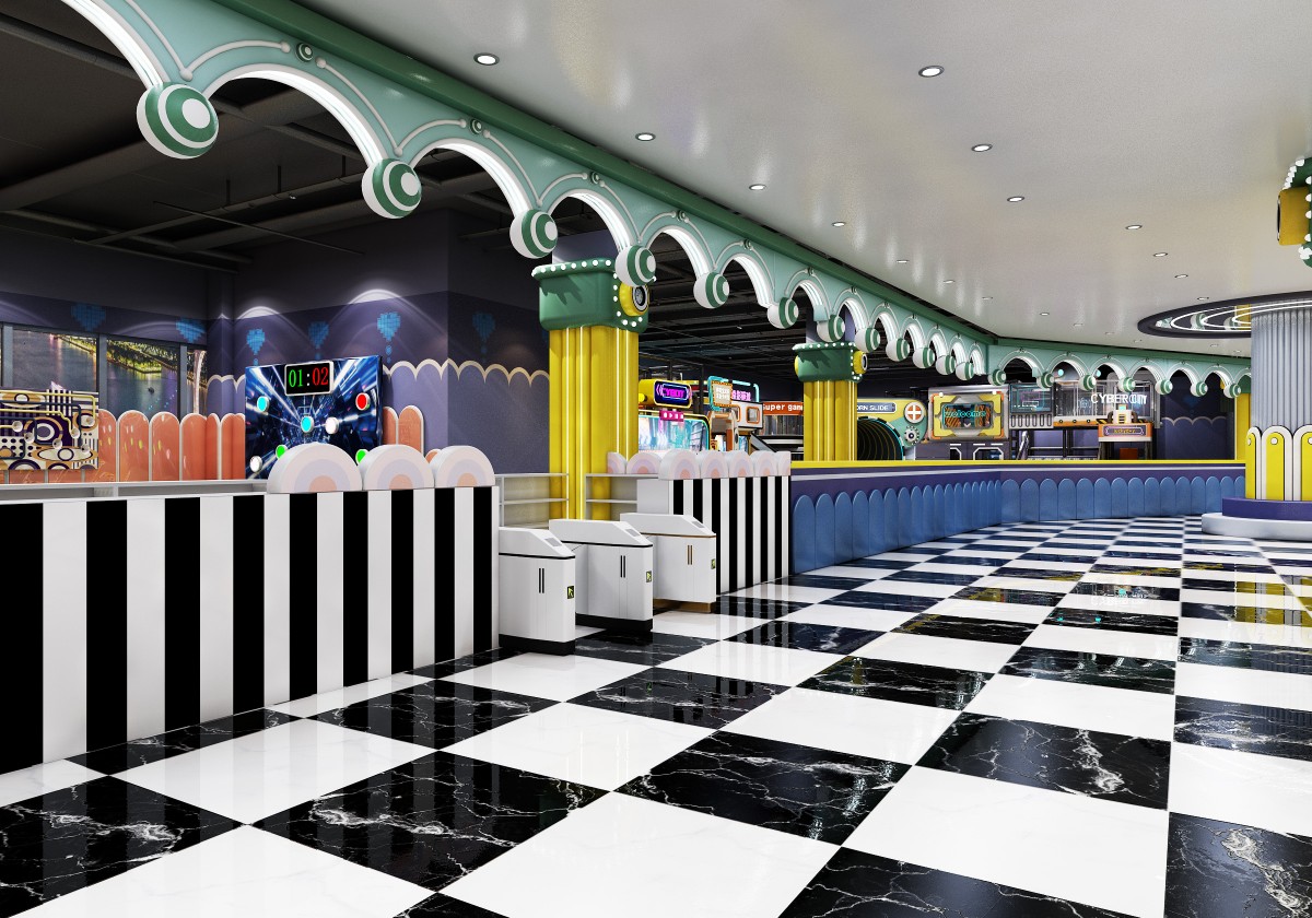 This children’s playland features a versatile multi-zone design with bold pops of pink, yellow and blue set against black-and-white checker accents, creating an exciting yet cozy atmosphere. Highlights include a dedicated arcade area stocked with interactive game machines, rainbow slides flowing into ball pits, a mini construction play set, carousel rides and track car circuits. A comfortable bar-style lounge lets parents relax while keeping an eye on the fun. With smooth traffic flow and activities tailored for ages 0–12, it perfectly blends adventure, interactive challenges and family bonding to ensure every visit is a fresh delight.