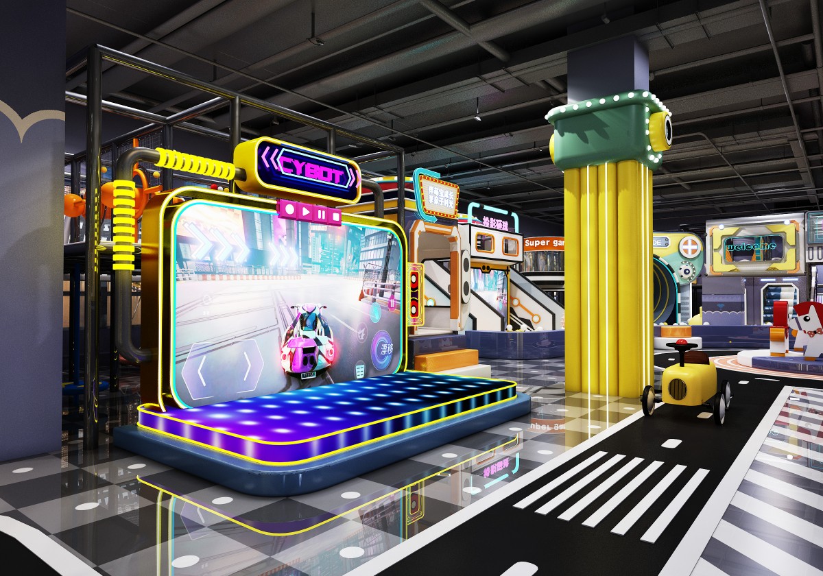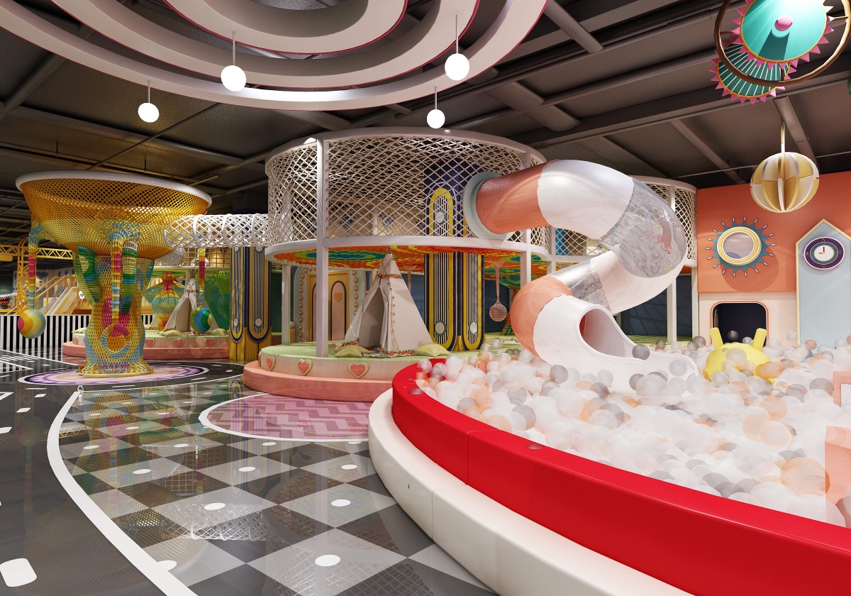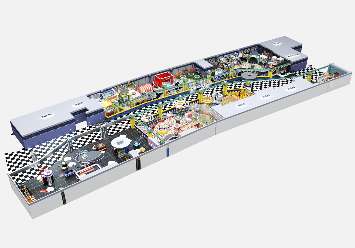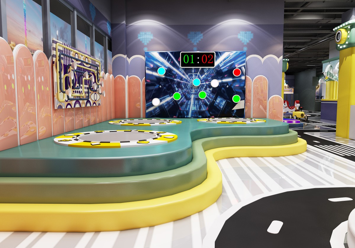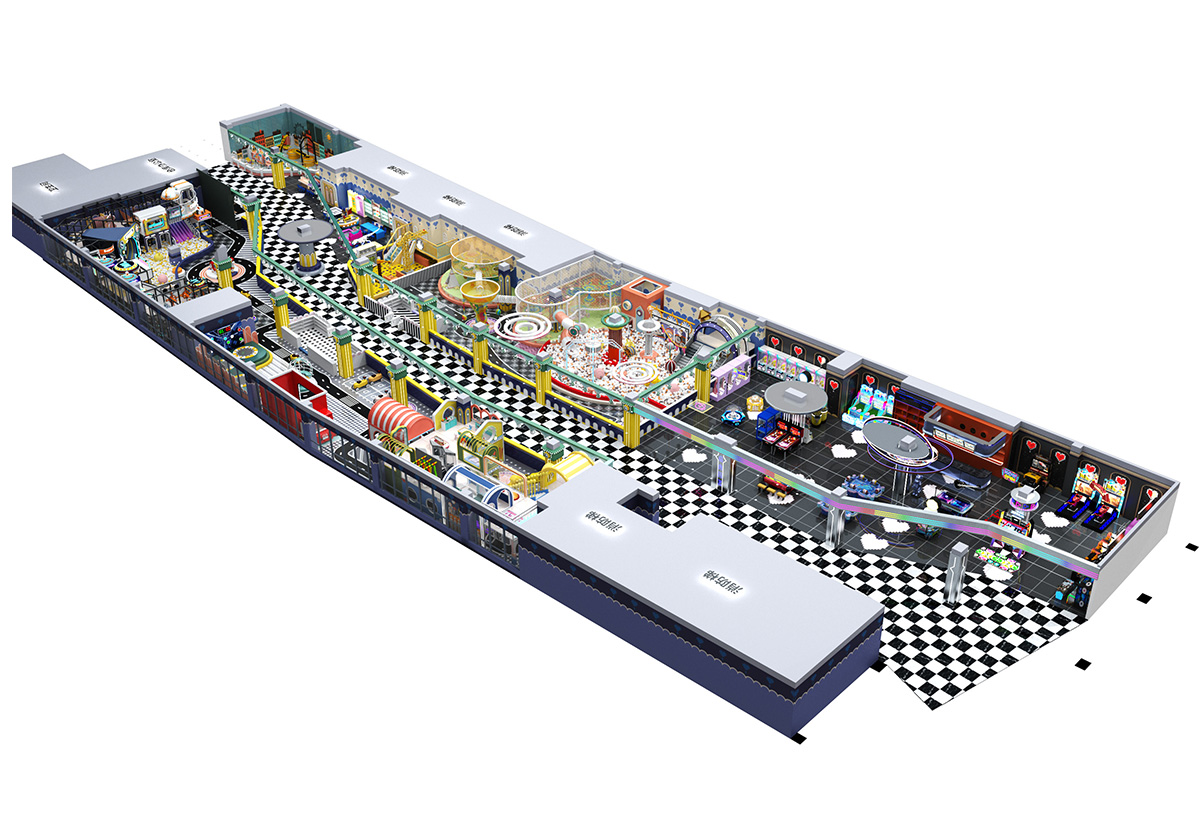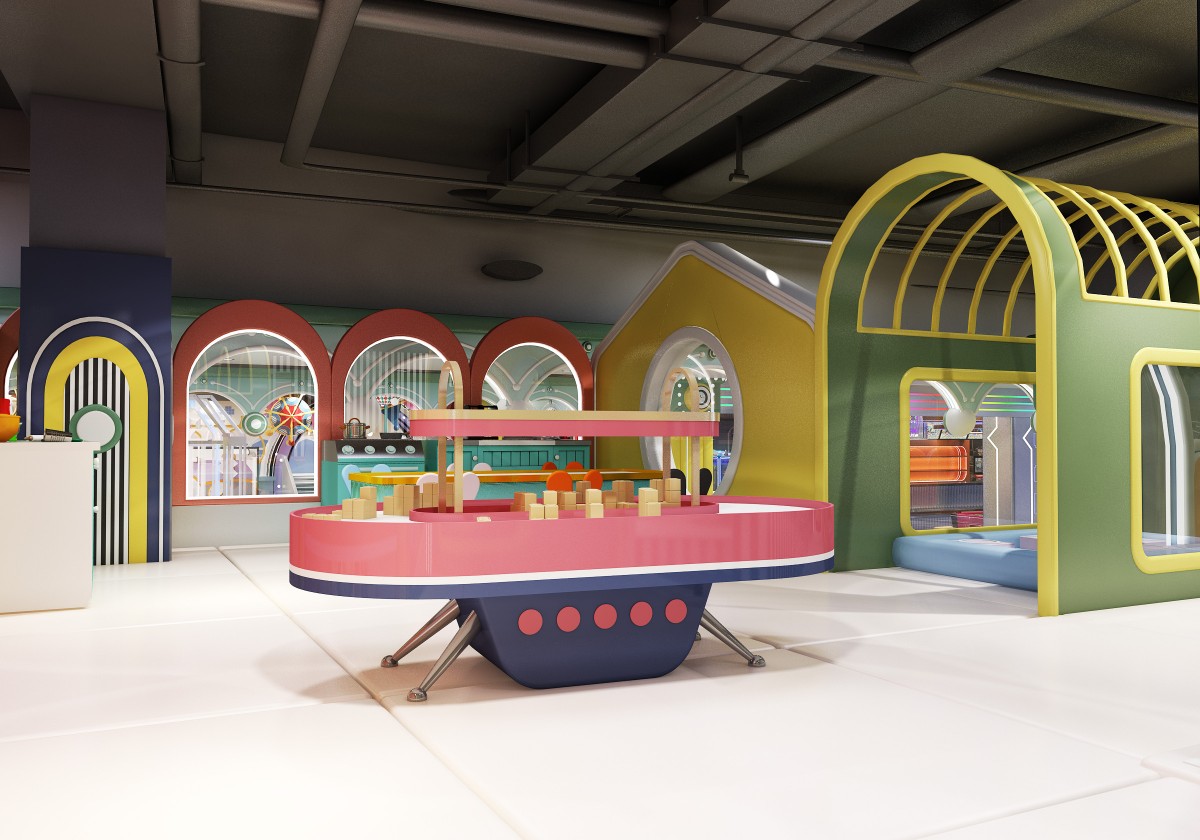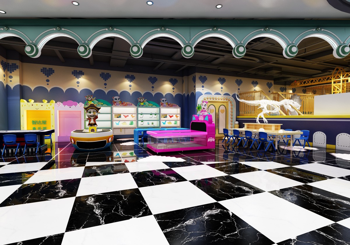 This children’s playland features a versatile multi-zone design with bold pops of pink, yellow and blue set against black-and-white checker accents, creating an exciting yet cozy atmosphere. Highlights include a dedicated arcade area stocked with interactive game machines, rainbow slides flowing into ball pits, a mini construction play set, carousel rides and track car circuits. A comfortable bar-style lounge lets parents relax while keeping an eye on the fun. With smooth traffic flow and activities tailored for ages 0–12, it perfectly blends adventure, interactive challenges and family bonding to ensure every visit is a fresh delight.