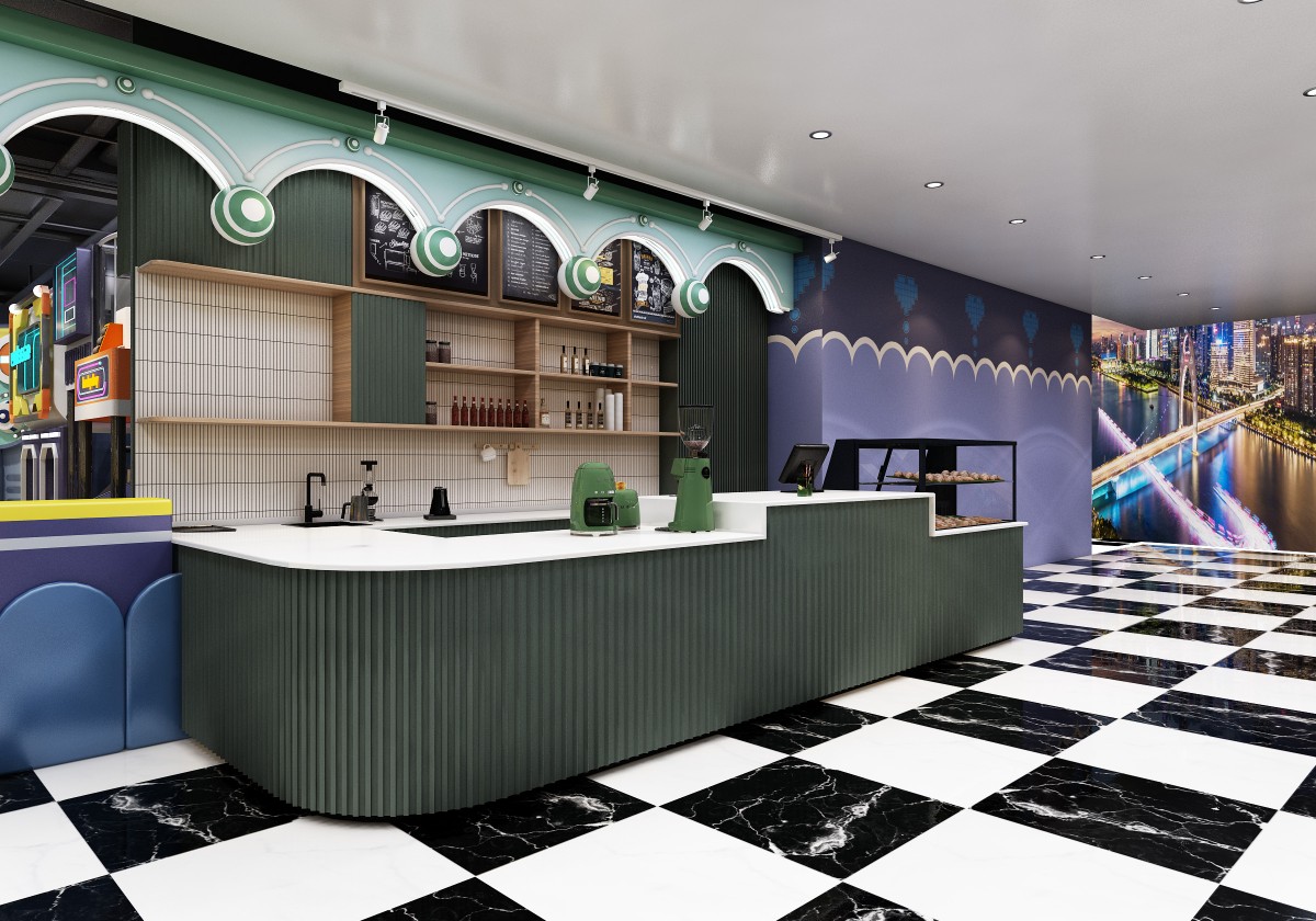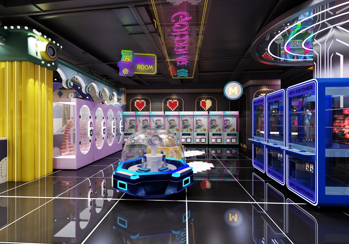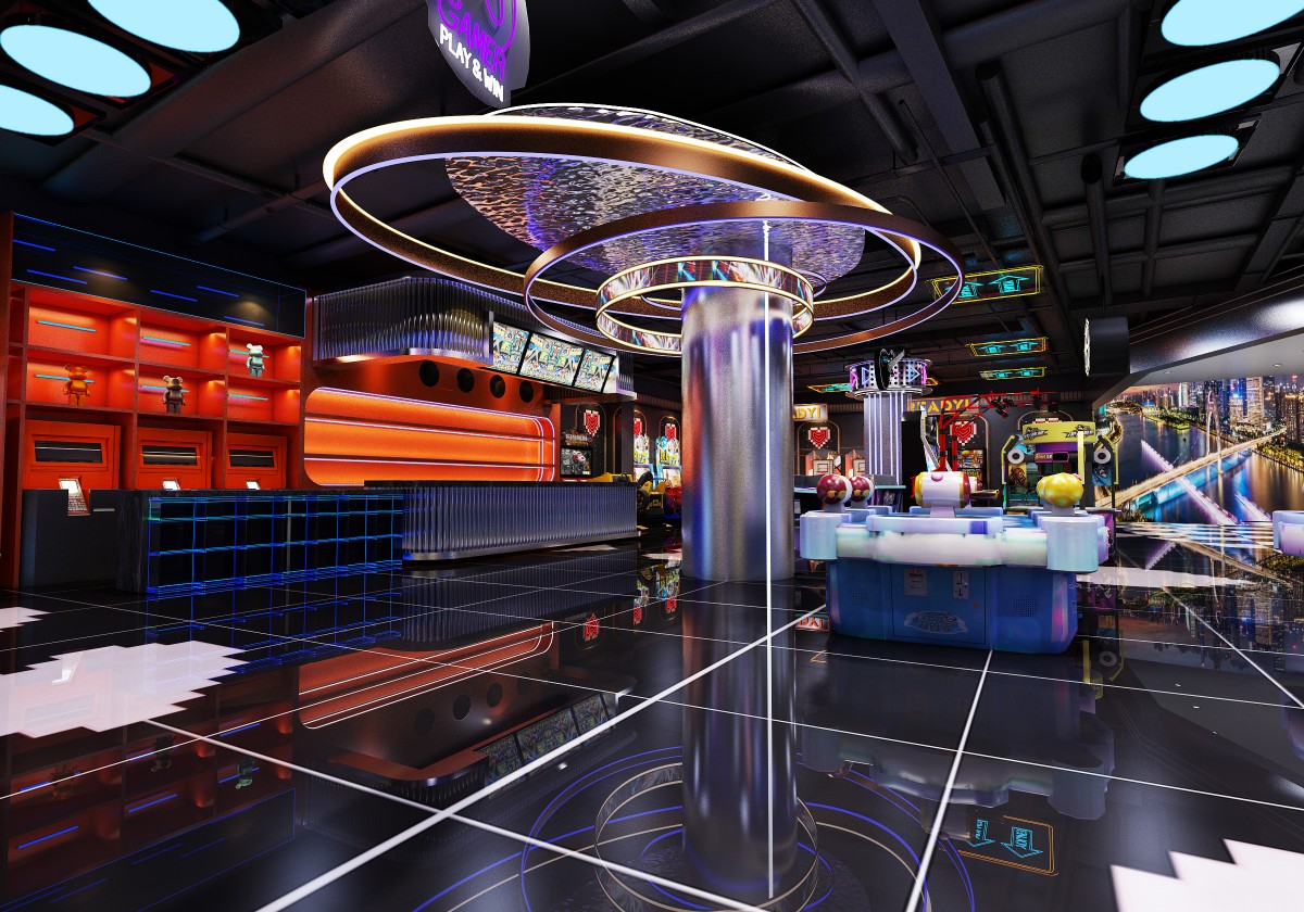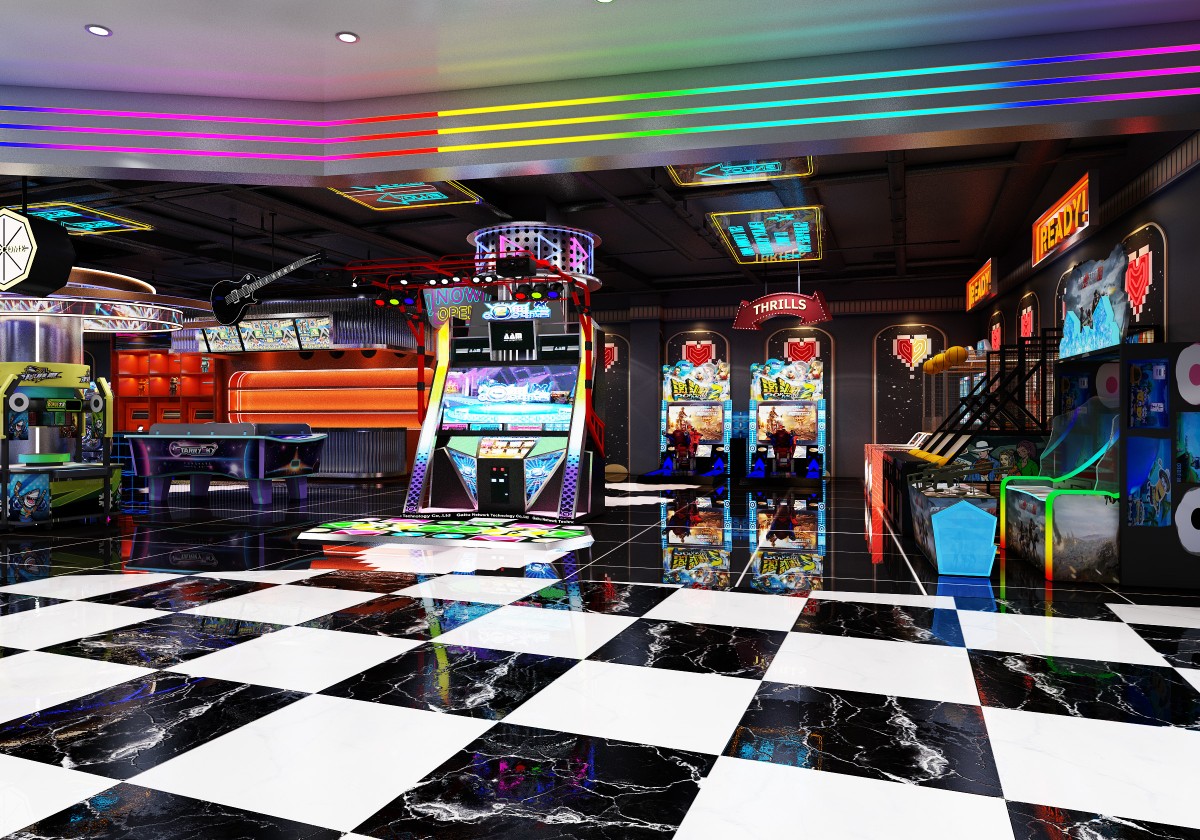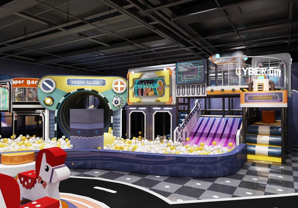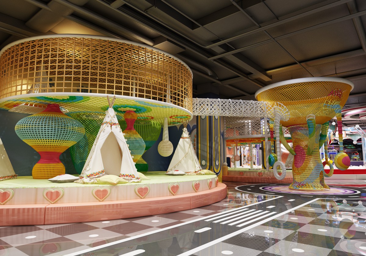 This children’s playland features a versatile multi-zone design with bold pops of pink, yellow and blue set against black-and-white checker accents, creating an exciting yet cozy atmosphere. Highlights include a dedicated arcade area stocked with interactive game machines, rainbow slides flowing into ball pits, a mini construction play set, carousel rides and track car circuits. A comfortable bar-style lounge lets parents relax while keeping an eye on the fun. With smooth traffic flow and activities tailored for ages 0–12, it perfectly blends adventure, interactive challenges and family bonding to ensure every visit is a fresh delight.