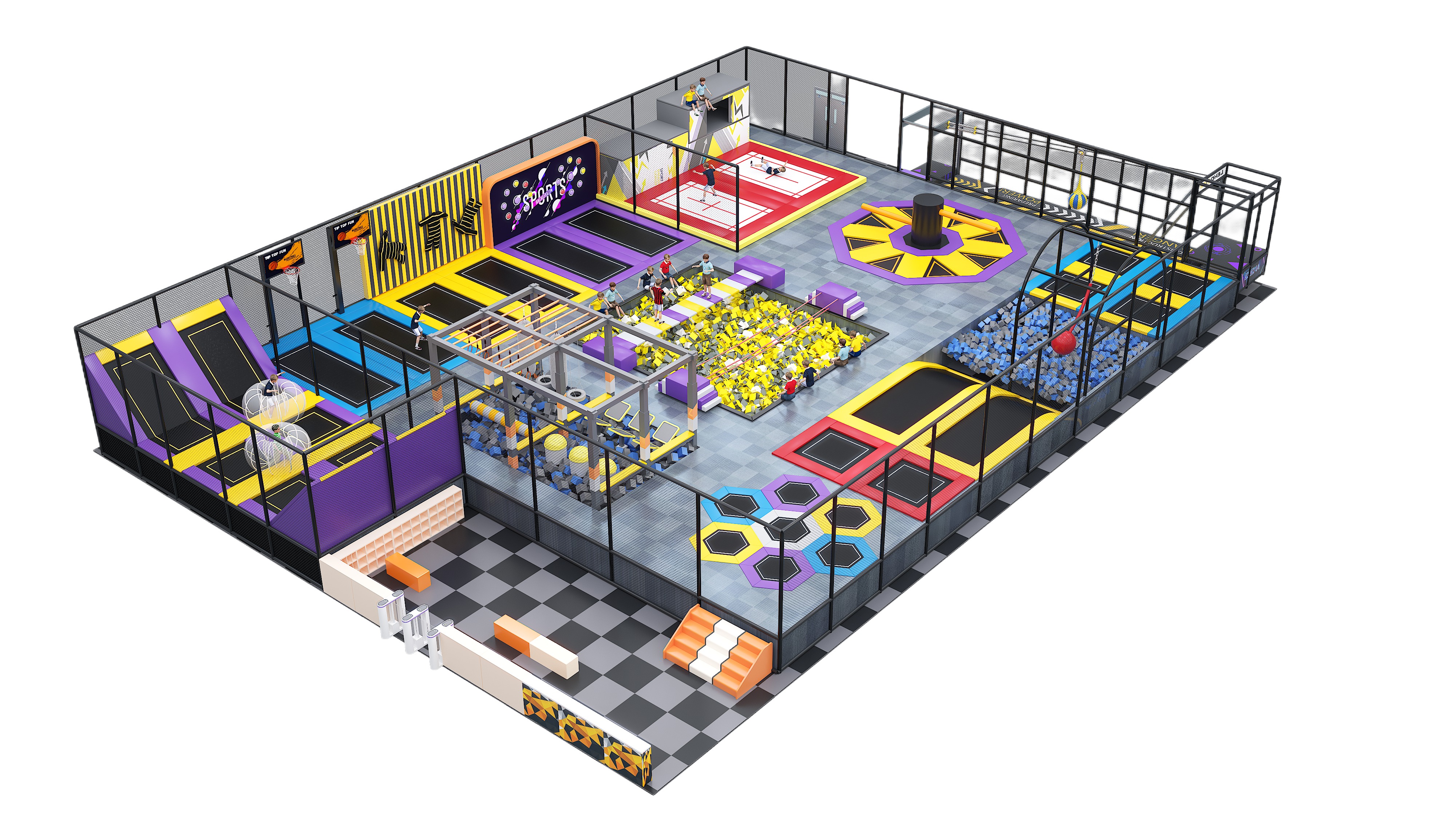 This trampoline park features an open layout that gives visitors a full view of all attractions and their children or companions at a glance. The entire venue can run smoothly with just 2–3 staff members, even during peak seasons. Attractions include bumper ball lanes, basketball trampolines, sticky walls, tap-and-play games, single-plank bridges, ninja courses, professional trampolines, rotating challenge wheels, zip lines, and swing-over foam pits. It also comes equipped with shoe lockers and automatic valves. An exceptionally cost-effective investment!